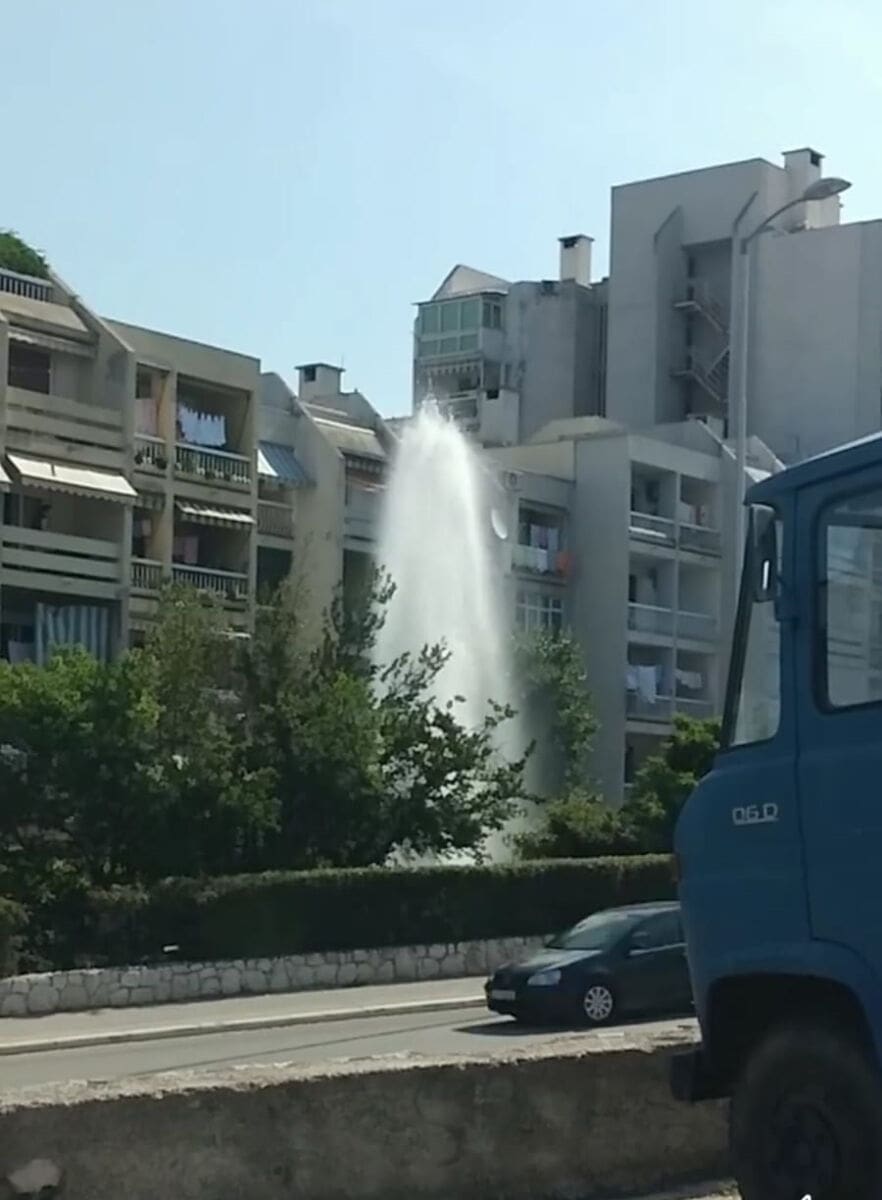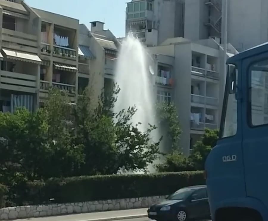 Sve koji su jutros prolazili Velebitskom ulicom zatekao je neobičan prizor. Vodeni mlaz kao iz fontane dosezao je desetak metara u zrak, a sve to se događalo ispred jedne od zgrada u Mosećkoj ulici. Naši čitatelji pretpostavili su kako se radi o puknuću cijevi, ali to su nam demantirali iz splitskog Vodovoda.