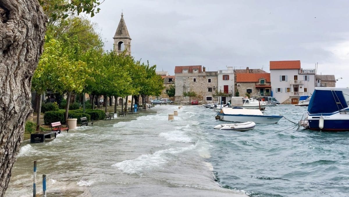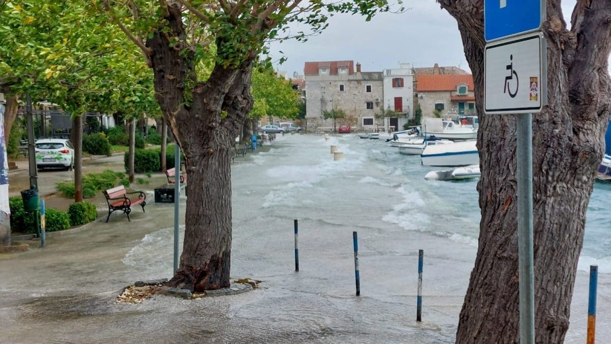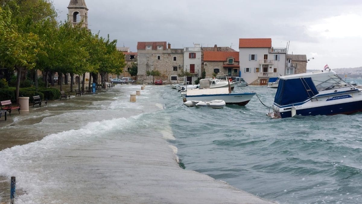 Tijekom cijelog jutra pristižu nam rijetko viđene snimke .Poplavljena je obala u Zadru, Šibeniku, Čiovu, Trogiru, Splitu, Kaštelima, Podstrani, Omišu...
