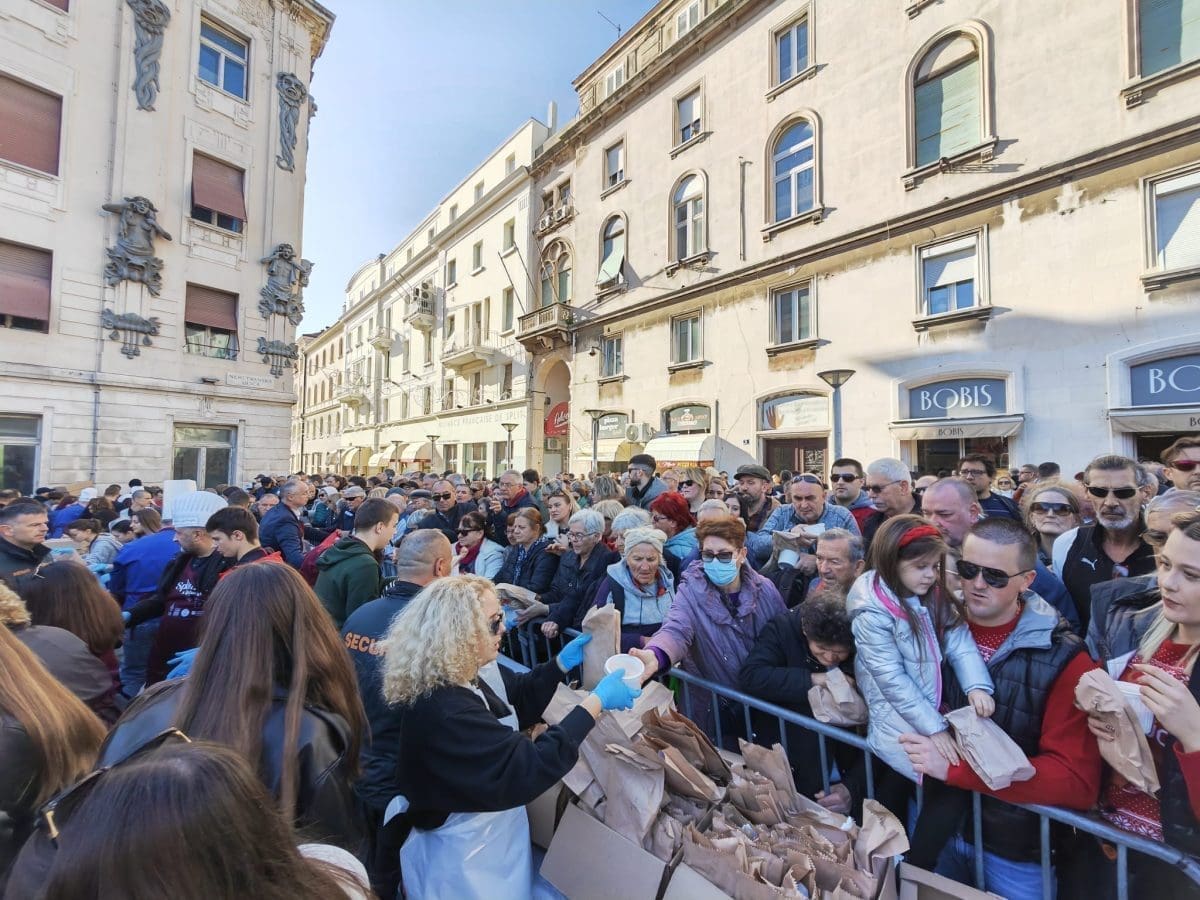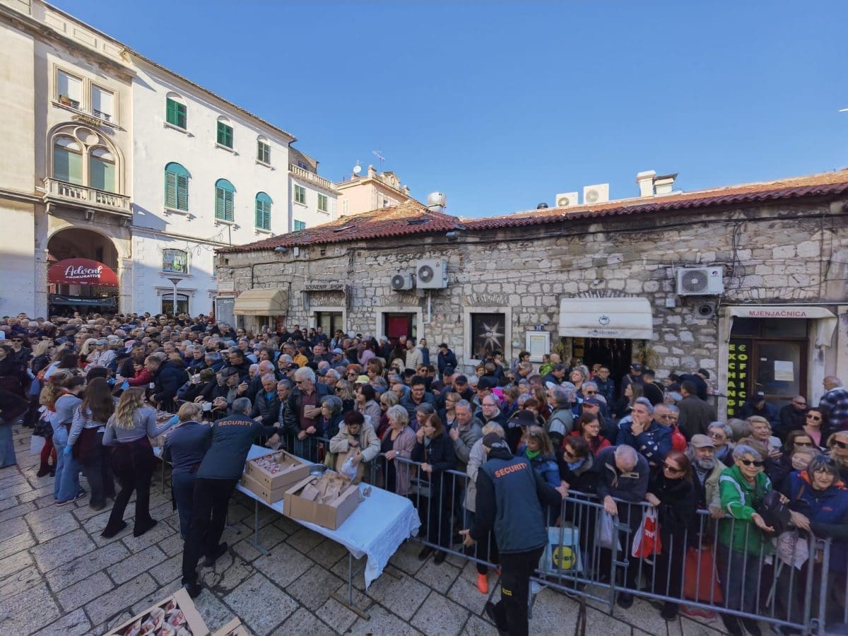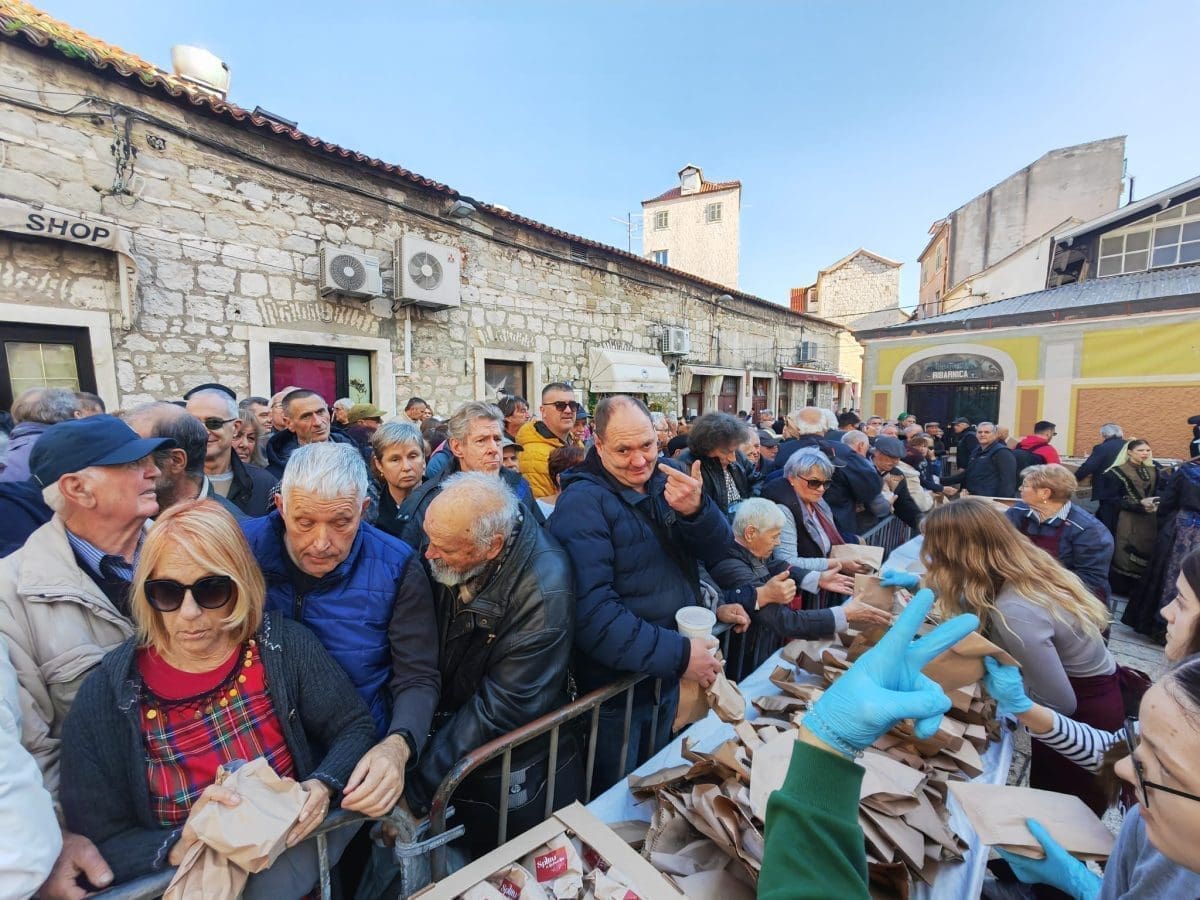 Podjela bakalara započela je u 12 sati na Peškariji. Dijeli ga 70 splitskih volontera, a uz bakalar građani će dobiti i paketić s fritulama koje su ispekli vrijedni DES-ovci.