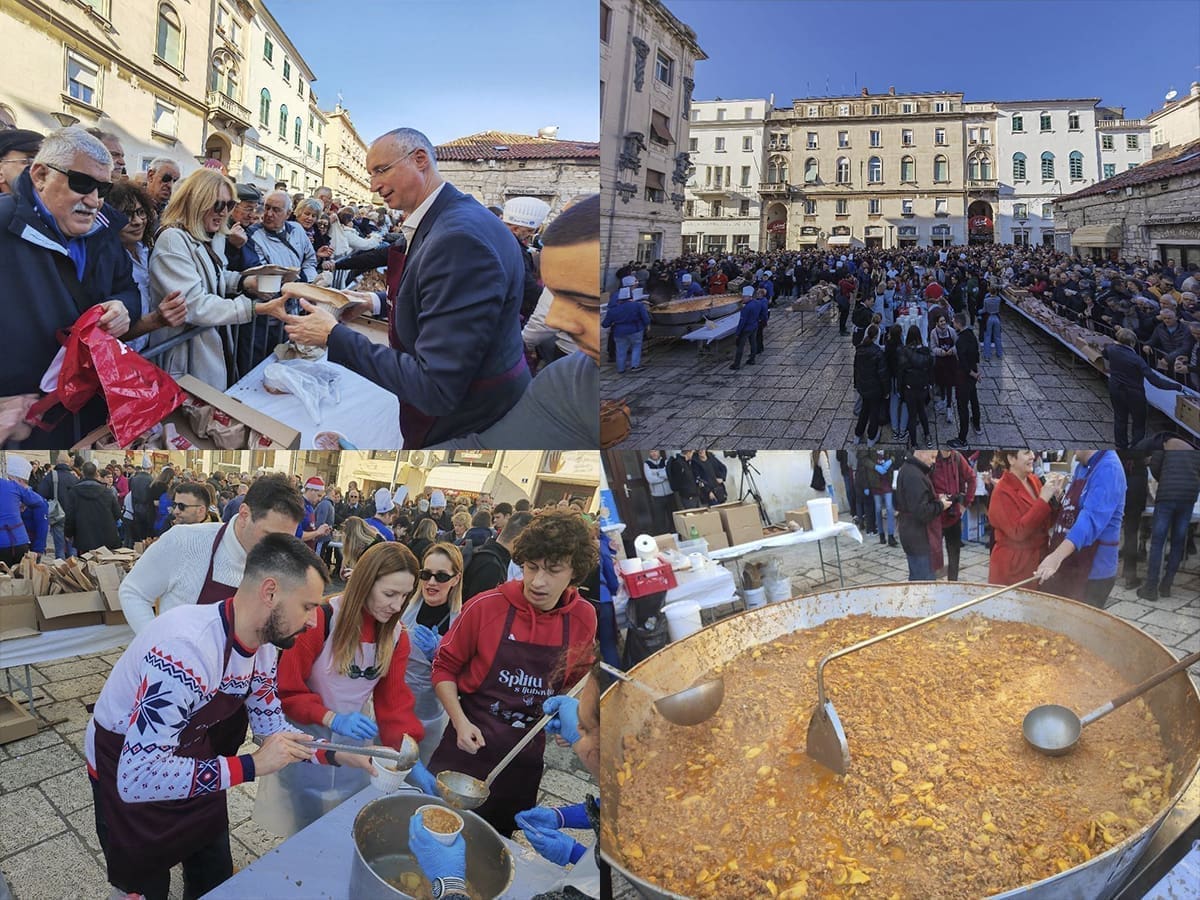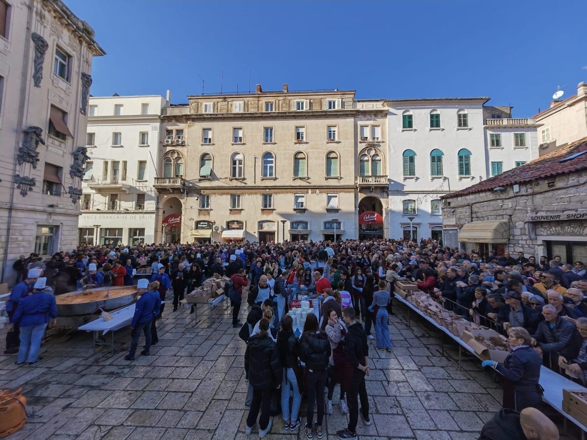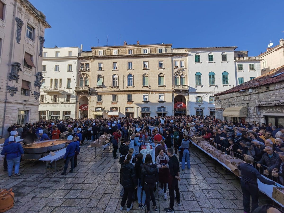 Podjela bakalara započela je u 12 sati na Peškariji. Dijeli ga 70 splitskih volontera, a uz bakalar građani će dobiti i paketić s fritulama koje su ispekli vrijedni DES-ovci.