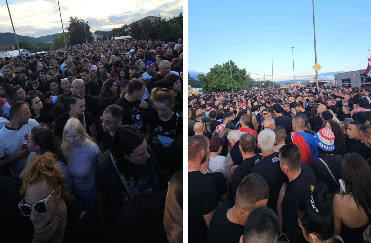 Na svim ulazima prema prostoru koncerta stvaraju se ogromne gužve, a posjetitelji strpljivo čekaju kako bi zauzeli svoja mjesta. Uz pjesmu, zastave i domoljubna obilježja, atmosfera je uzavrela, no raspoloženje je i dalje pozitivno i uzbuđeno.