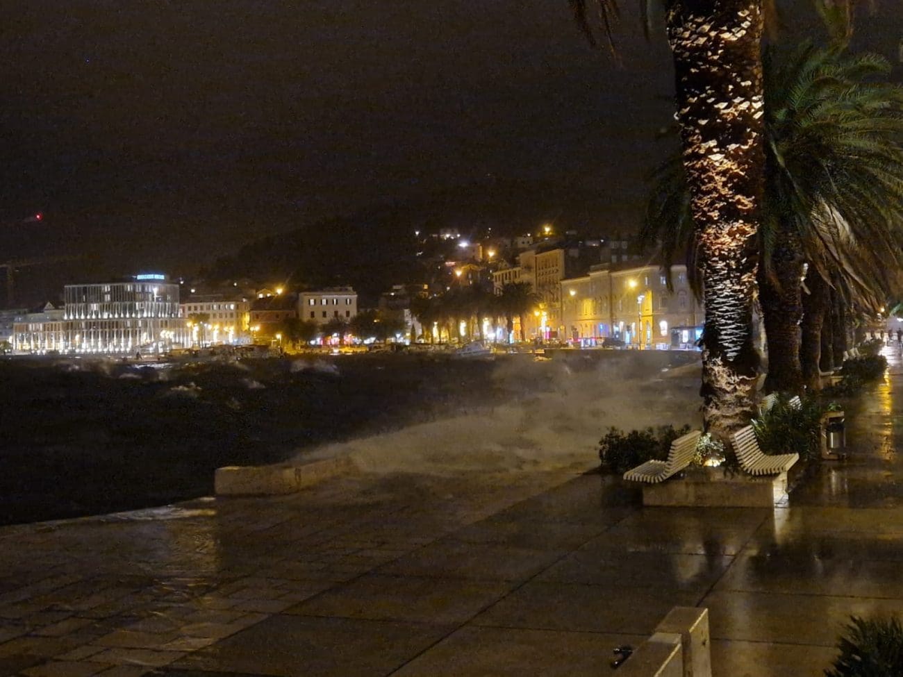 Split i srednja Dalmacija u utorak su bili pod snažnim utjecajem hladne fronte koja je donijela olujne udare vjetra i iznimno obilnu kišu. Kulminacija vjetra na splitskom području zabilježena je oko 18 sati, neposredno prije prolaska fronte, kada su udari na moru dosezali gotovo 100 kilometara na sat. Na DHMZ-ovoj postaji na Marjanu prosječna brzina vjetra u jednom je trenutku narasla do 20 metara u sekundi.