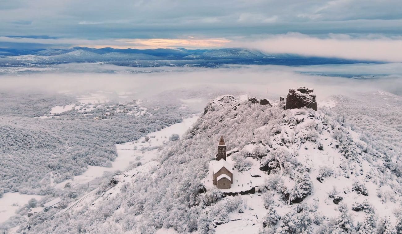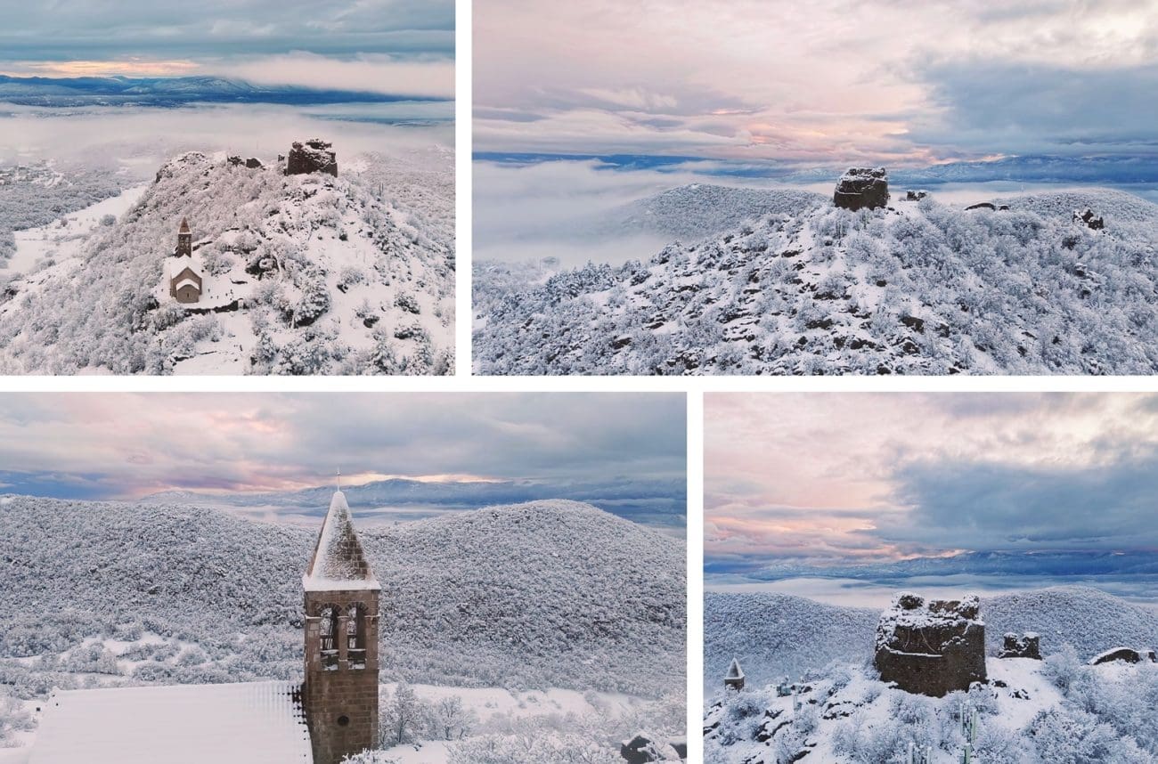 Snimka prikazuje krajolik posut svježim snježnim pokrivačem, s brdom na kojem dominiraju ostaci utvrde te sakralni objekt u podnožju stijene. Niska naoblaka prelijeva se preko doline, stvarajući dojam da je lokalitet odvojen od svakodnevice i izdignut u vlastiti, gotovo nestvaran svijet.