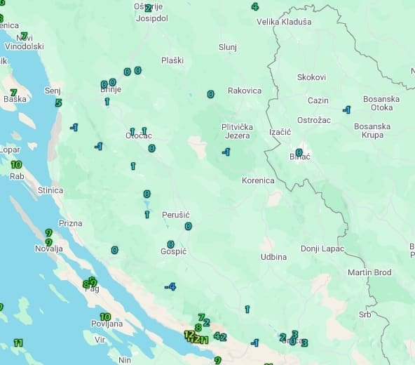 Prema podacima automatskih meteoroloških postaja Pljusak.com, na većem dijelu područja temperature su između -1 i +1°C.