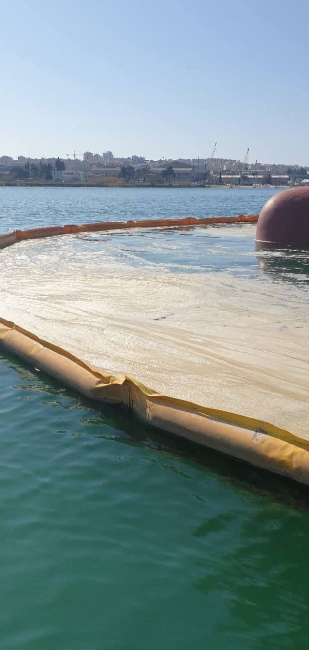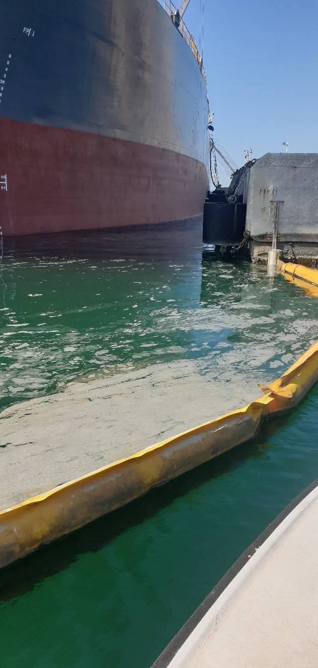 Na fotografijama se vidi veliki tanker privezan uz obalu, a na površini mora postavljene su plutajuće zaštitne brane kakve se koriste tijekom operacija u lukama u kojima se manipulira naftnim derivatima.