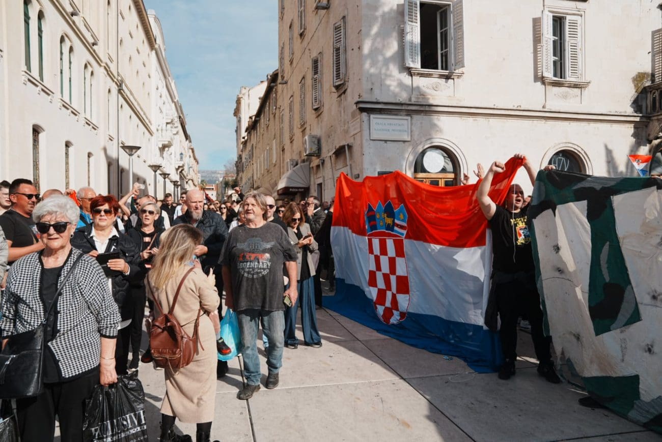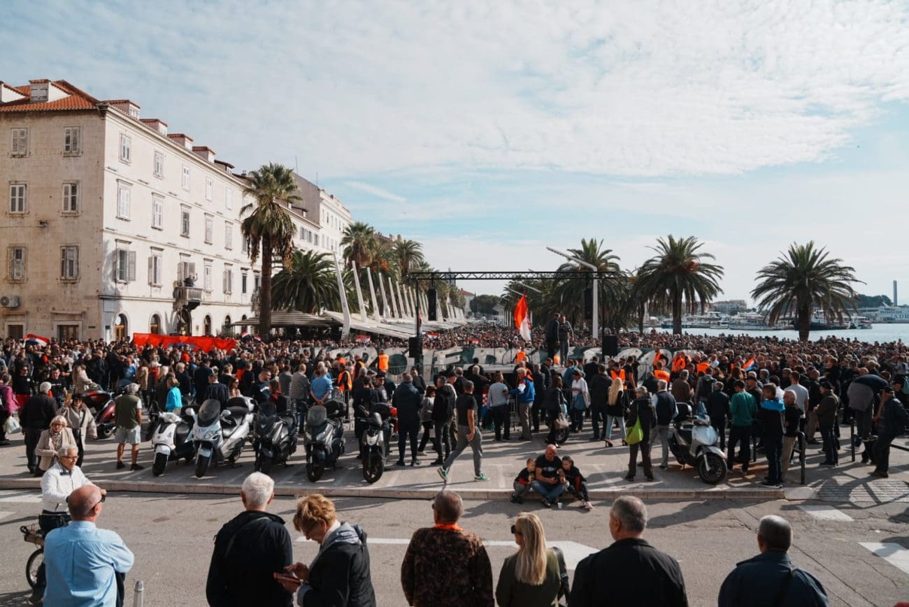 Početak prosvjeda na splitskoj Rivi kasni, a spiker s bine poziva na "dostojanstvo i domoljublje." Prisutno je već nekoliko tisuća ljudi, a još ih dolazi u centar Splita.