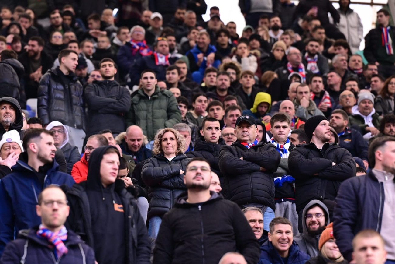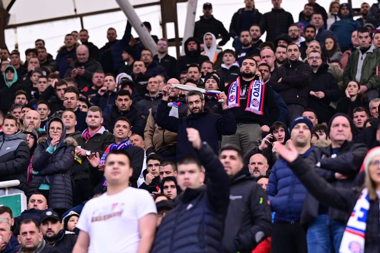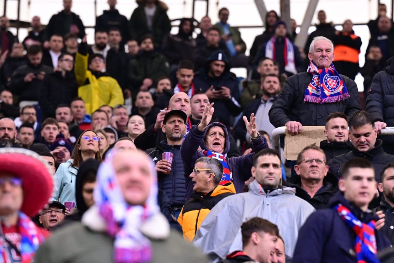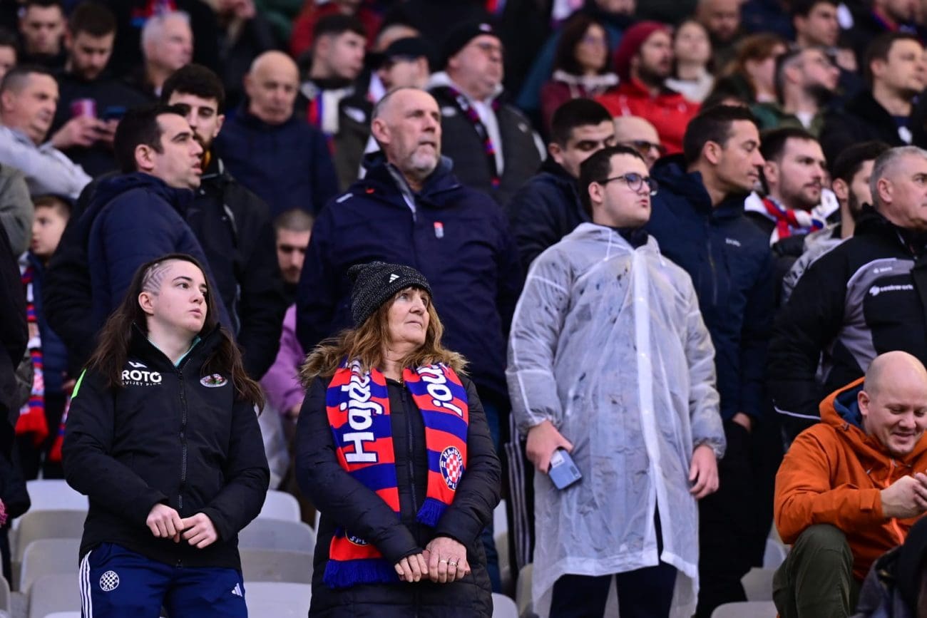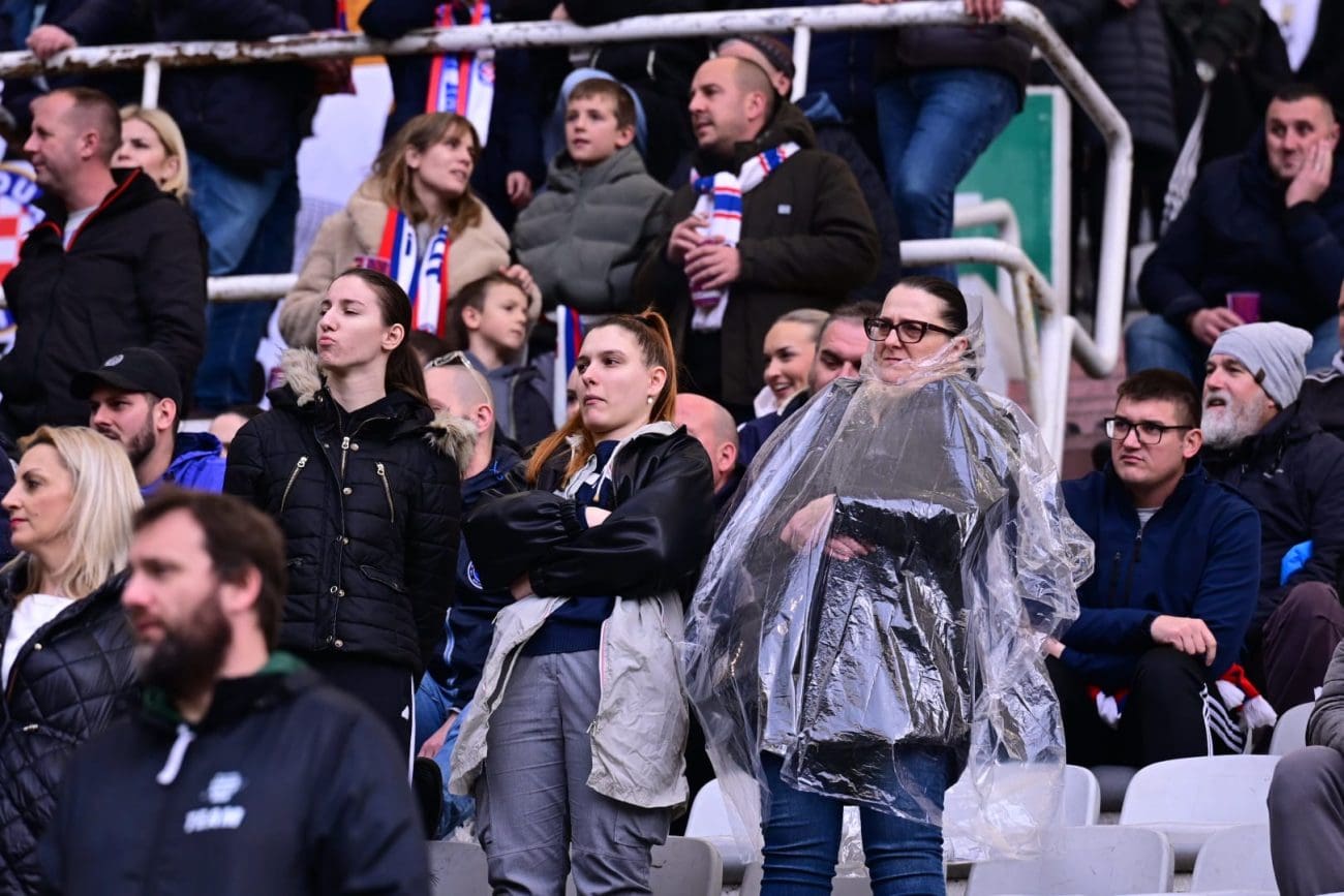 Vremenske prilike snažno utječu i na atmosferu na tribinama. Unatoč solidnom broju gledatelja koji su, bez obzira na jugo i kišu, došli na stadion, raspoloženje je vidljivo loše.