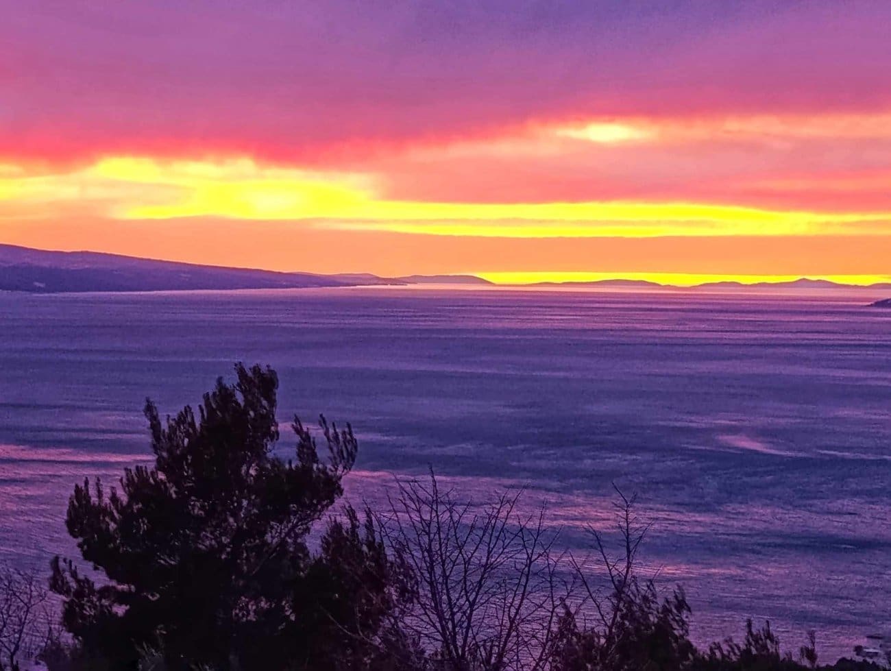 Današnji zalazak sunca nikoga nije ostavio ravnodušnim. Nebo je odjednom bilo obojano ružičastim nijansama, što je stvorilo dojmljiv prizor, pogotovo pogled na Mosor koji je bio osvijetljen ružičastom svjetlošću.