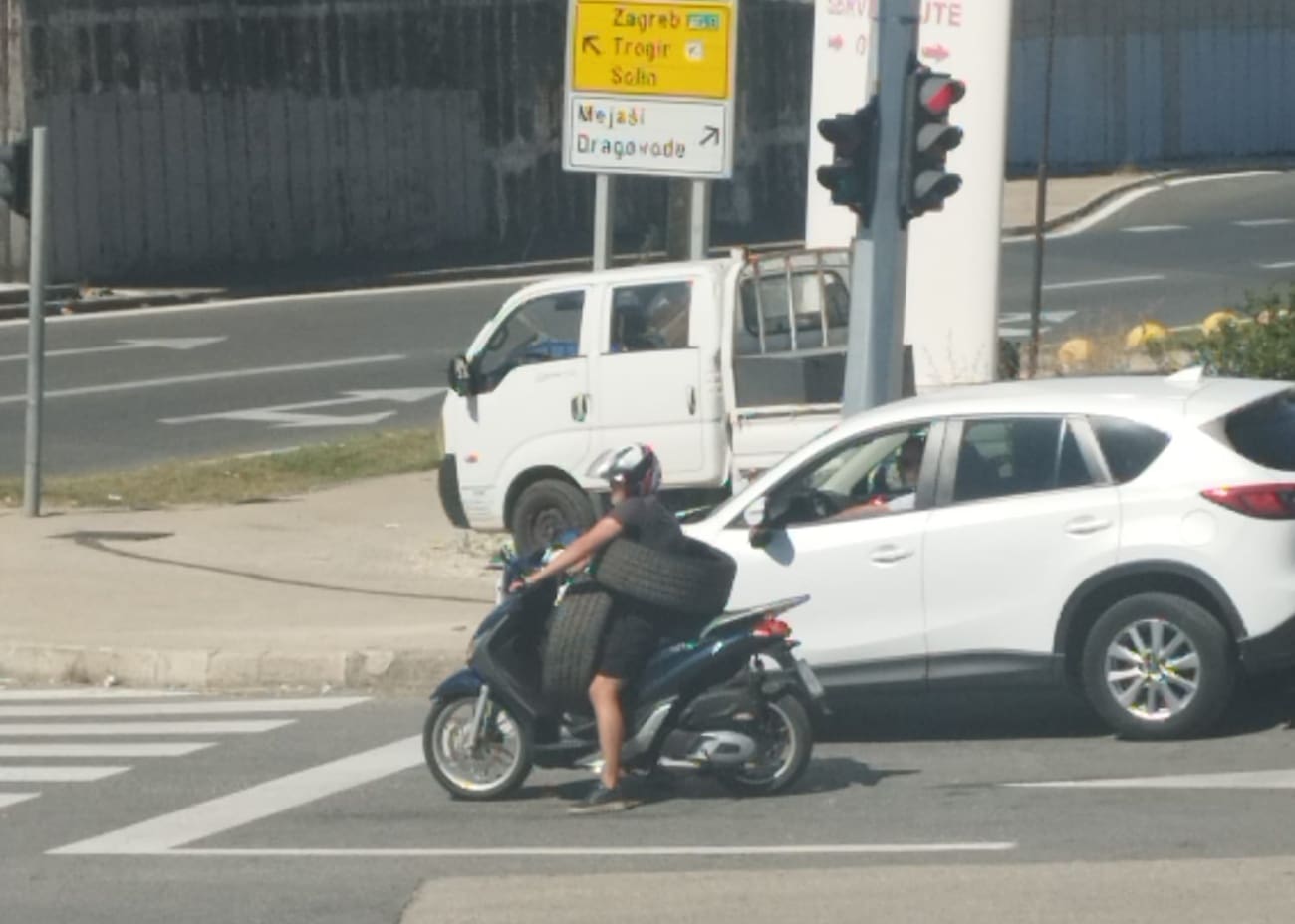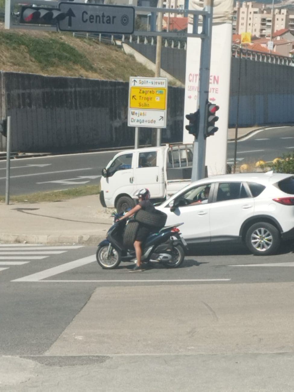 I danas imamo sliku dana. U Splitu je naš čitatelj fotografirao prizor kakav viđamo eventualno u pijanim snovima - netko nije imao izbora i dvije gume vozi na motornom vozilu za koje očito... Nema prostora.