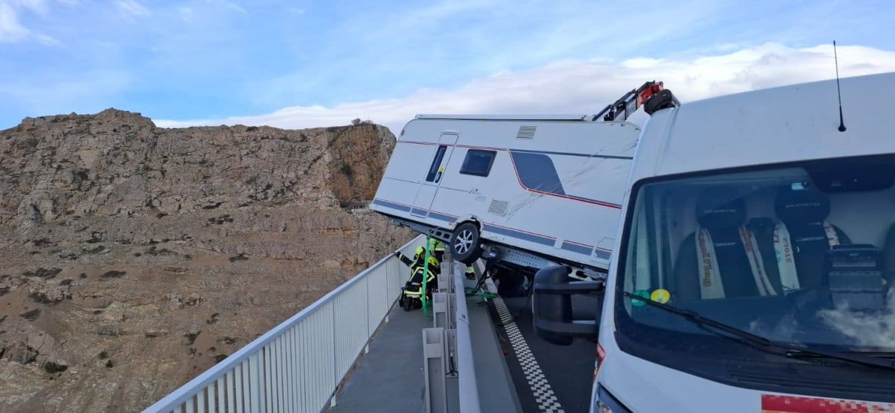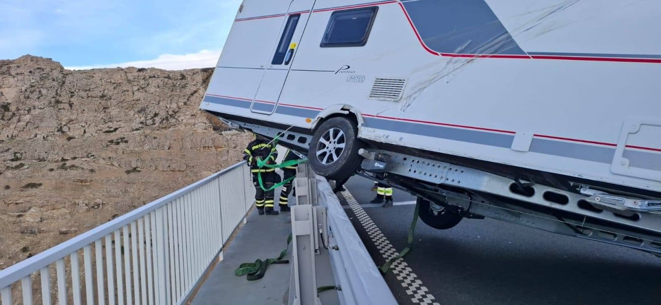Javna vatrogasna postojba grada Krka tijekom jučerašnjeg dana u 14:30 sati zaprimila je dojavu o kamp-prikolici koja je uslijed jakog vjetra ostala visjeti preko ograde na Krčkom mostu.