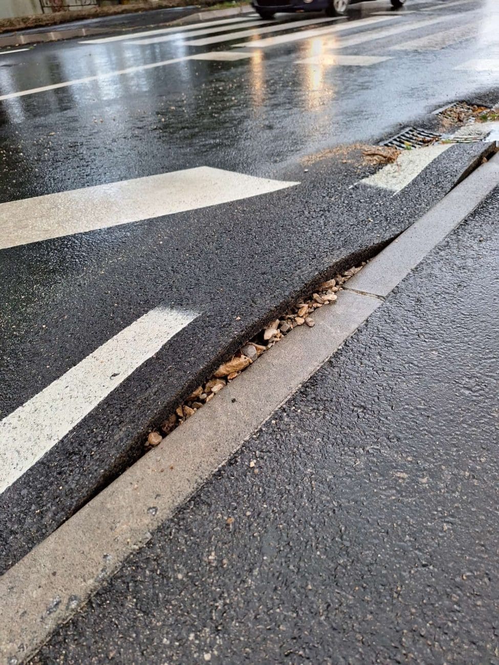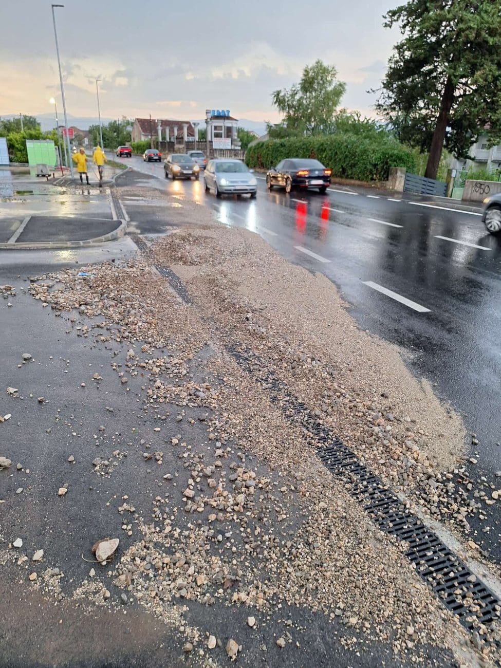 Večerašnje nevrijeme koje je pogodilo obalu i dio Dalmatinske zagore ostavilo je vidljive posljedice na cestu u Brnazama, na novouređenom ulazu u Sinj.