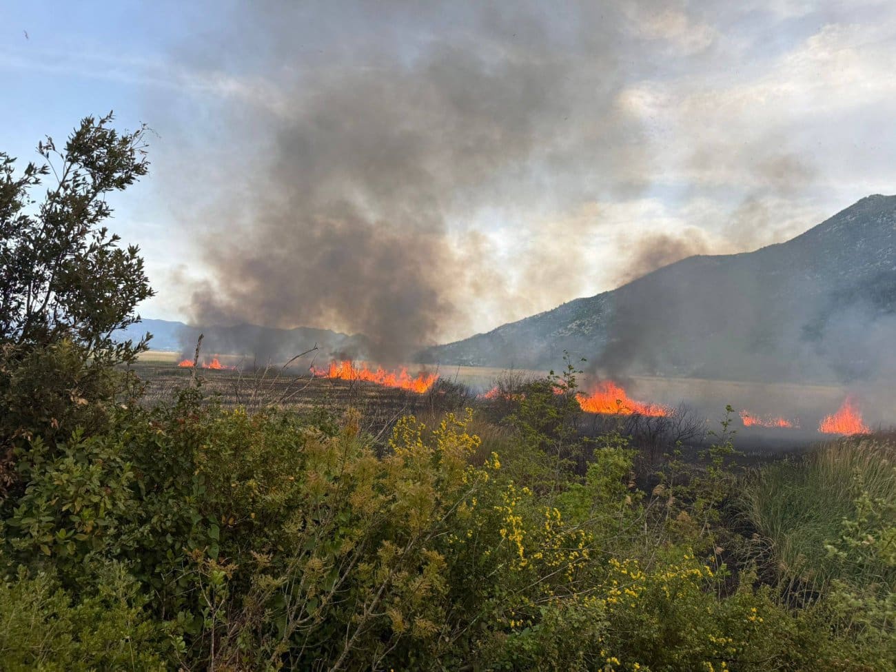 Požar je danas poslijepodne planuo na području Kule Norinske, u dolini Neretve, a prema fotografijama vatra je zahvatila nisko raslinje, trsku i suhu vegetaciju na otvorenom prostoru. Gusti dim nadvio se nad cijelim područjem, dok su se plameni jezici širili uz rubove močvarnog i obraslog terena, nošeni vjetrom i suhim uvjetima.