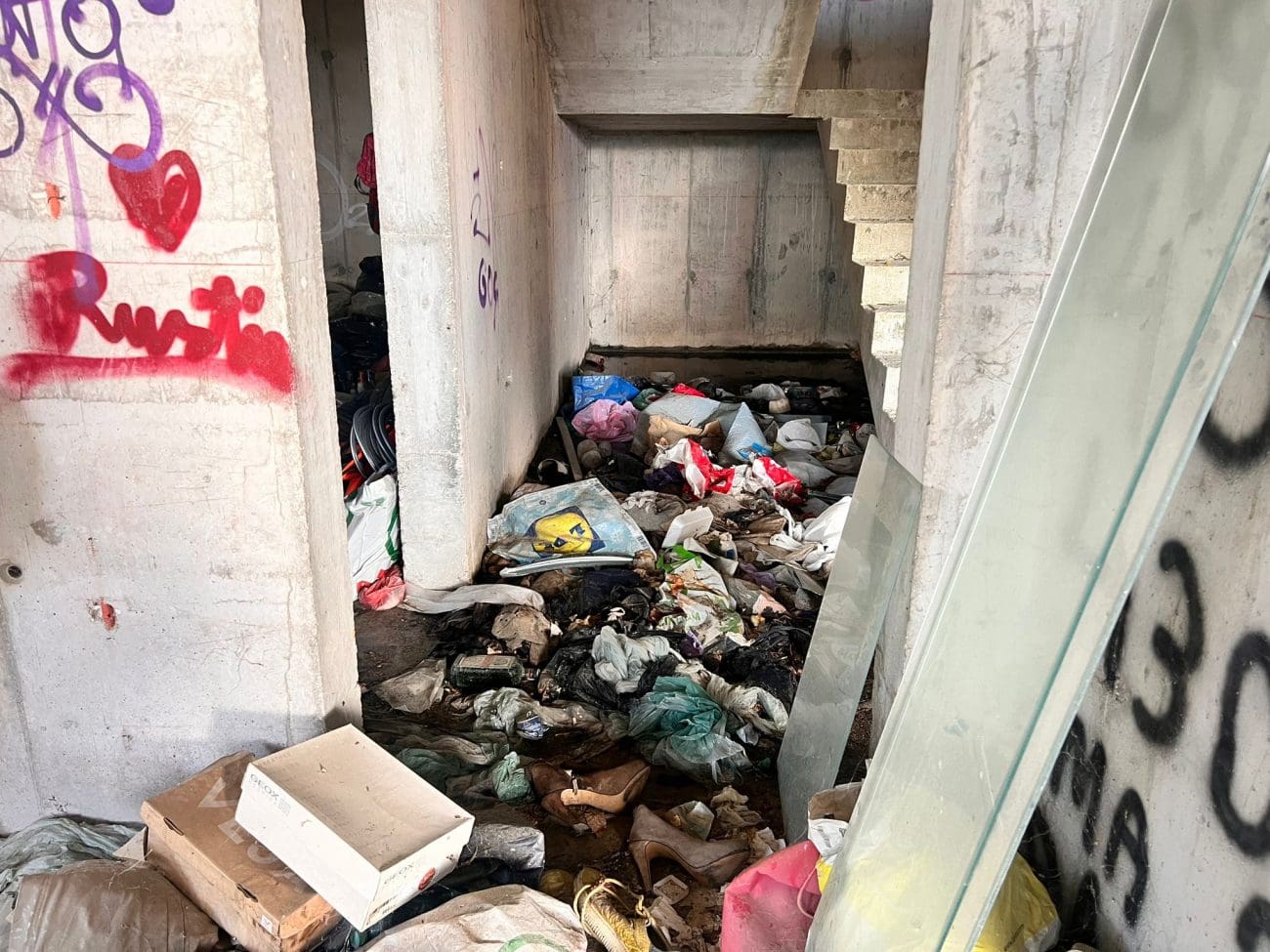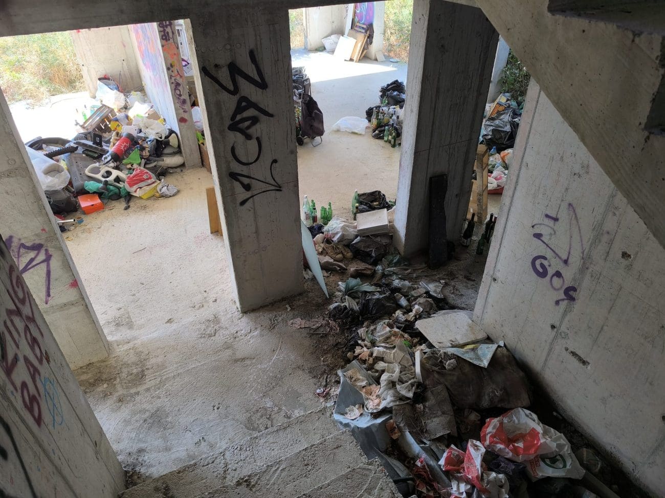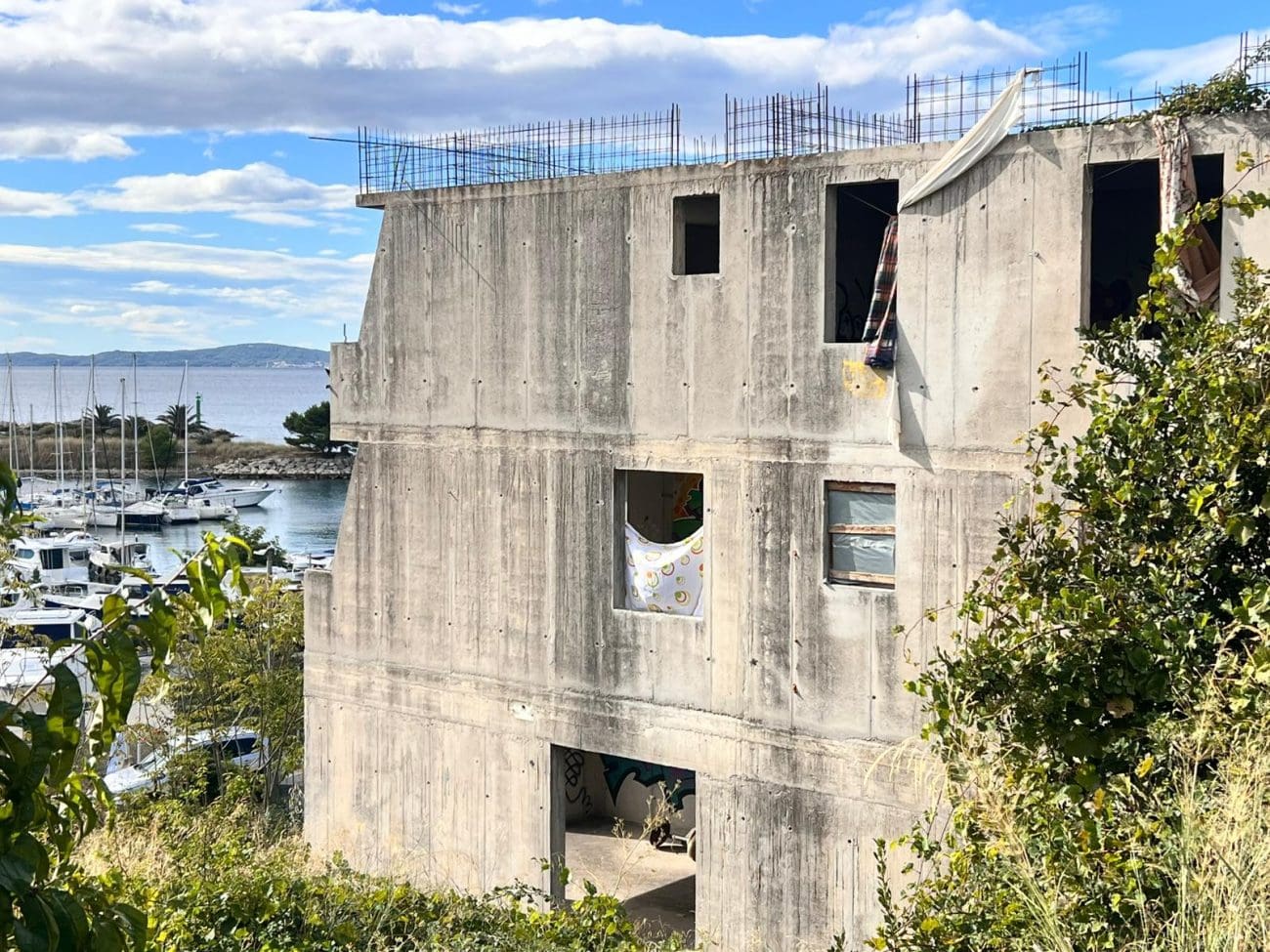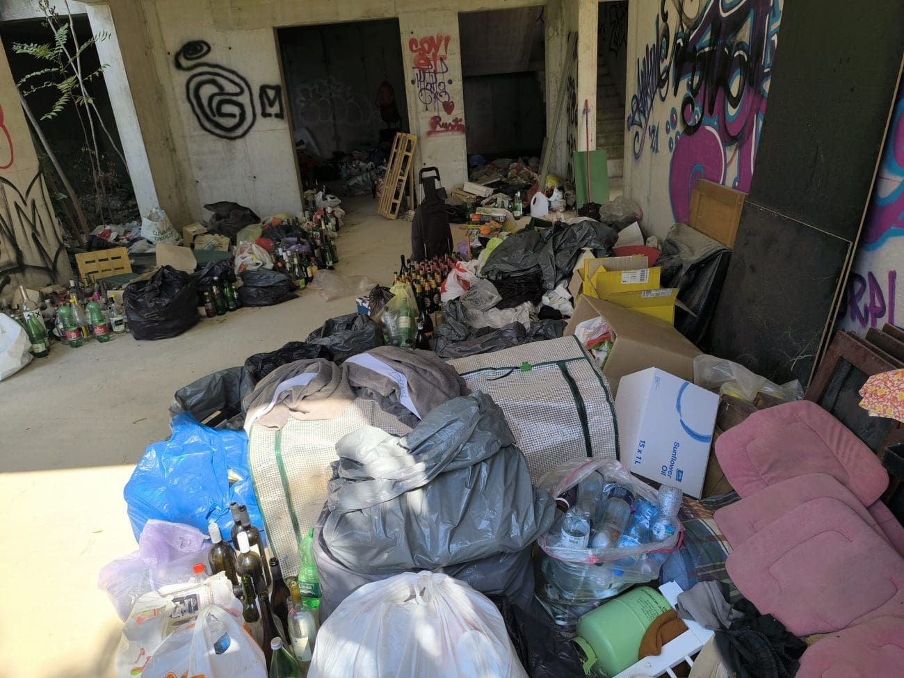 Prostor koji je očito trebao postati stambeni kompleks, danas je divlje odlagalište otpada i utočište beskućnika, a prizori koje smo vidjeli u jednoj od zgrada su nadrealni. Prvi red do mora u Splitu - ruševine u kojima spavaju beskućnici i ovisnici u stotinama kilograma smeća koje donose.