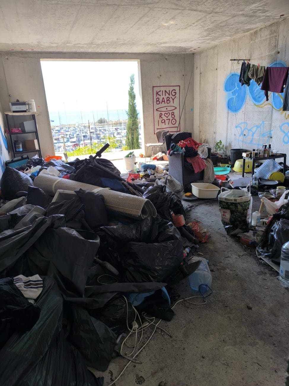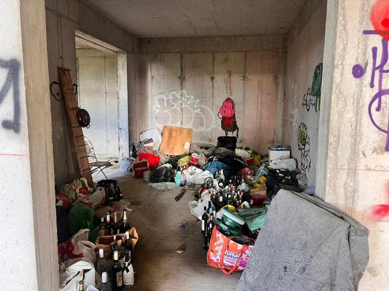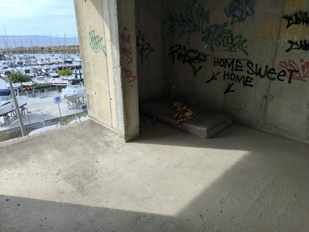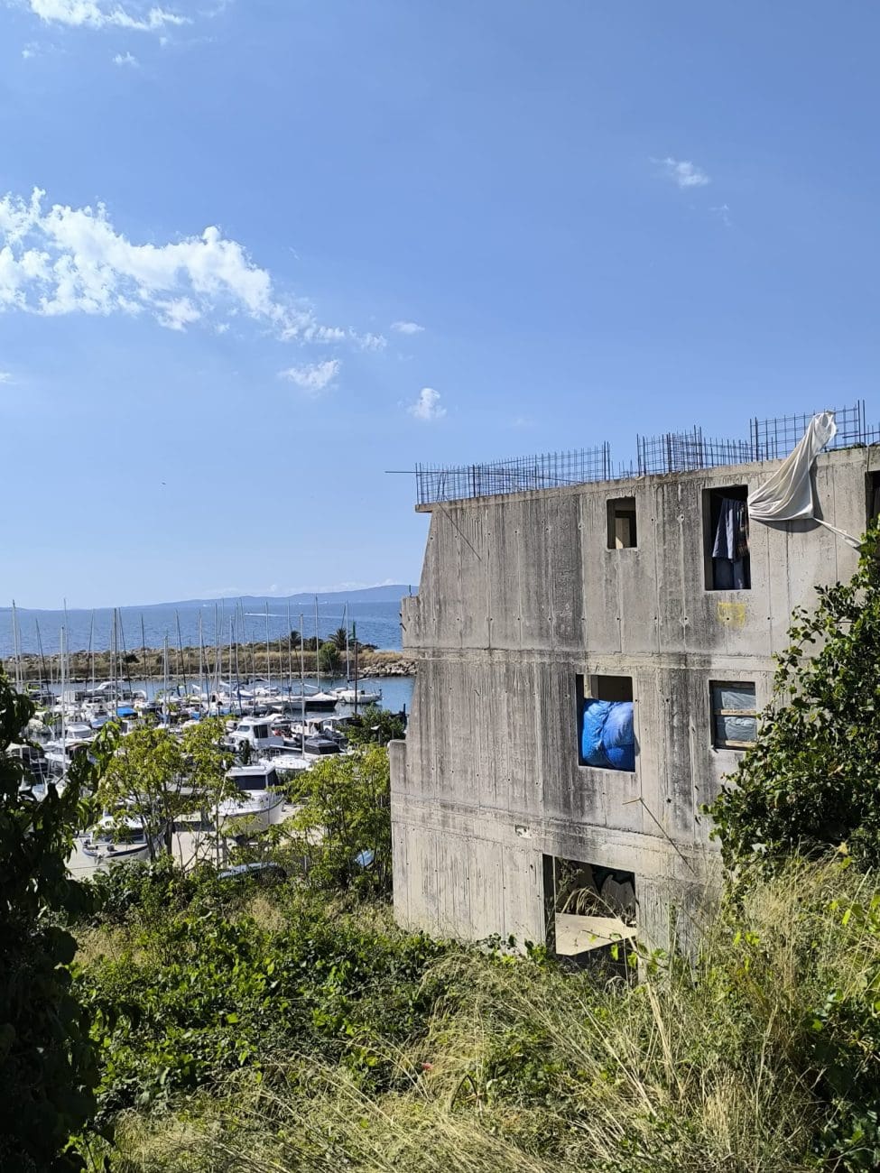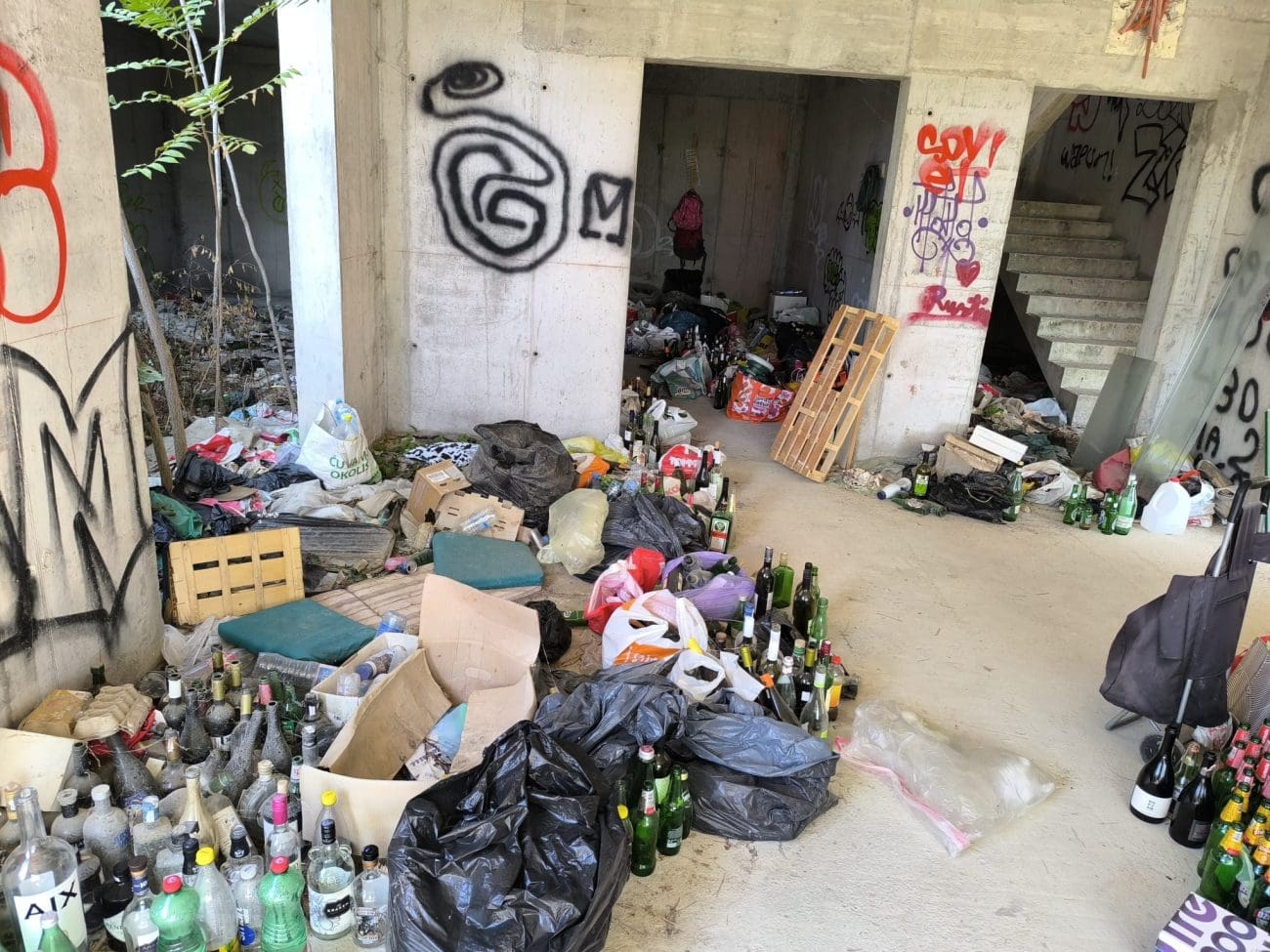 Prostor koji je očito trebao postati stambeni kompleks, danas je divlje odlagalište otpada i utočište beskućnika, a prizori koje smo vidjeli u jednoj od zgrada su nadrealni. Prvi red do mora u Splitu - ruševine u kojima spavaju beskućnici i ovisnici u stotinama kilograma smeća koje donose.
