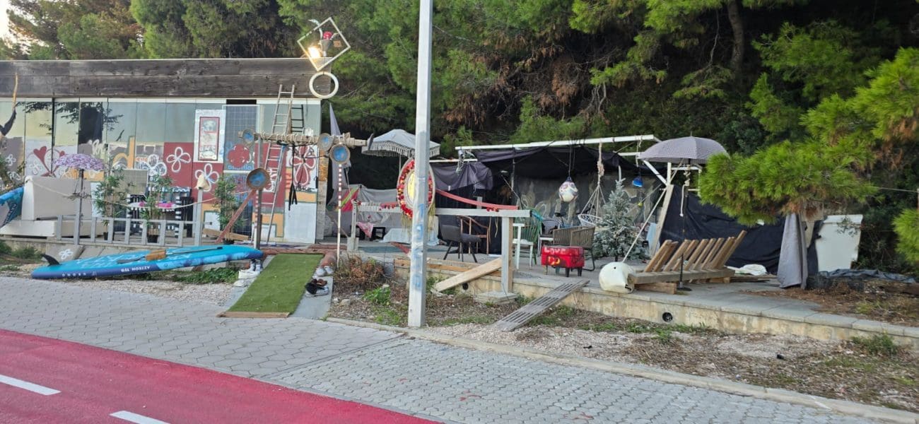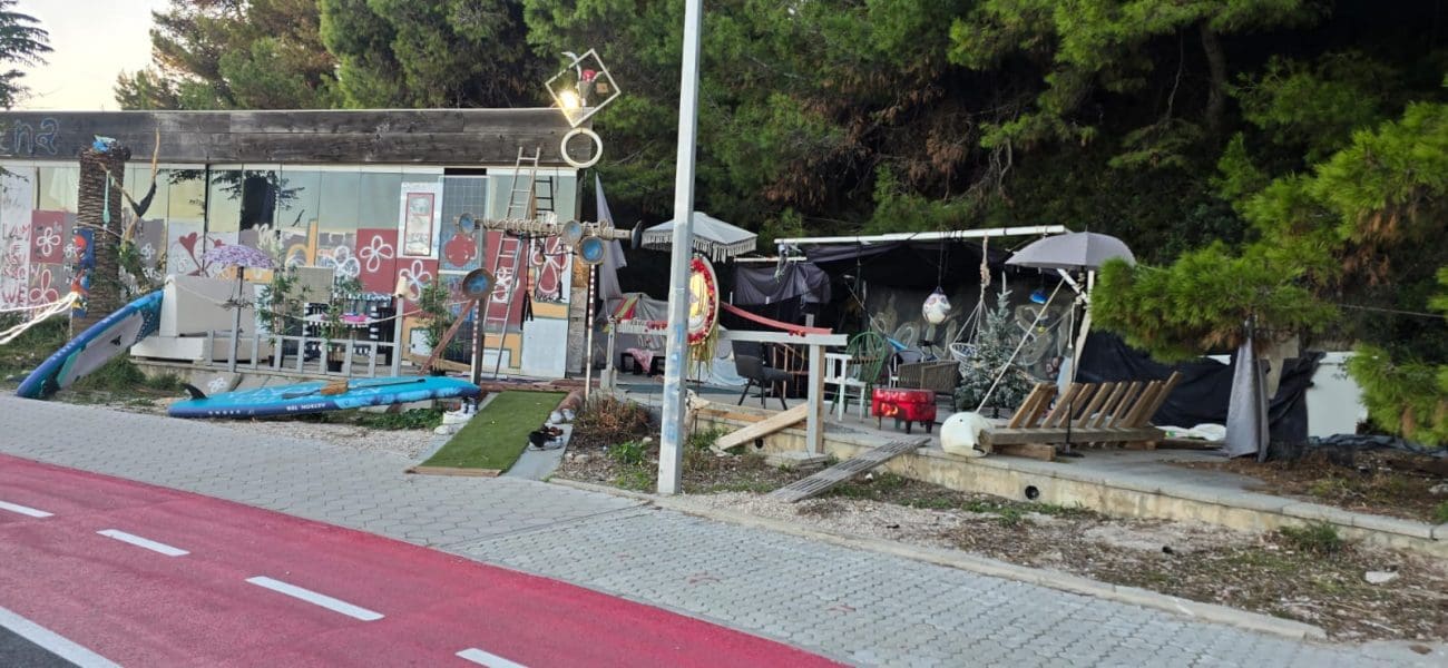 Prostor nekadašnjeg ugostiteljskog objekta Cox u uvali Trstenik pretvoren je u improvizirano dvorište prepuno starih stolica, suncobrana, dasaka, odbačenih rekvizita i raznobojnih dekoracija. Mjesto koje je nekad bilo uređeni lokal uz šetnicu danas više nalikuje na spoj skladišta, radionice i privremenog kampa.
