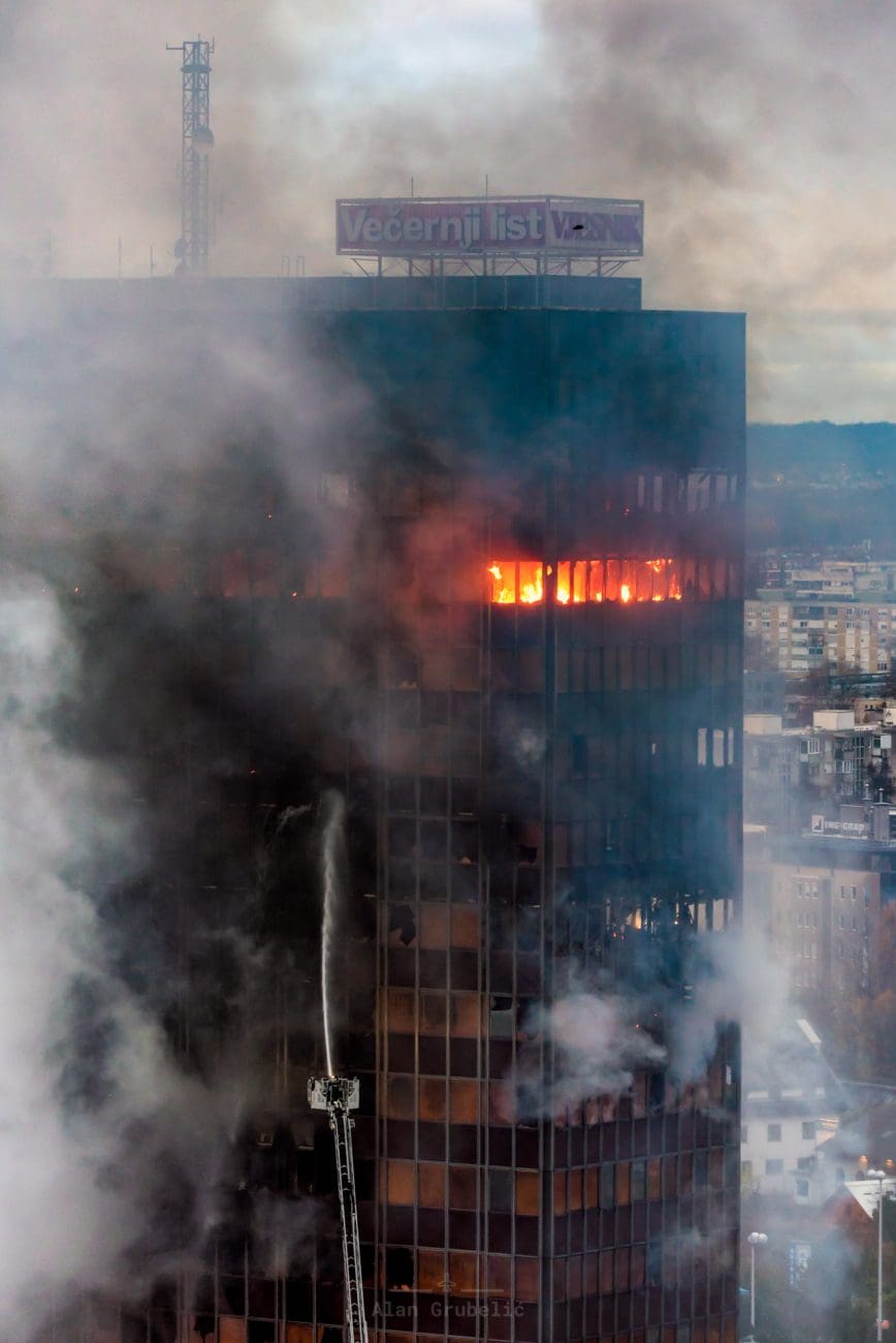 Požar koji je sinoć malo prije ponoći izbio u Vjesnikovom neboderu na Slavonskoj aveniji i dalje gori. Jutros se i dalje urušavaju dijelovi pročelja, a zagrebački vatrogasci, koji su na terenu cijelu noć, procjenjuju da će gašenje potrajati cijeli dan. Na intervenciji sudjeluju 93 vatrogasca s ukupno 30 vozila.