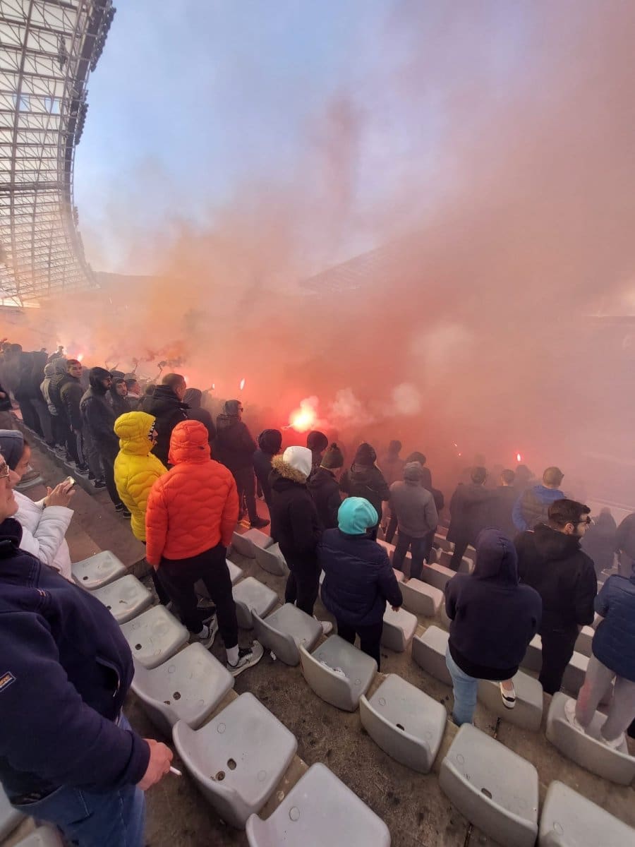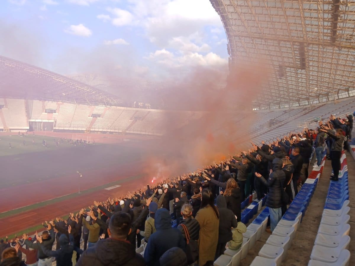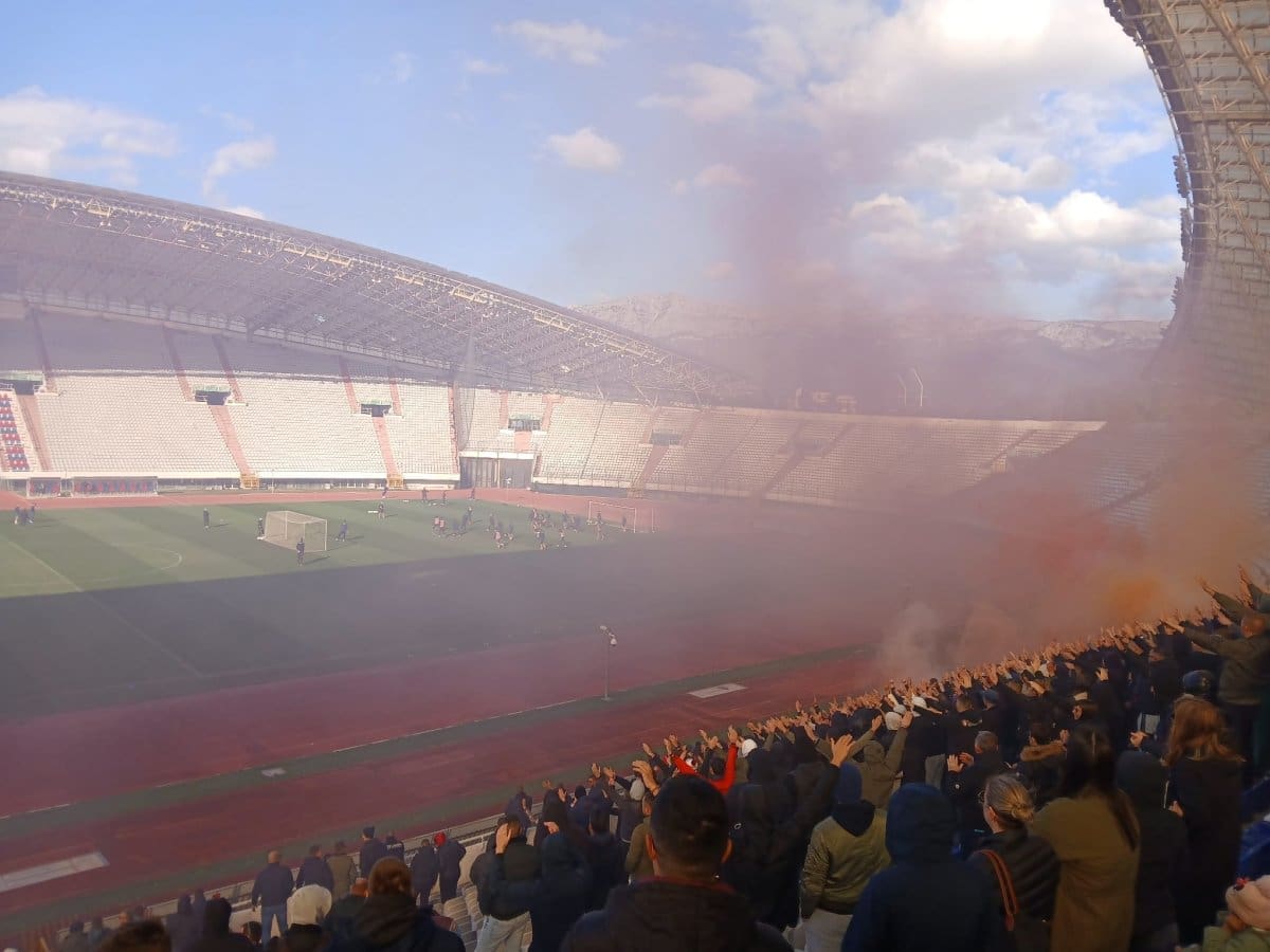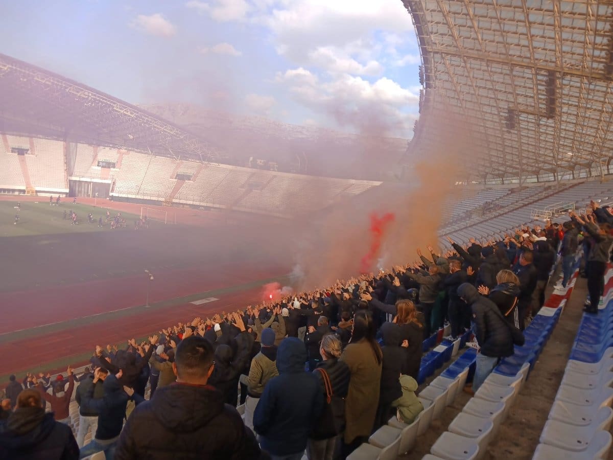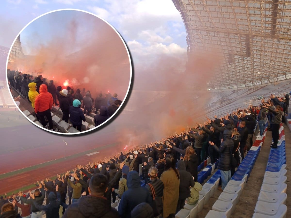 Stotine ljudi napunile su tribine, a moglo se čuti "Hoćemo pobjedu", "Zgazi purgere", uz bakljadu i druge navijačke pjesme.