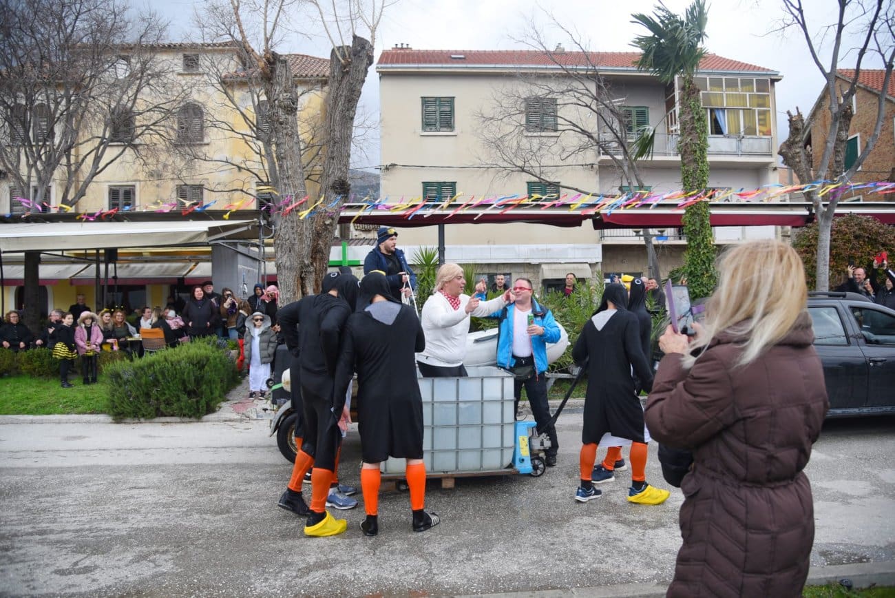 Posebnu pozornost izazvala je točka pod nazivom „Kolinda i pingvini“, koja je izazvala smijeh i glasne reakcije publike. U duhu karnevalske satire, sudionici su se poigrali aktualnim i prepoznatljivim motivima te ih smjestili u lokalni kontekst. Tako je „Kolinda“, umjesto u ledeno more Antarktike, simbolično „zaronila“ u kaštelansko more, okružena pingvinima, naravno, u sućuraškoj verziji priče.
