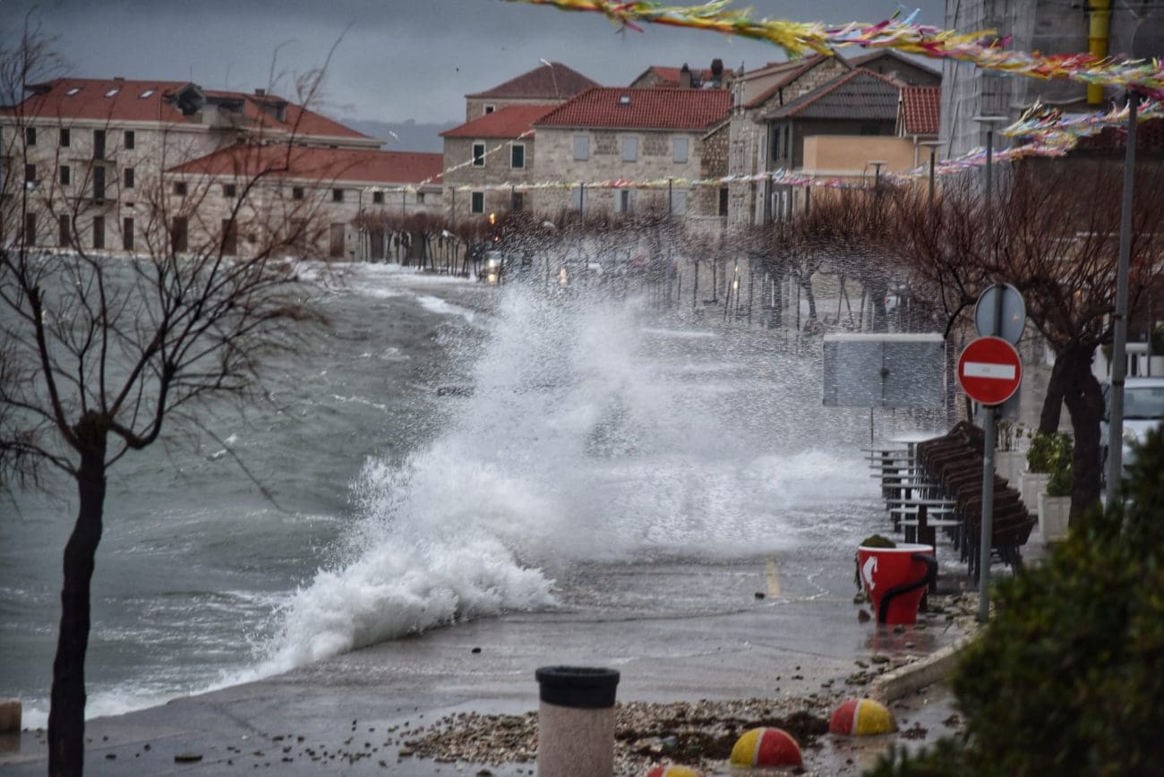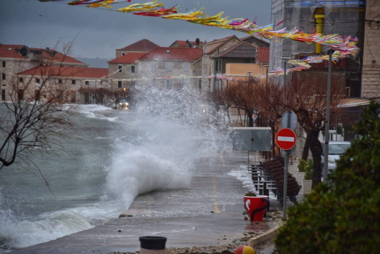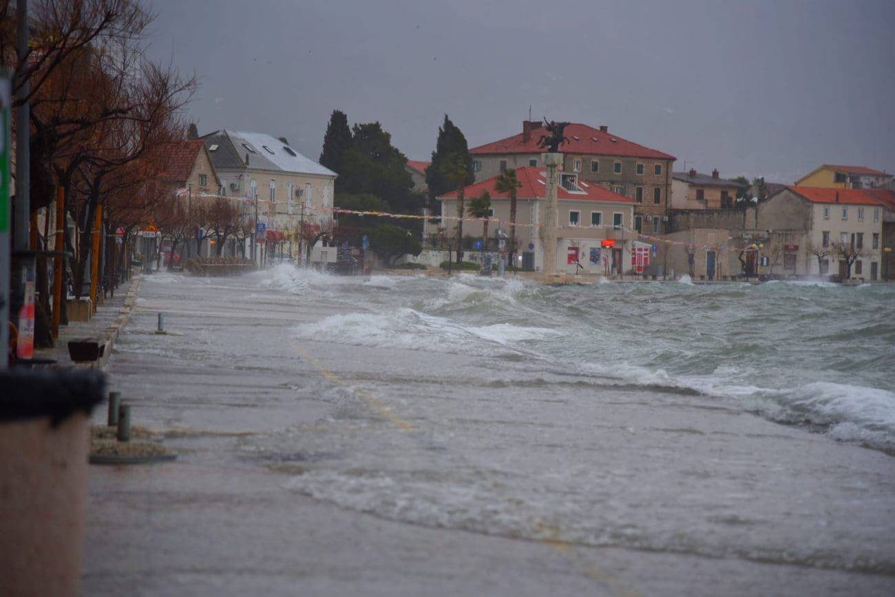 Naime, more na donjokaštelanskoj rivi se redovno izlije te dođe do kućnih pragova od čega strepe oni koji žive prvi red do mora. U pripremi su vreće s pijeskom, daske i razna druga pomagala koja sprečavaju prodor mora do kuća. U portu u Kaštel Novom more se već polako izlilo na cestu, a duž štafilićke rive zatekli smo dosta kamenja koje je more izbacilo.