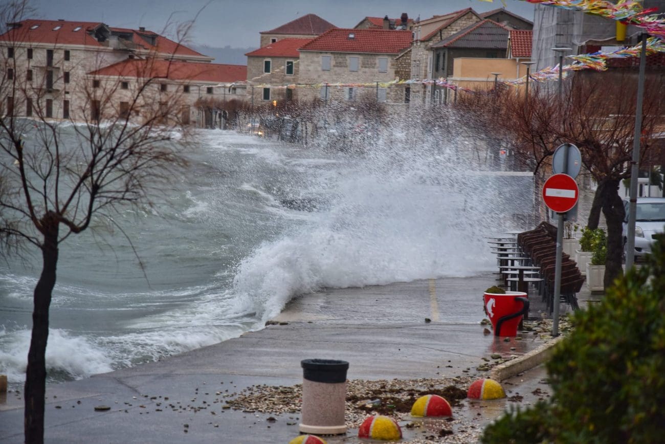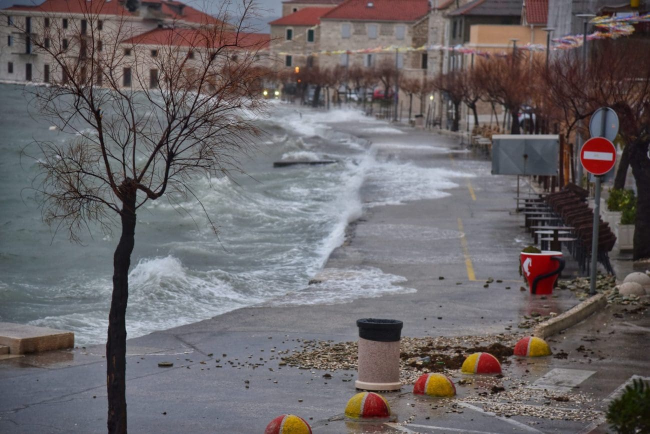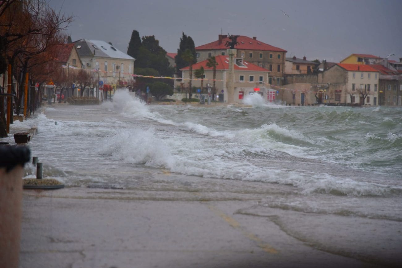 Naime, more na donjokaštelanskoj rivi se redovno izlije te dođe do kućnih pragova od čega strepe oni koji žive prvi red do mora. U pripremi su vreće s pijeskom, daske i razna druga pomagala koja sprečavaju prodor mora do kuća. U portu u Kaštel Novom more se već polako izlilo na cestu, a duž štafilićke rive zatekli smo dosta kamenja koje je more izbacilo.