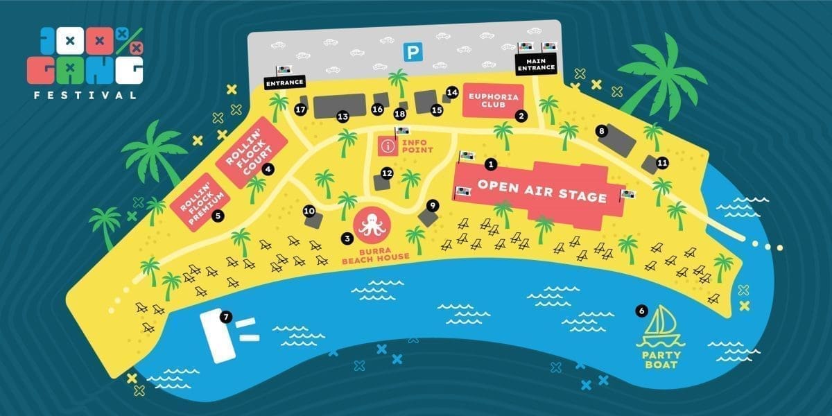 Prvi open air festival će imati glavnu binu duž cijele plaže, druga bina je u Euphoria clubu, dok je treća u sklopu Burra beach housea. Na slici možete vidjeti i mapu festivala: