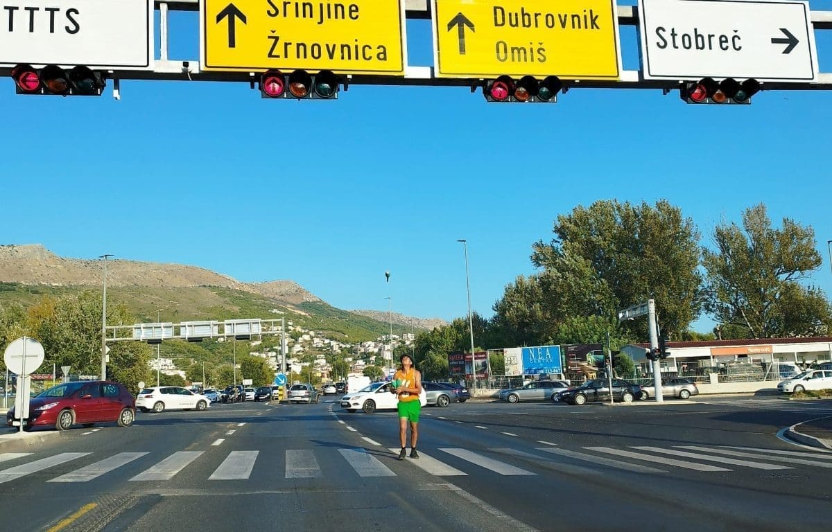 Na velikoj raskrnici prema Stobreču ovih dana operira žongler. Nepoznati muškarac čeka da se upali crveno svjetlo vozačima, a zatim izlazi na pješački prijelaz i "zabavlja" vozače koji čekaju da se upali zeleno svjetlo.