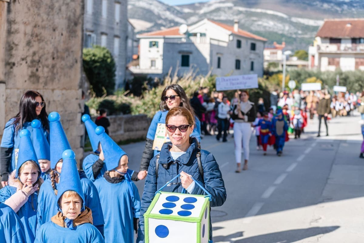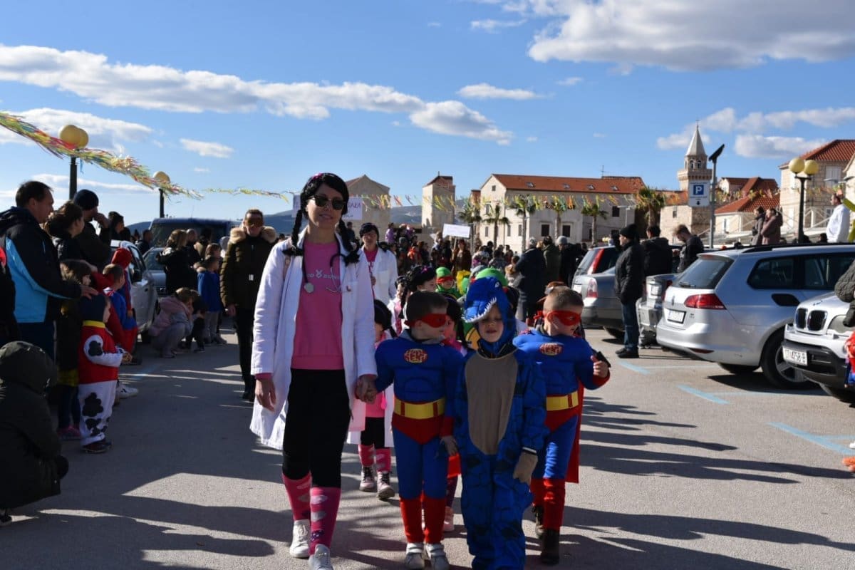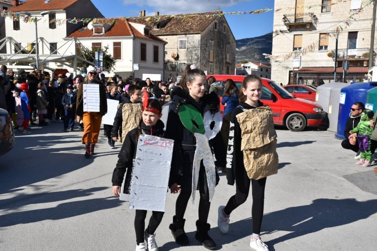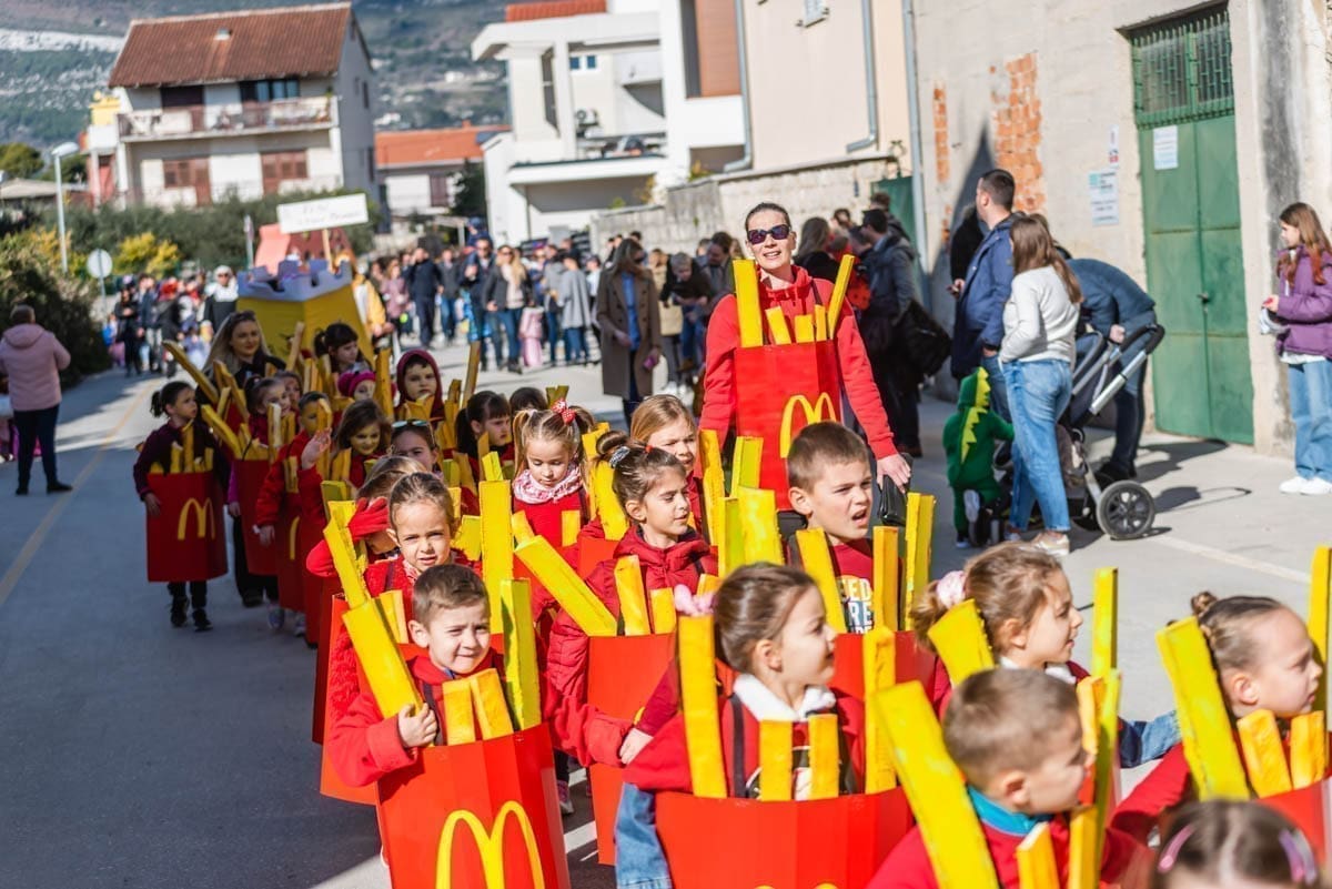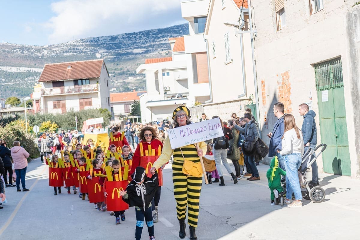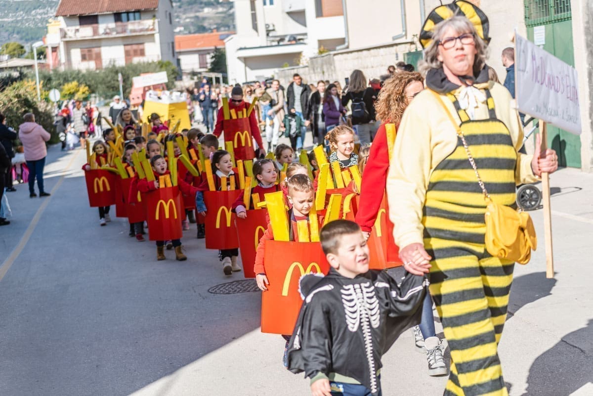 U povorci su se našla djeca iz kaštelanskih osnovnih škola i vrtića te skupa s tetama formirali oko 20 točki. Bilo je tu kuhara, likova iz bajki , autića, farmera, dokrorice Pliško, Masterchefa, Prosjaka i sinova te mnogih drugih. Na parkingu su ih dočekale maskote s kojima su mogli napraviti fotografije za pamćenje, a na dva mjesta bili su punktovi s face paintingom, gdje su zainteresirana djeca mogla oslikati svoja lica. Na kraju su djeci podijeljene krafne i sokiće te su se nakon okrepe nastavili zabavljati uz pjesmu i ples.
