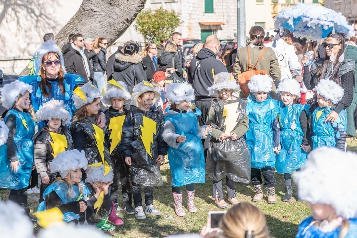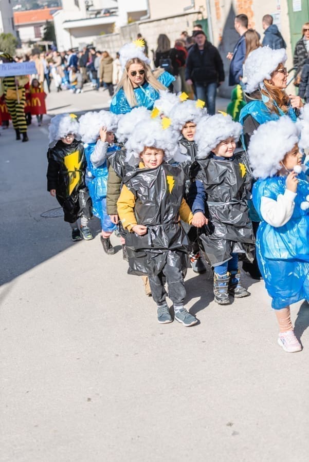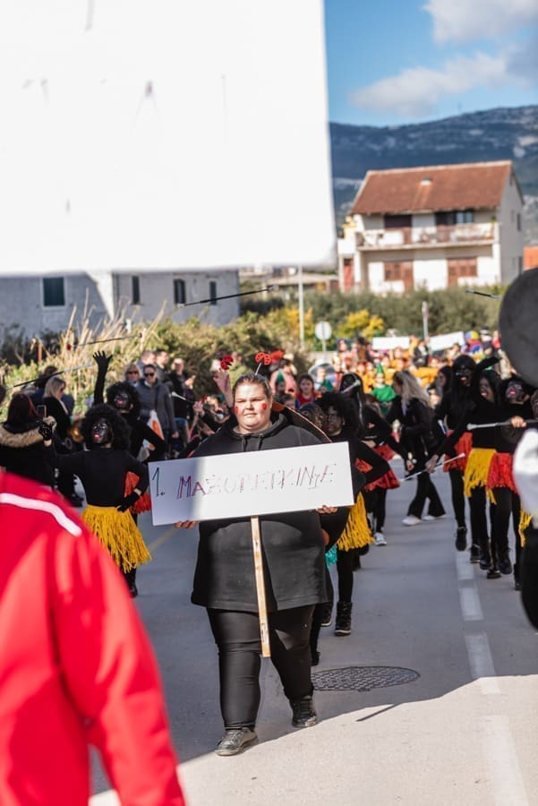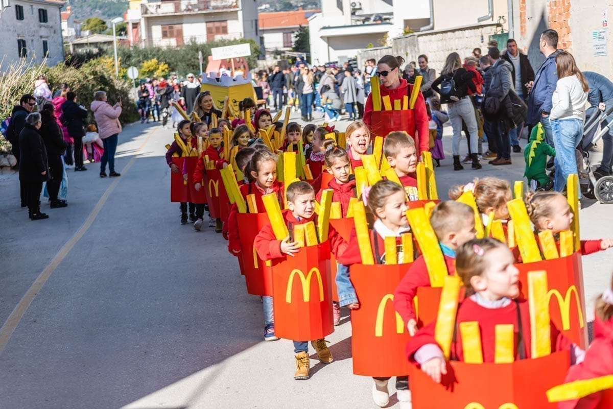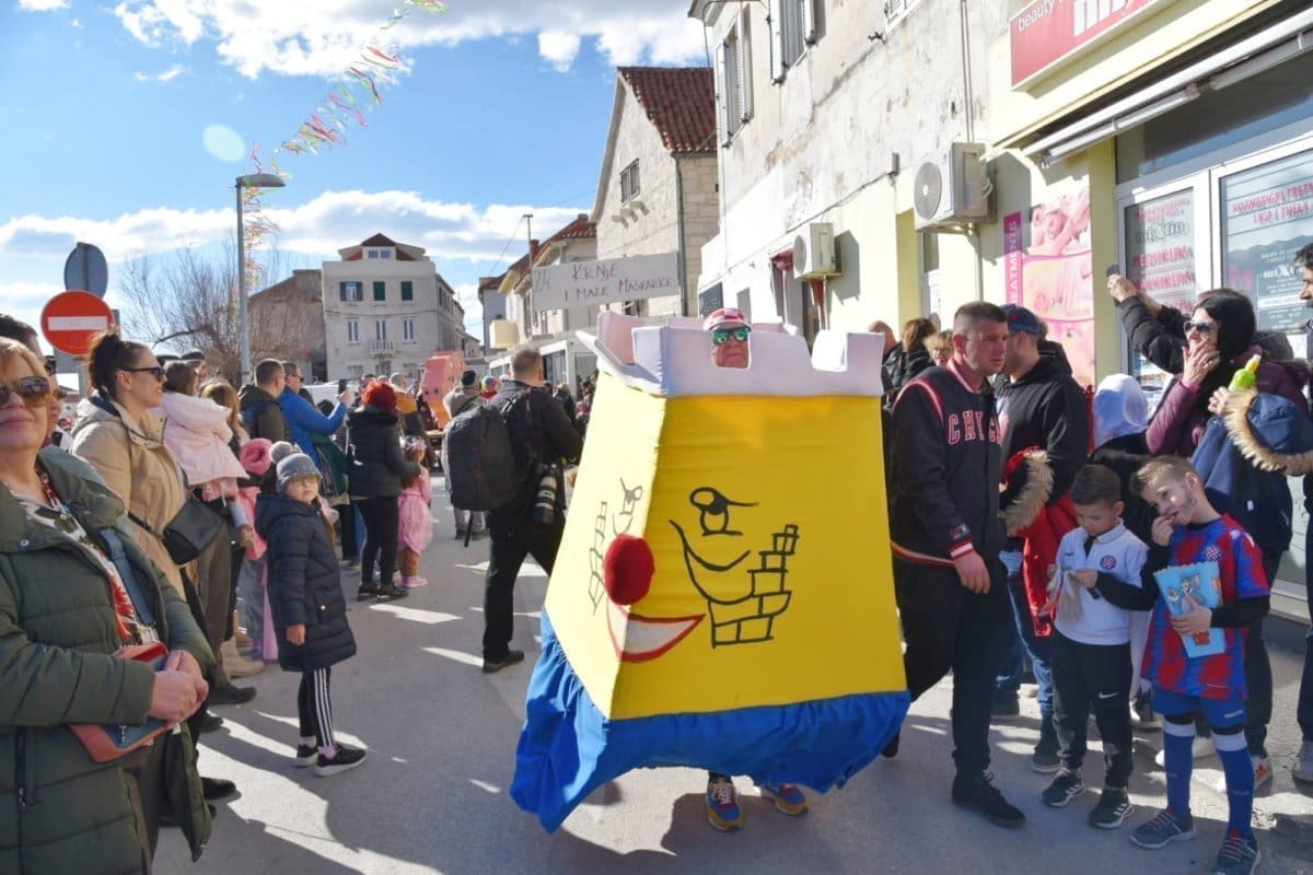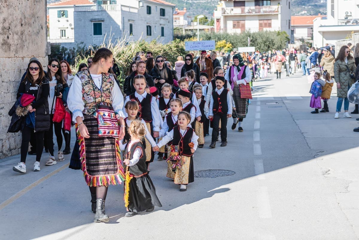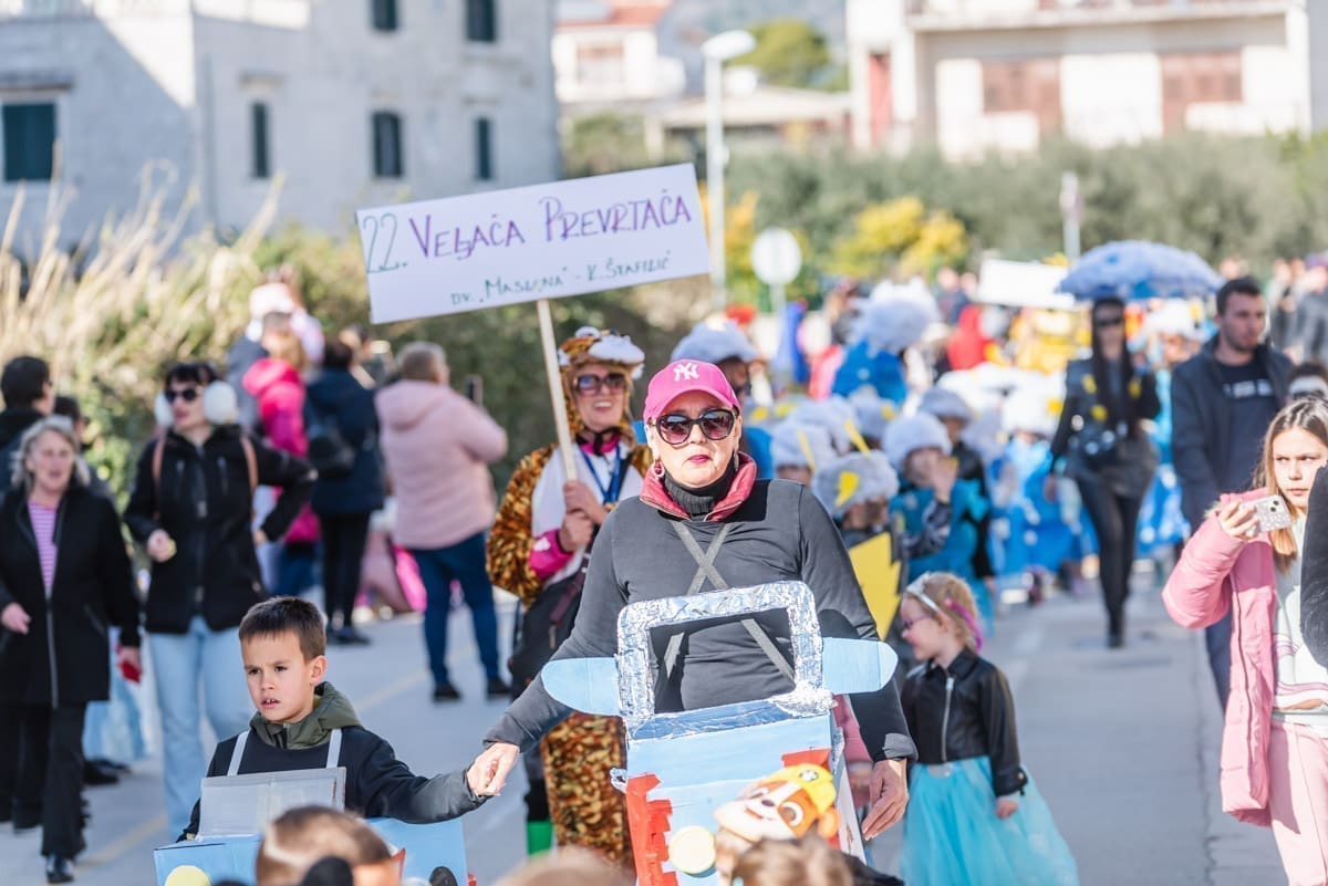 U povorci su se našla djeca iz kaštelanskih osnovnih škola i vrtića te skupa s tetama formirali oko 20 točki. Bilo je tu kuhara, likova iz bajki , autića, farmera, dokrorice Pliško, Masterchefa, Prosjaka i sinova te mnogih drugih. Na parkingu su ih dočekale maskote s kojima su mogli napraviti fotografije za pamćenje, a na dva mjesta bili su punktovi s face paintingom, gdje su zainteresirana djeca mogla oslikati svoja lica. Na kraju su djeci podijeljene krafne i sokiće te su se nakon okrepe nastavili zabavljati uz pjesmu i ples.
