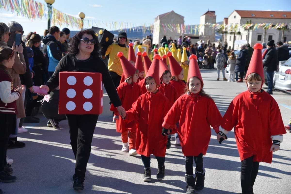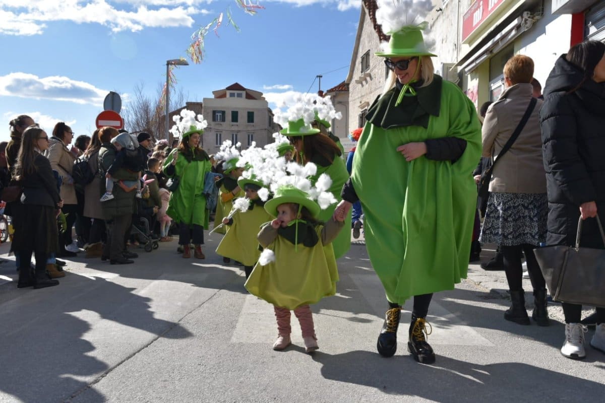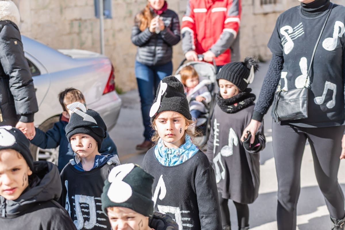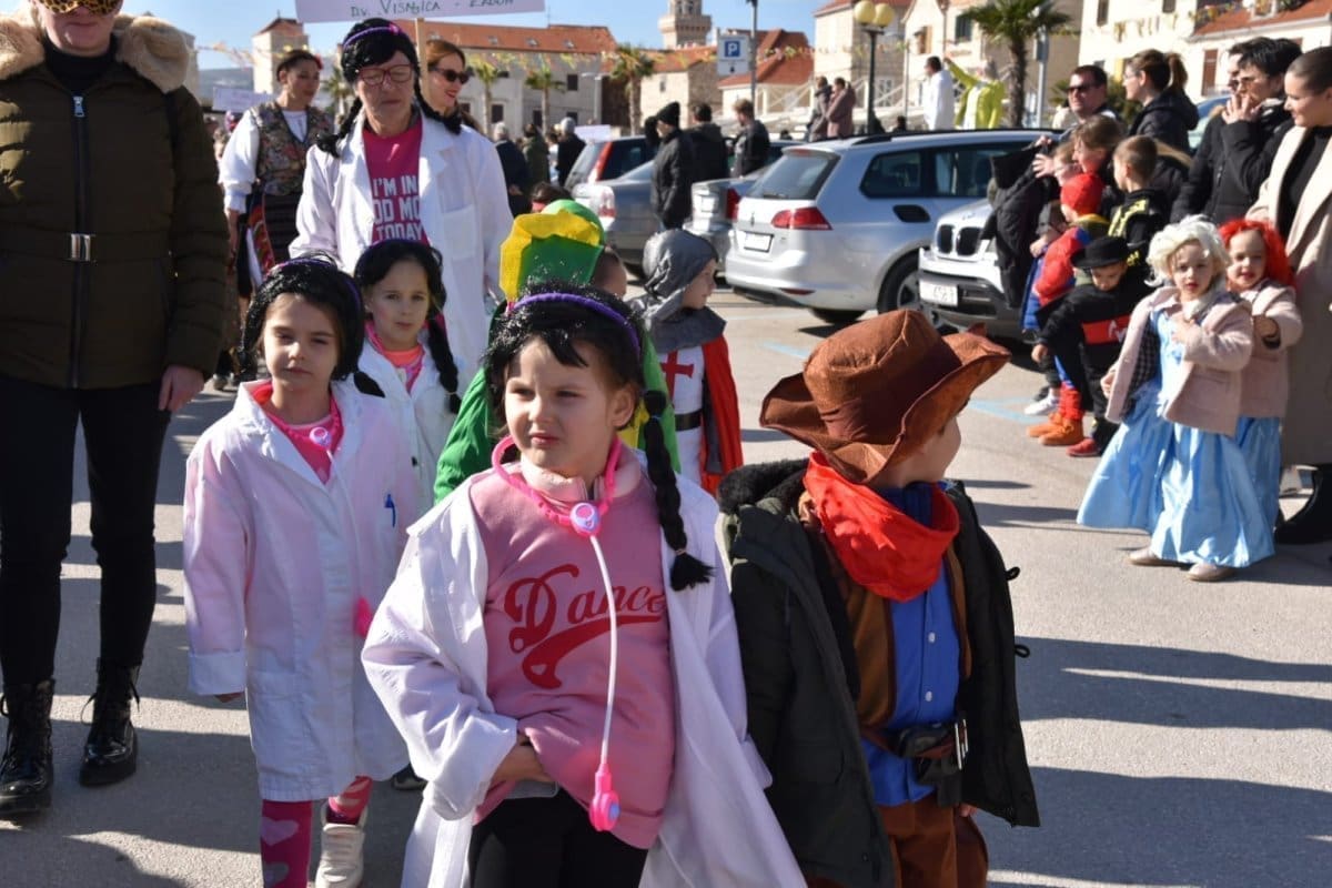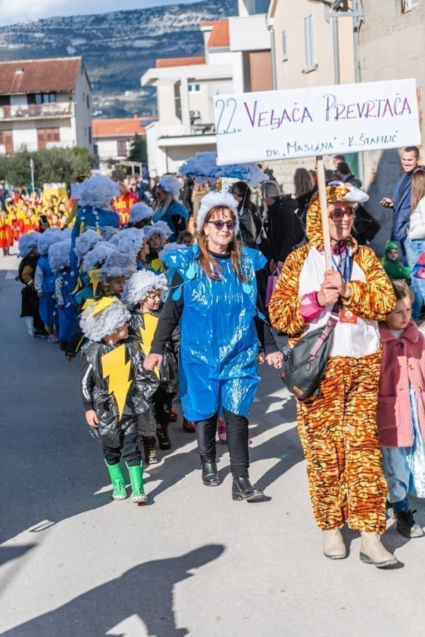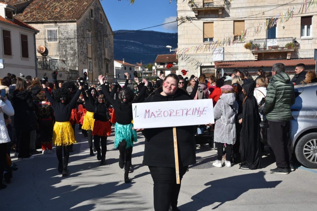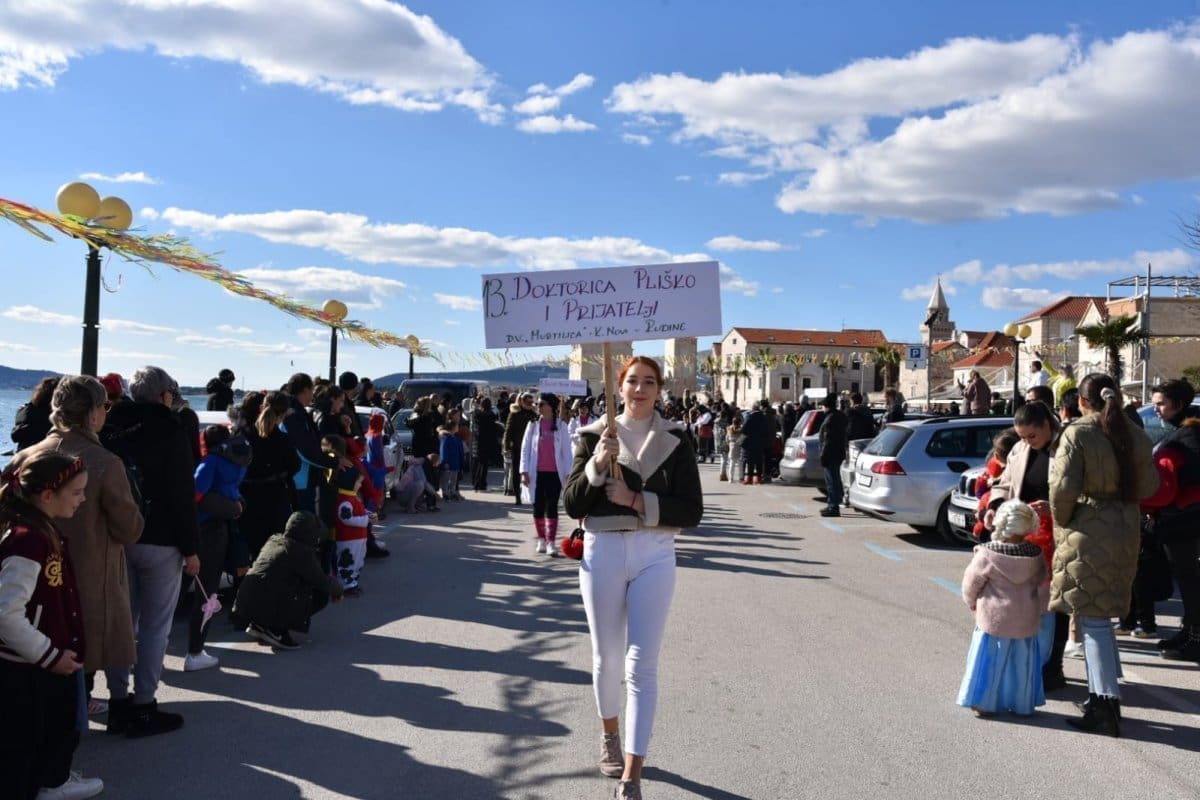 U povorci su se našla djeca iz kaštelanskih osnovnih škola i vrtića te skupa s tetama formirali oko 20 točki. Bilo je tu kuhara, likova iz bajki , autića, farmera, dokrorice Pliško, Masterchefa, Prosjaka i sinova te mnogih drugih. Na parkingu su ih dočekale maskote s kojima su mogli napraviti fotografije za pamćenje, a na dva mjesta bili su punktovi s face paintingom, gdje su zainteresirana djeca mogla oslikati svoja lica. Na kraju su djeci podijeljene krafne i sokiće te su se nakon okrepe nastavili zabavljati uz pjesmu i ples.