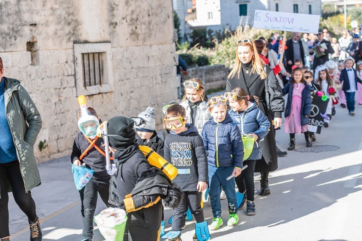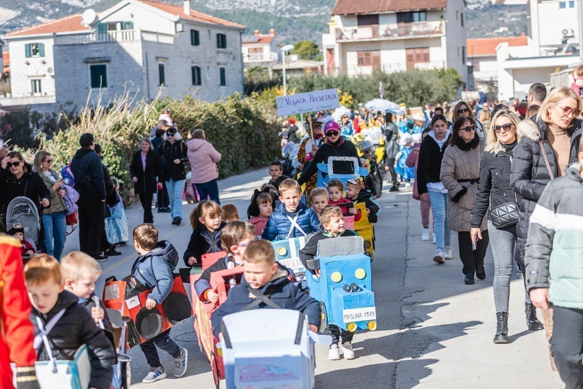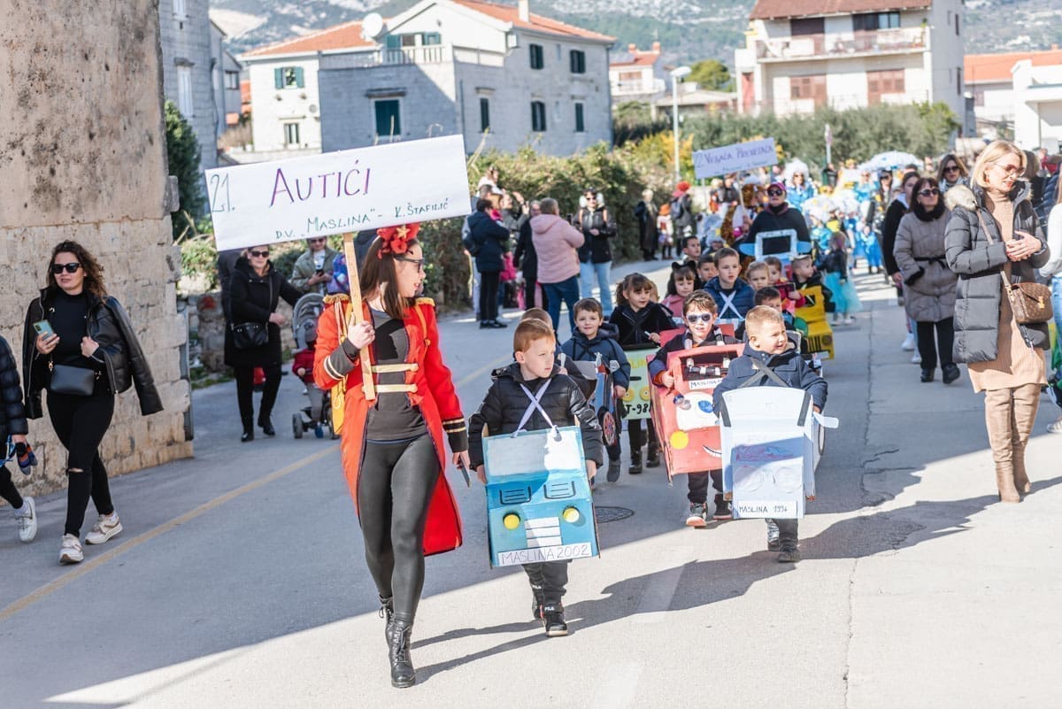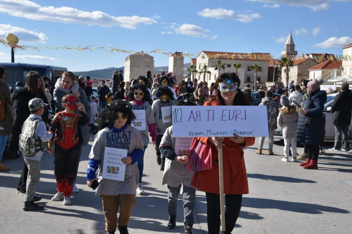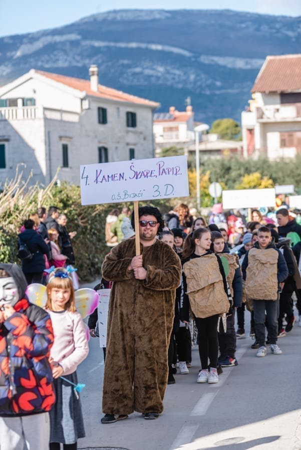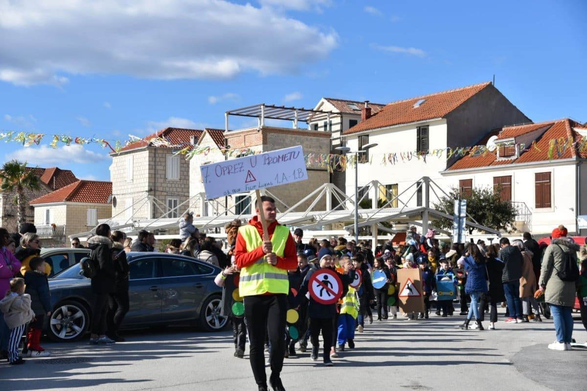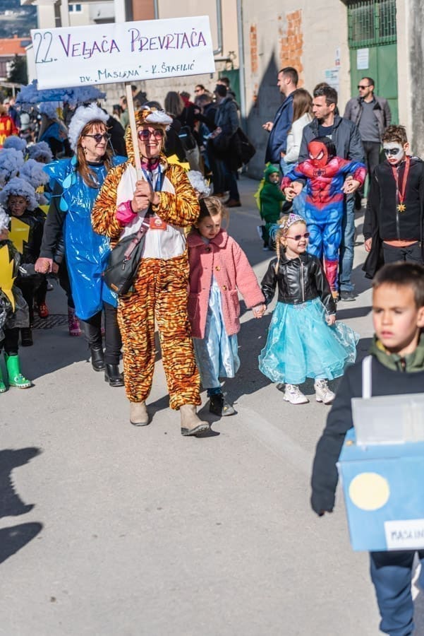U povorci su se našla djeca iz kaštelanskih osnovnih škola i vrtića te skupa s tetama formirali oko 20 točki. Bilo je tu kuhara, likova iz bajki , autića, farmera, dokrorice Pliško, Masterchefa, Prosjaka i sinova te mnogih drugih. Na parkingu su ih dočekale maskote s kojima su mogli napraviti fotografije za pamćenje, a na dva mjesta bili su punktovi s face paintingom, gdje su zainteresirana djeca mogla oslikati svoja lica. Na kraju su djeci podijeljene krafne i sokiće te su se nakon okrepe nastavili zabavljati uz pjesmu i ples.