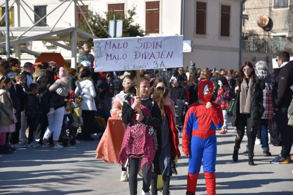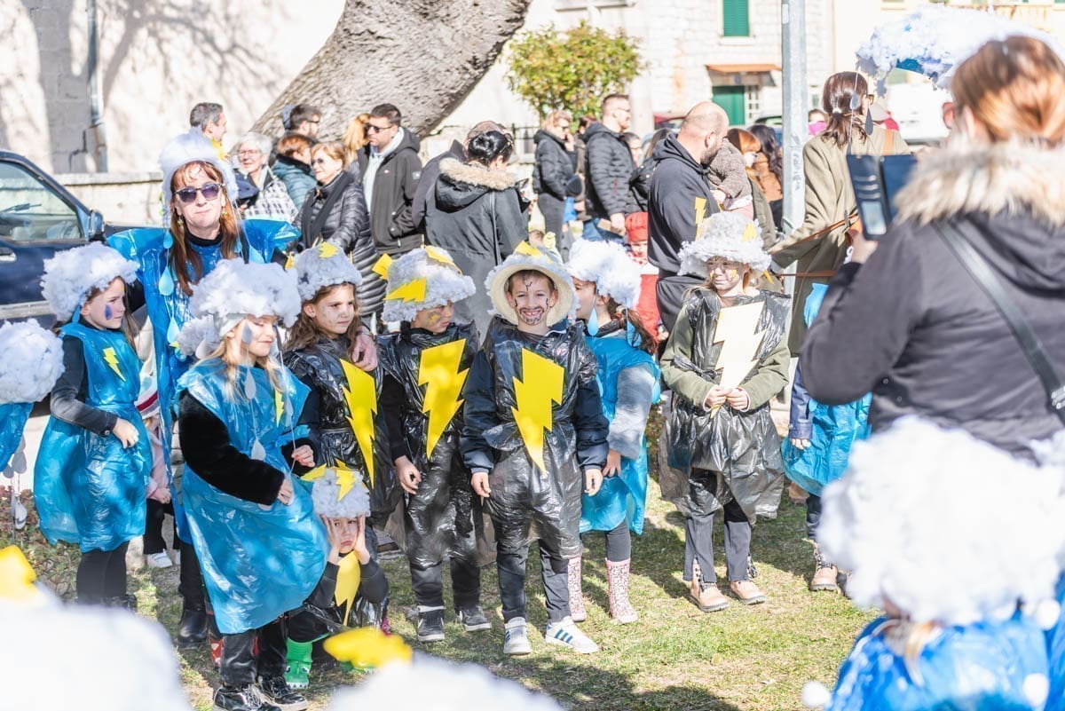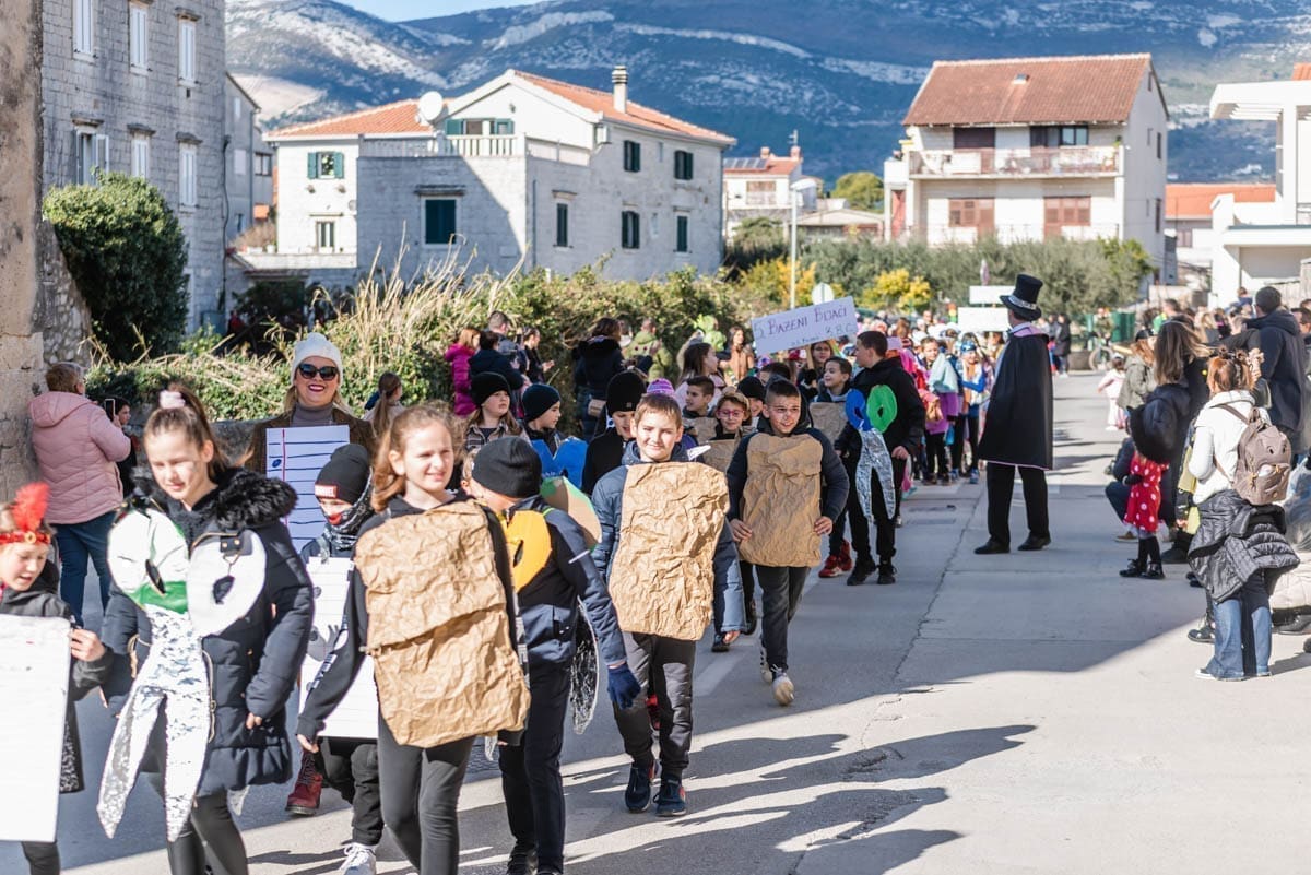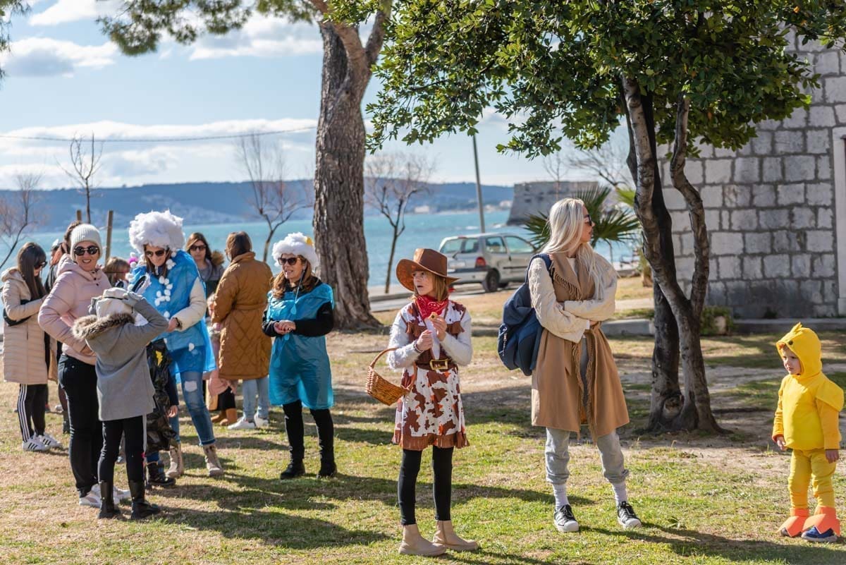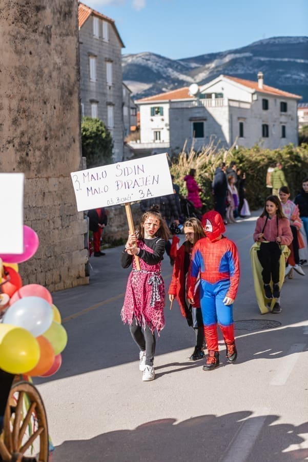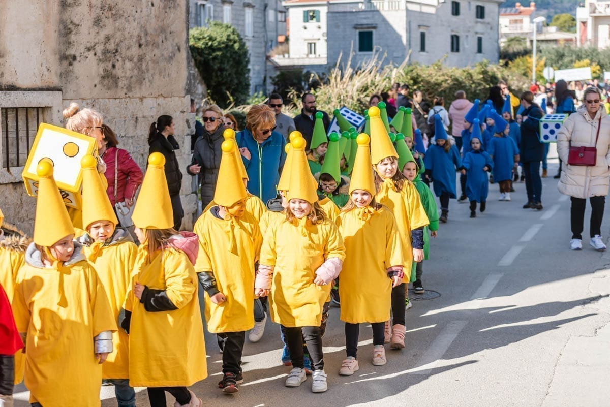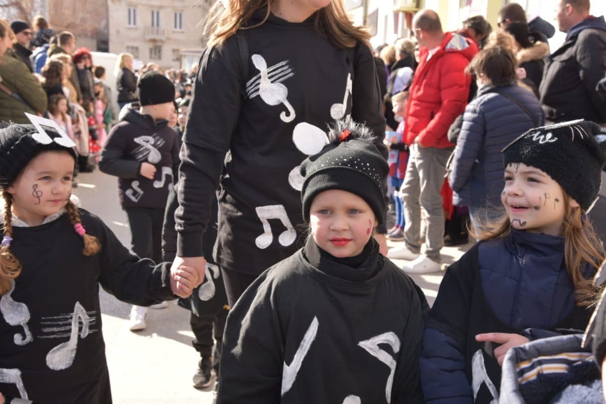 U povorci su se našla djeca iz kaštelanskih osnovnih škola i vrtića te skupa s tetama formirali oko 20 točki. Bilo je tu kuhara, likova iz bajki , autića, farmera, dokrorice Pliško, Masterchefa, Prosjaka i sinova te mnogih drugih. Na parkingu su ih dočekale maskote s kojima su mogli napraviti fotografije za pamćenje, a na dva mjesta bili su punktovi s face paintingom, gdje su zainteresirana djeca mogla oslikati svoja lica. Na kraju su djeci podijeljene krafne i sokiće te su se nakon okrepe nastavili zabavljati uz pjesmu i ples.