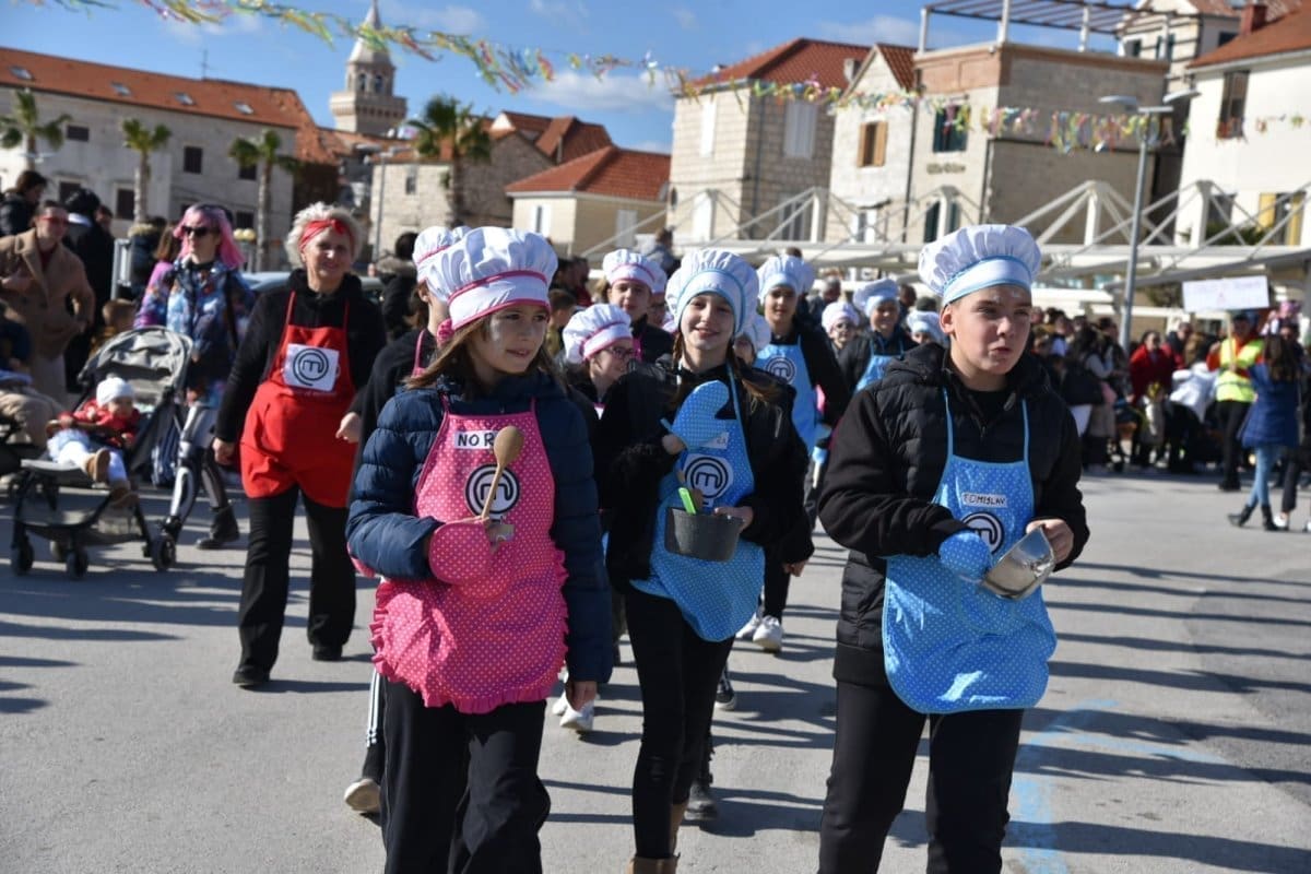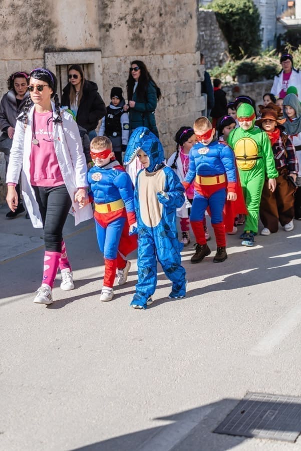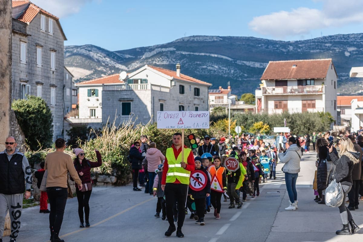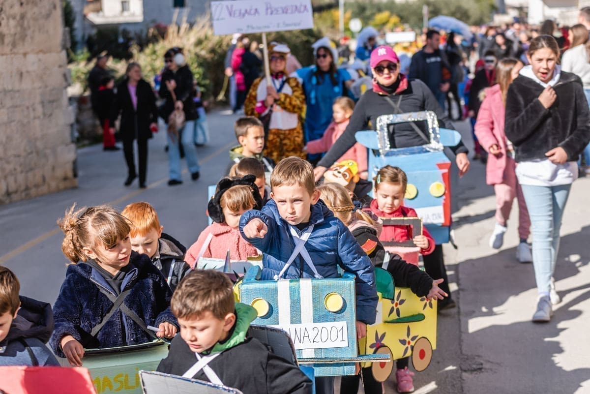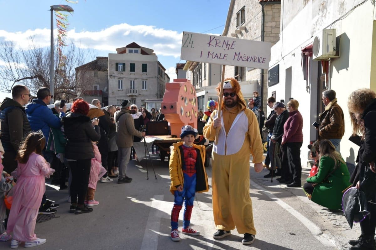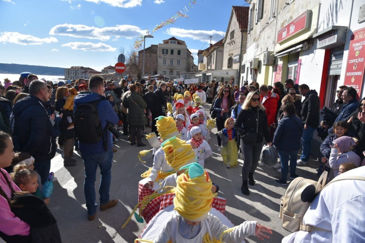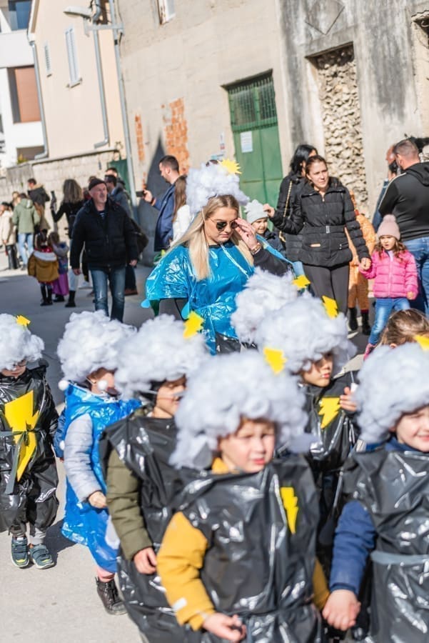 U povorci su se našla djeca iz kaštelanskih osnovnih škola i vrtića te skupa s tetama formirali oko 20 točki. Bilo je tu kuhara, likova iz bajki , autića, farmera, dokrorice Pliško, Masterchefa, Prosjaka i sinova te mnogih drugih. Na parkingu su ih dočekale maskote s kojima su mogli napraviti fotografije za pamćenje, a na dva mjesta bili su punktovi s face paintingom, gdje su zainteresirana djeca mogla oslikati svoja lica. Na kraju su djeci podijeljene krafne i sokiće te su se nakon okrepe nastavili zabavljati uz pjesmu i ples.