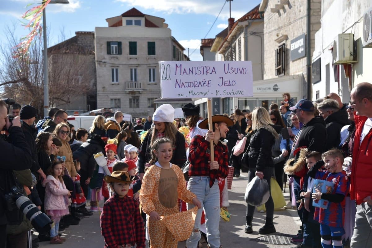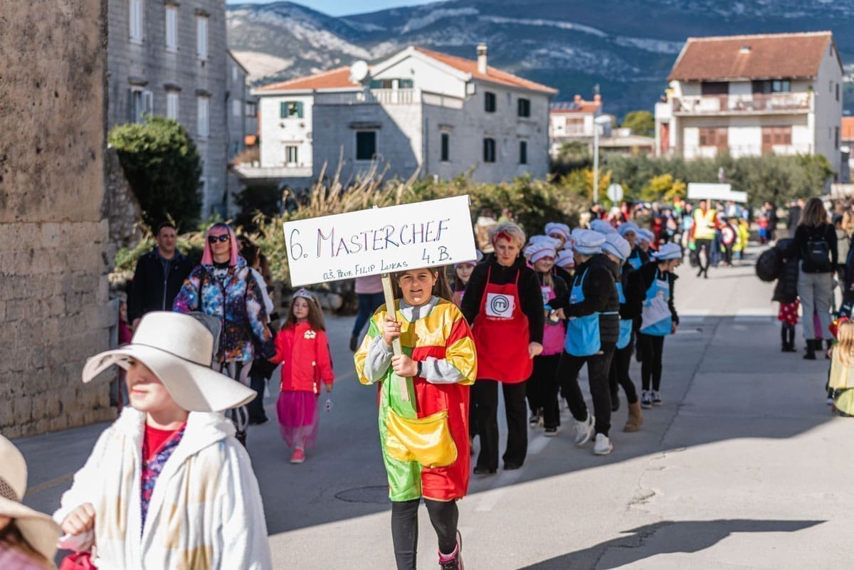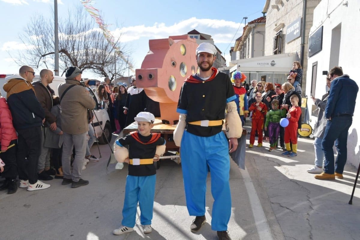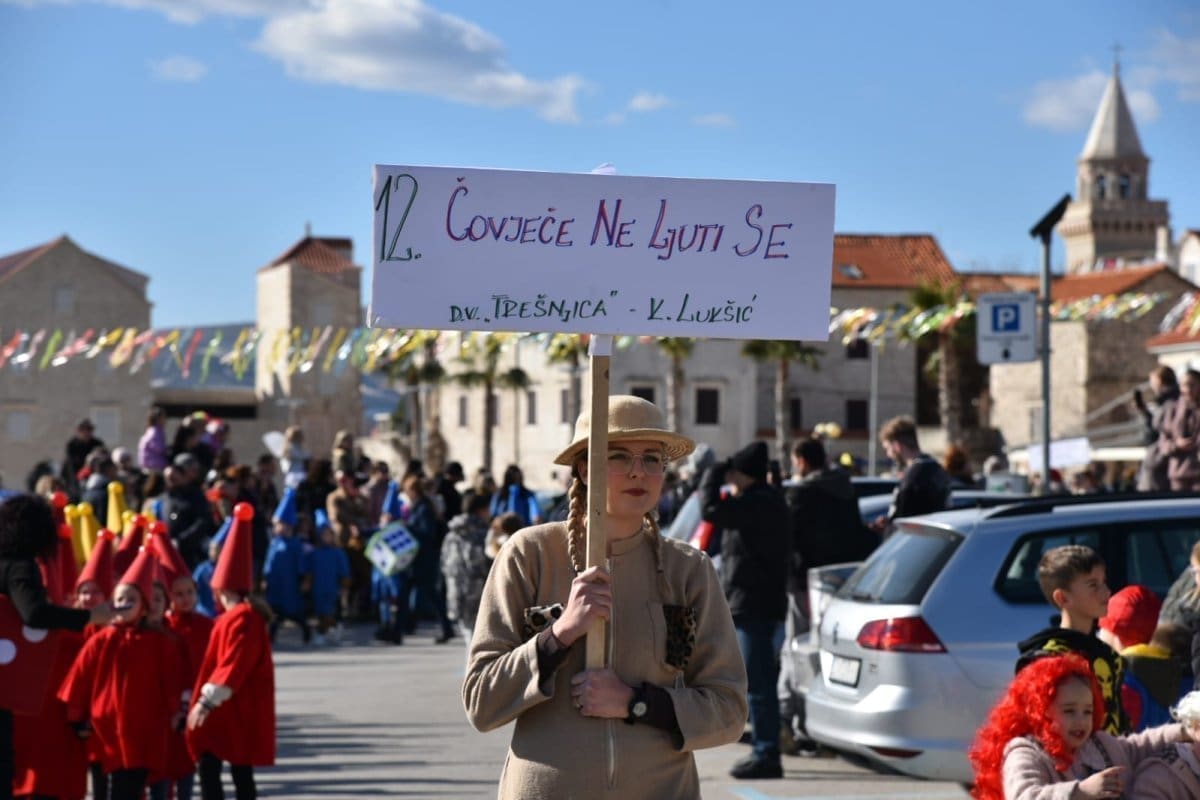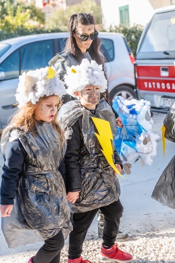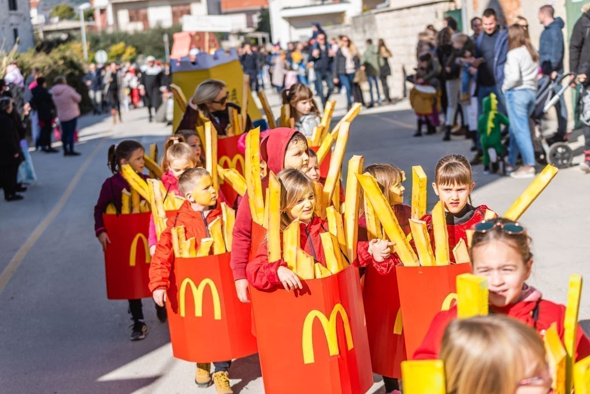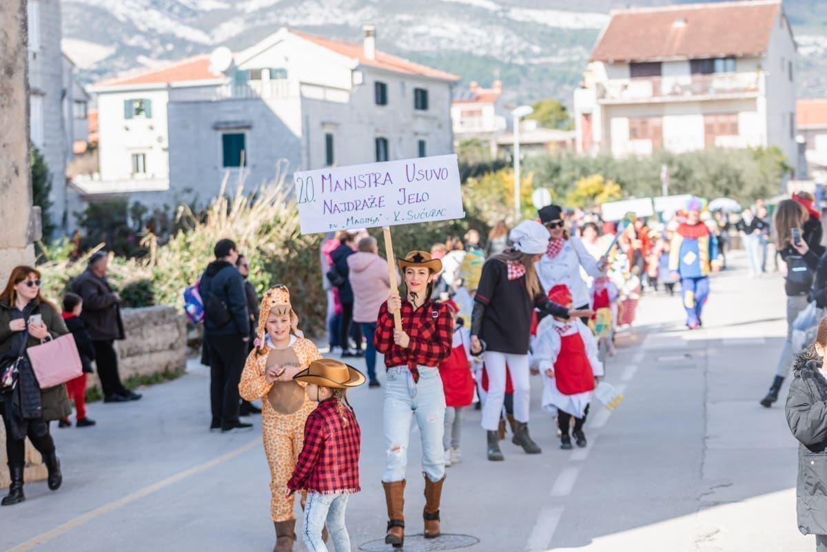 U povorci su se našla djeca iz kaštelanskih osnovnih škola i vrtića te skupa s tetama formirali oko 20 točki. Bilo je tu kuhara, likova iz bajki , autića, farmera, dokrorice Pliško, Masterchefa, Prosjaka i sinova te mnogih drugih. Na parkingu su ih dočekale maskote s kojima su mogli napraviti fotografije za pamćenje, a na dva mjesta bili su punktovi s face paintingom, gdje su zainteresirana djeca mogla oslikati svoja lica. Na kraju su djeci podijeljene krafne i sokiće te su se nakon okrepe nastavili zabavljati uz pjesmu i ples.