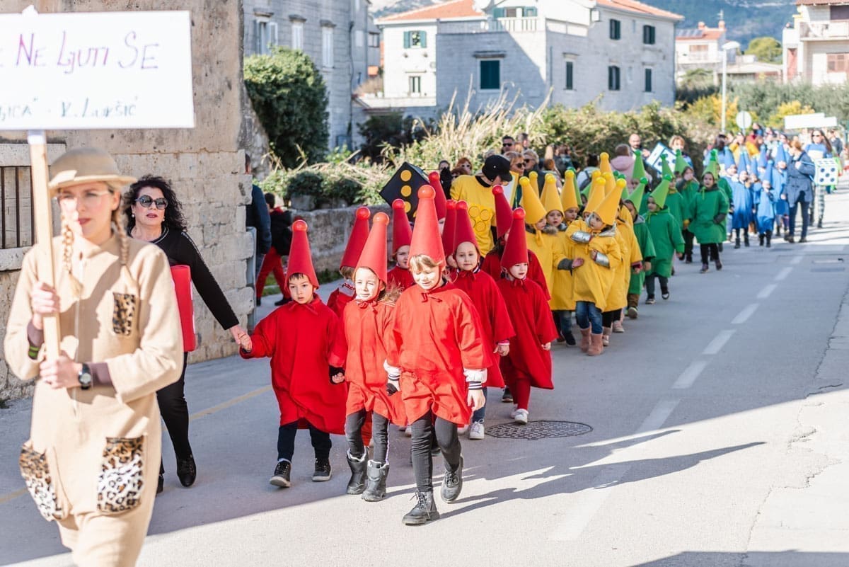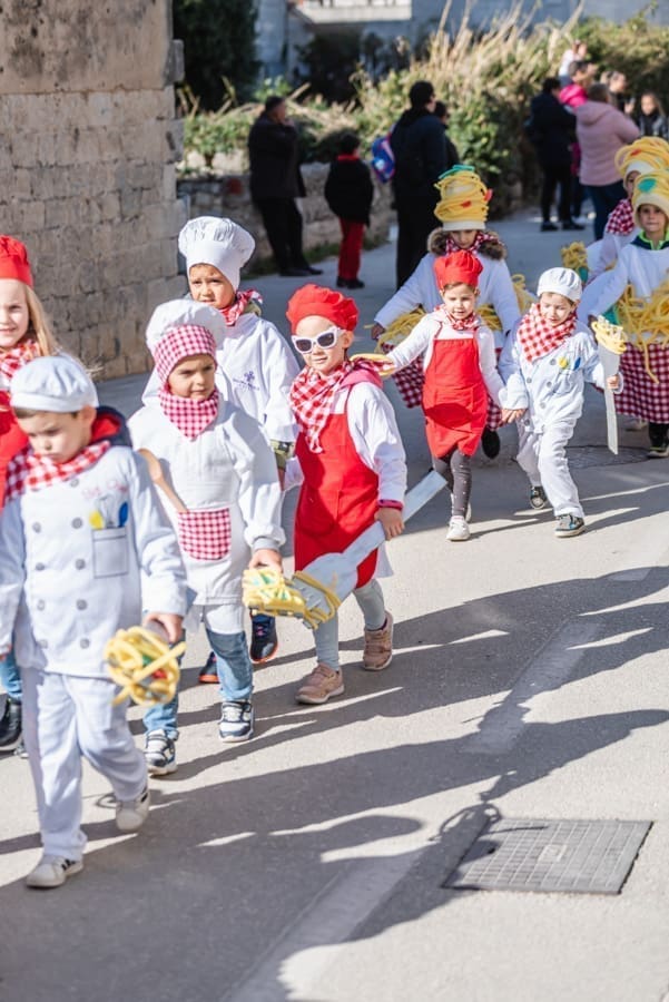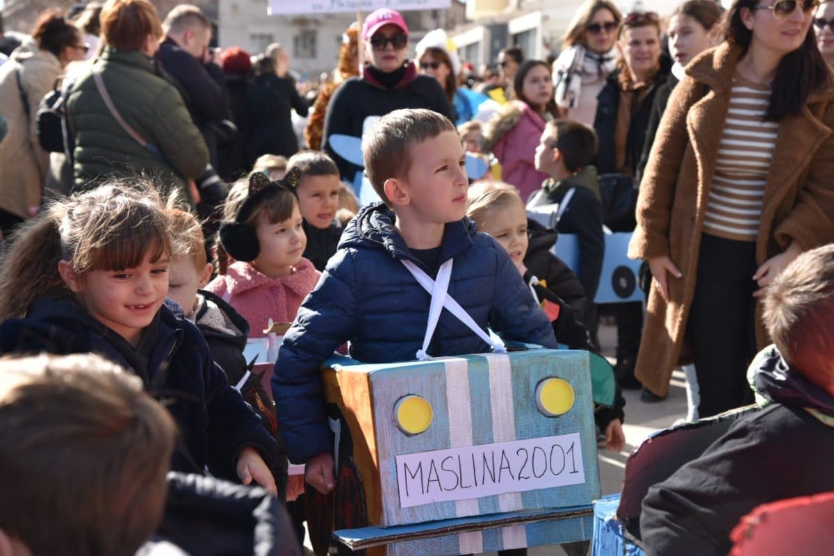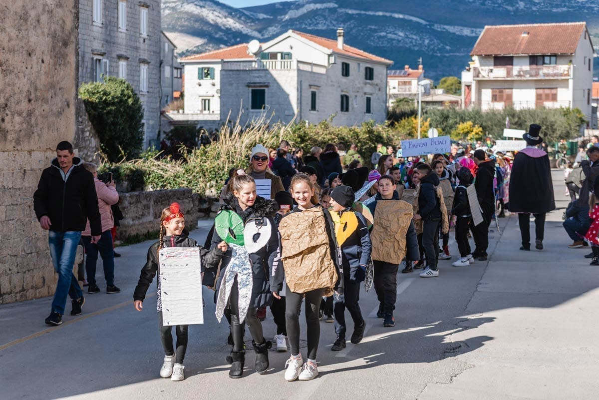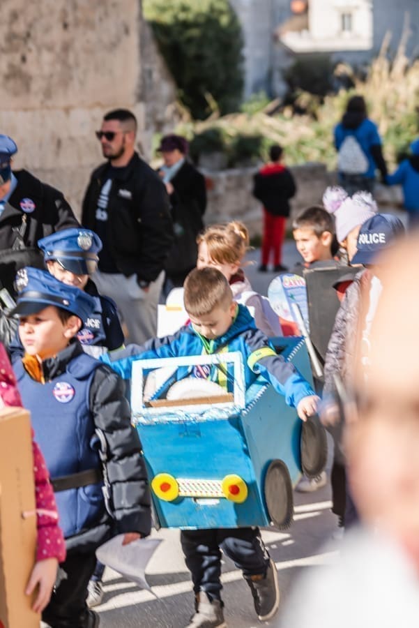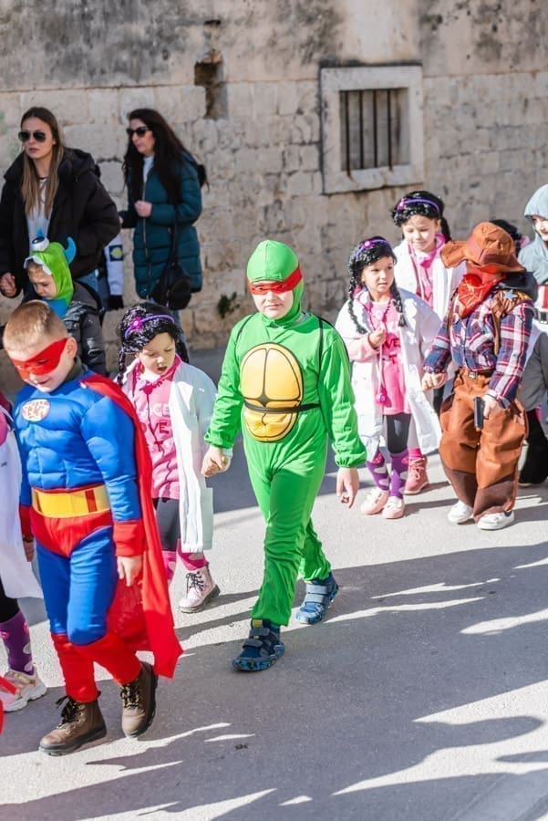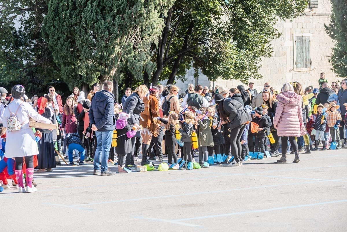 U povorci su se našla djeca iz kaštelanskih osnovnih škola i vrtića te skupa s tetama formirali oko 20 točki. Bilo je tu kuhara, likova iz bajki , autića, farmera, dokrorice Pliško, Masterchefa, Prosjaka i sinova te mnogih drugih. Na parkingu su ih dočekale maskote s kojima su mogli napraviti fotografije za pamćenje, a na dva mjesta bili su punktovi s face paintingom, gdje su zainteresirana djeca mogla oslikati svoja lica. Na kraju su djeci podijeljene krafne i sokiće te su se nakon okrepe nastavili zabavljati uz pjesmu i ples.
