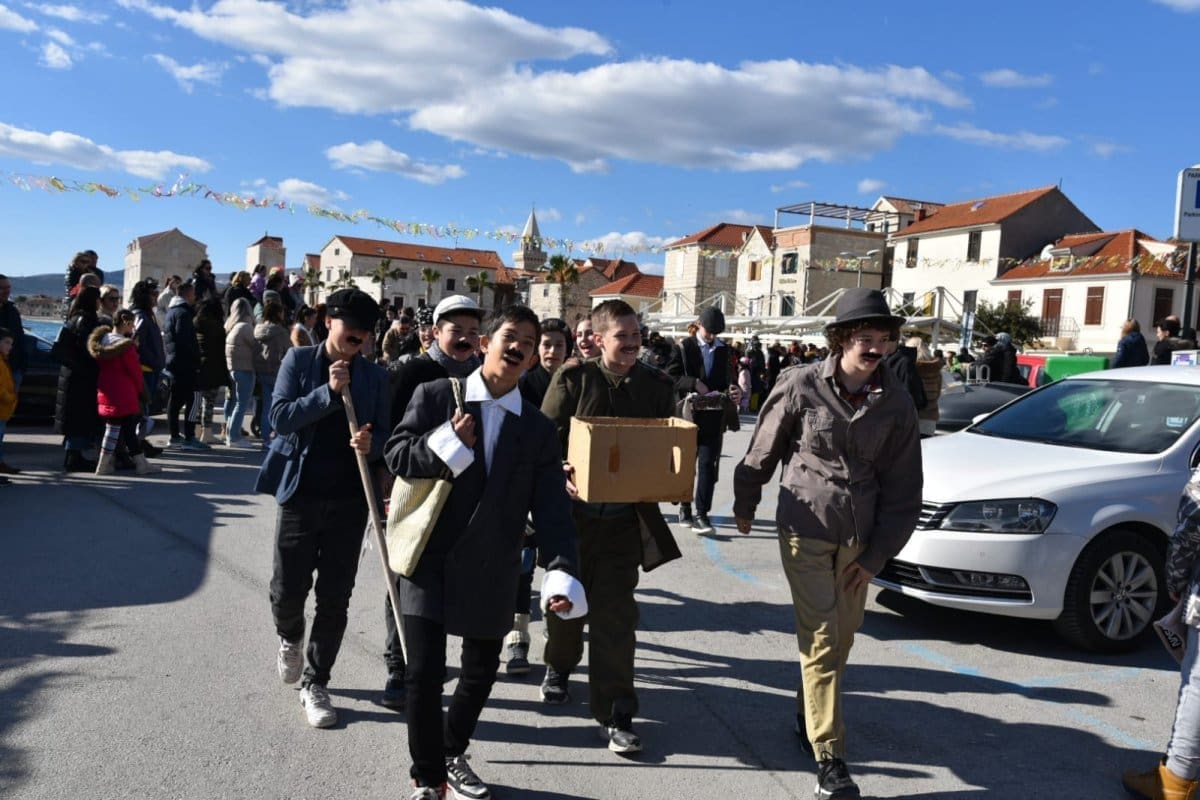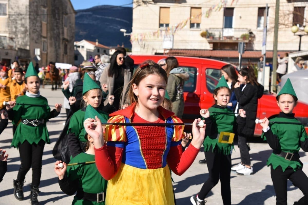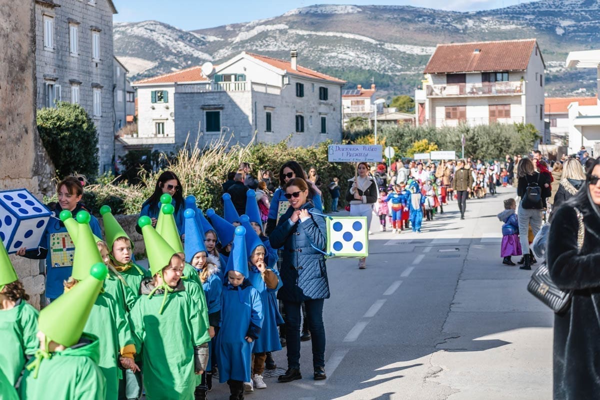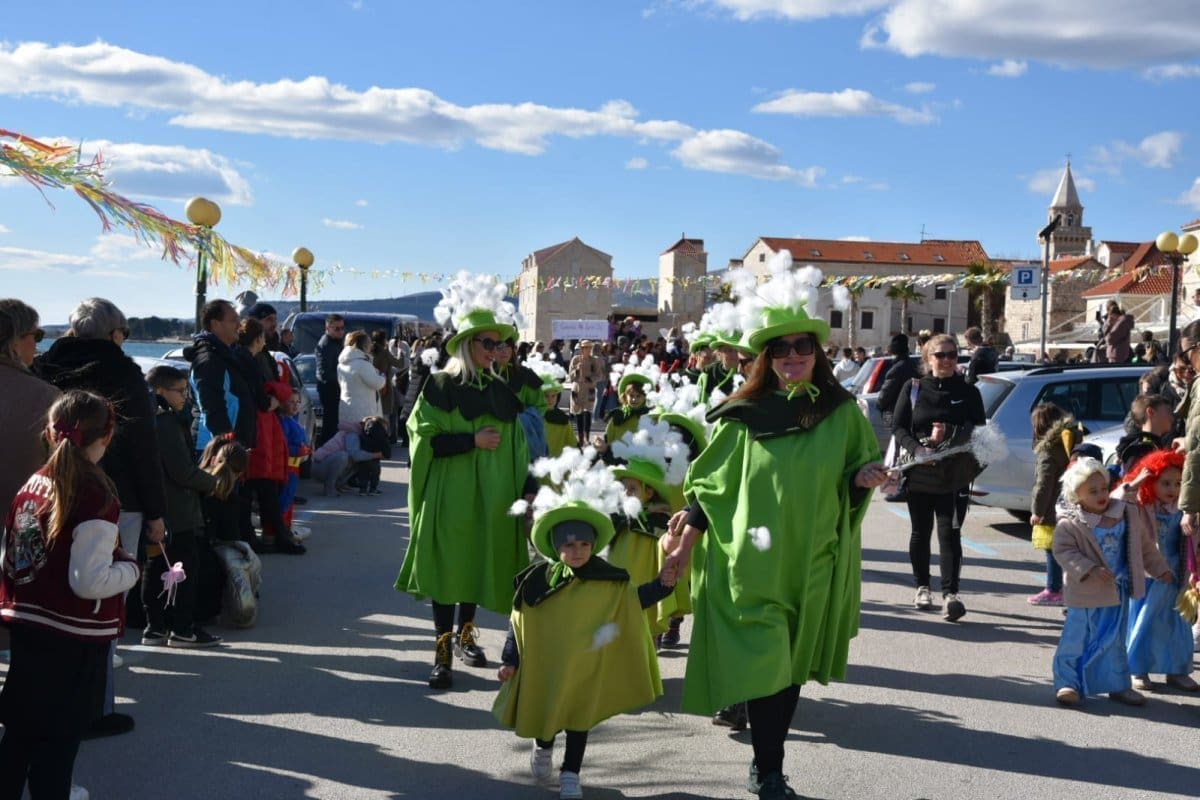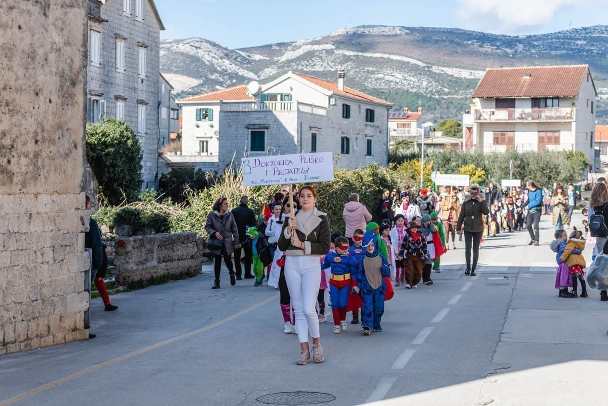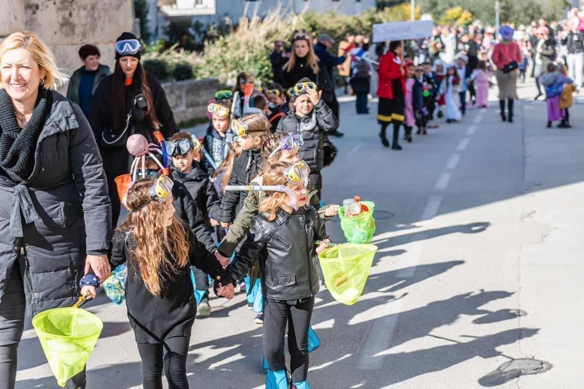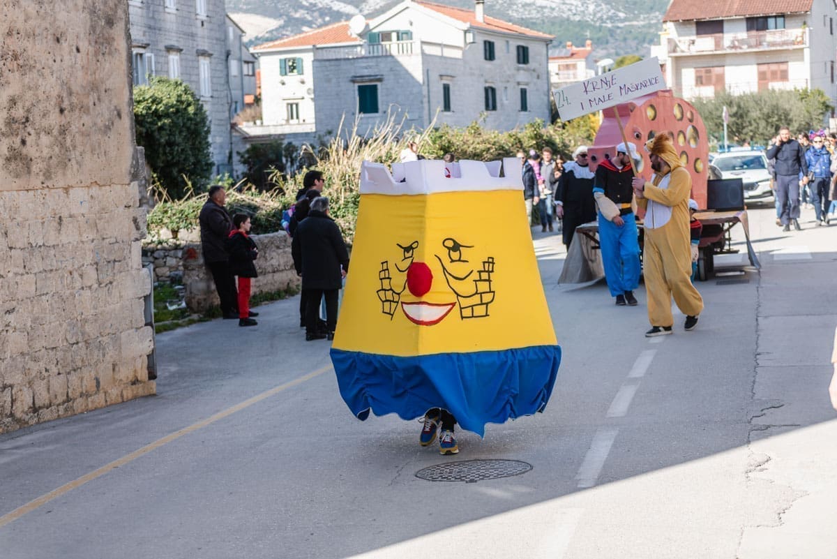 U povorci su se našla djeca iz kaštelanskih osnovnih škola i vrtića te skupa s tetama formirali oko 20 točki. Bilo je tu kuhara, likova iz bajki , autića, farmera, dokrorice Pliško, Masterchefa, Prosjaka i sinova te mnogih drugih. Na parkingu su ih dočekale maskote s kojima su mogli napraviti fotografije za pamćenje, a na dva mjesta bili su punktovi s face paintingom, gdje su zainteresirana djeca mogla oslikati svoja lica. Na kraju su djeci podijeljene krafne i sokiće te su se nakon okrepe nastavili zabavljati uz pjesmu i ples.