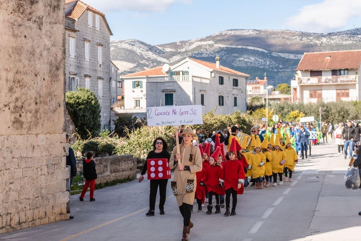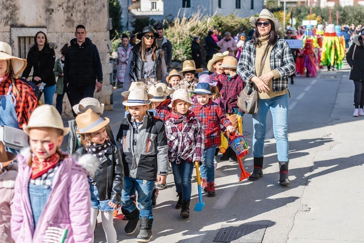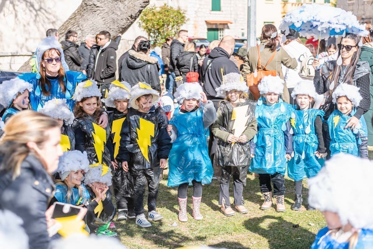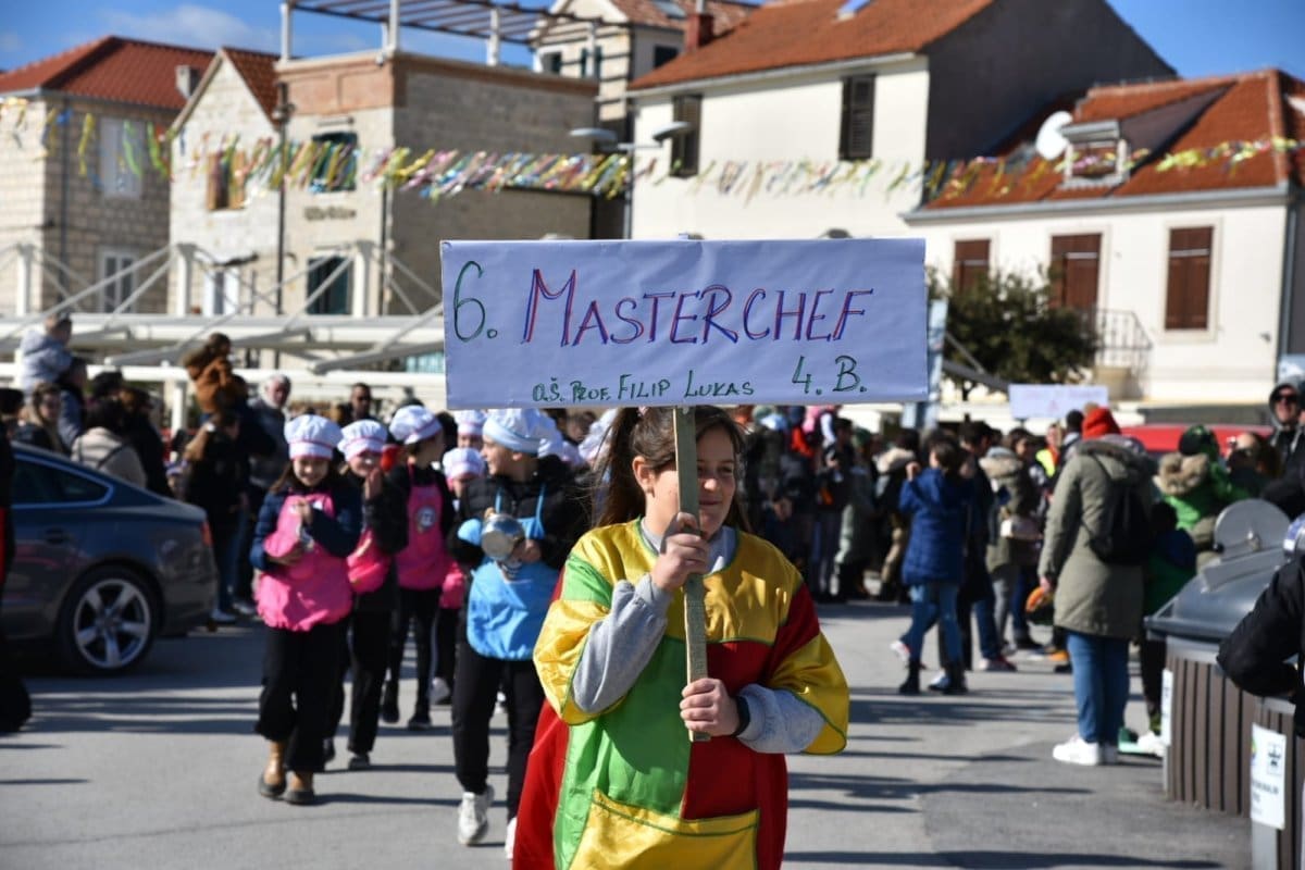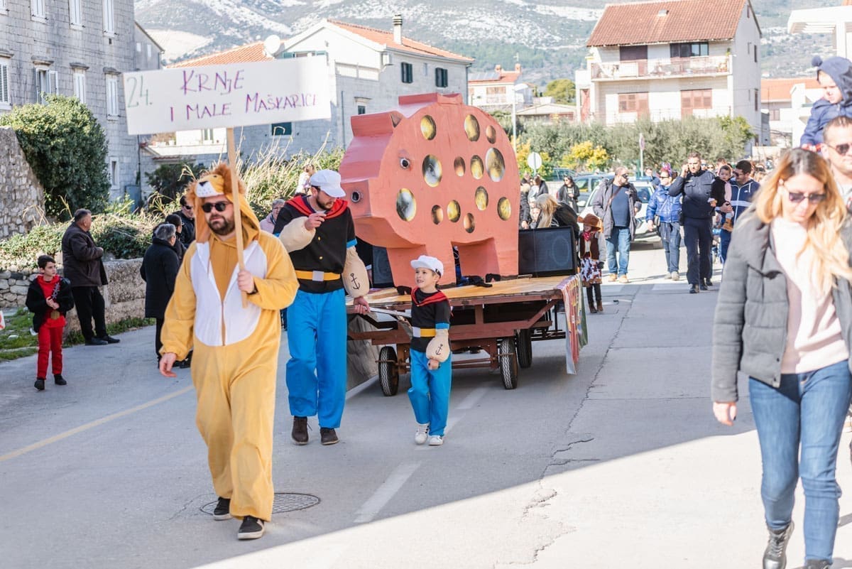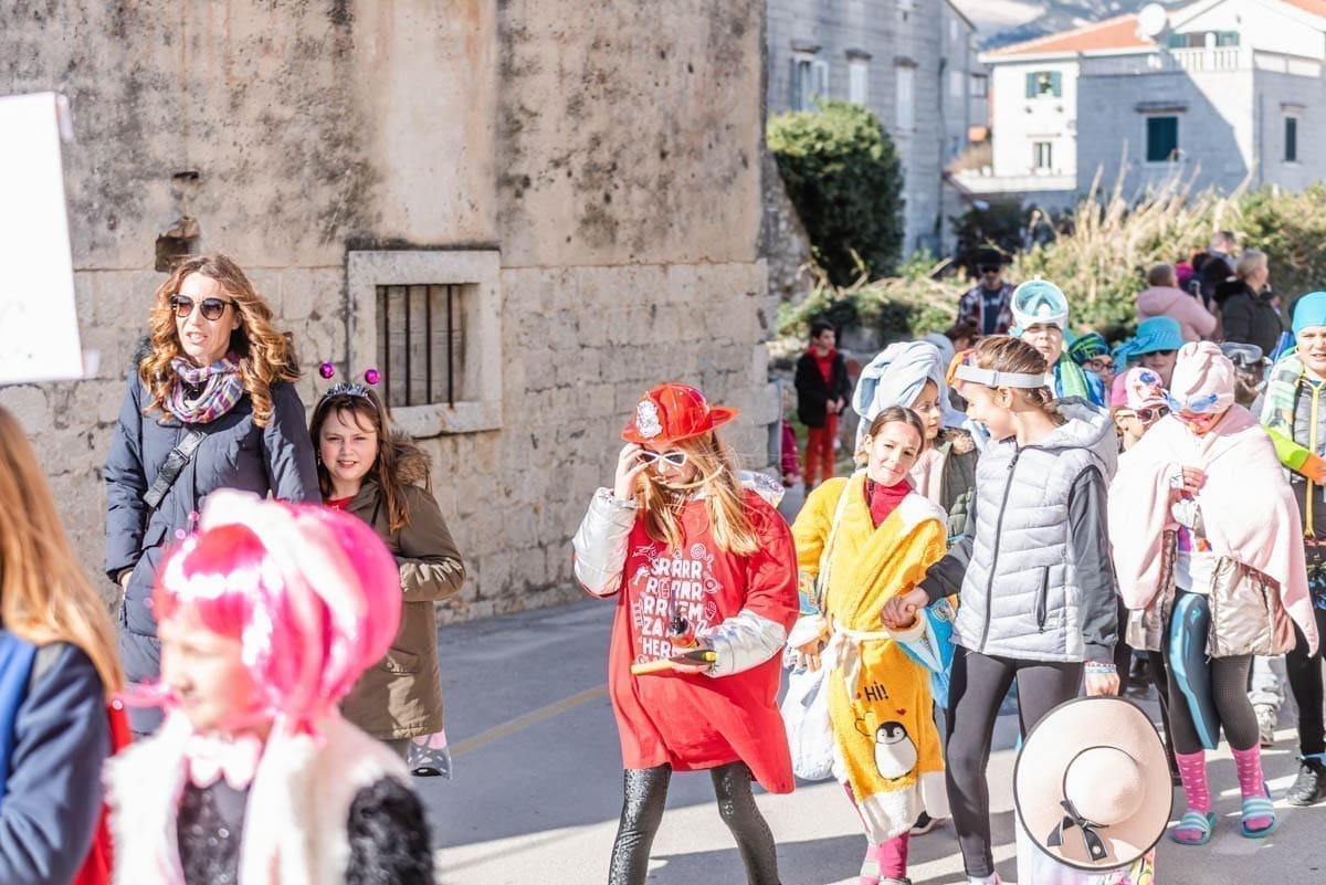 U povorci su se našla djeca iz kaštelanskih osnovnih škola i vrtića te skupa s tetama formirali oko 20 točki. Bilo je tu kuhara, likova iz bajki , autića, farmera, dokrorice Pliško, Masterchefa, Prosjaka i sinova te mnogih drugih. Na parkingu su ih dočekale maskote s kojima su mogli napraviti fotografije za pamćenje, a na dva mjesta bili su punktovi s face paintingom, gdje su zainteresirana djeca mogla oslikati svoja lica. Na kraju su djeci podijeljene krafne i sokiće te su se nakon okrepe nastavili zabavljati uz pjesmu i ples.
