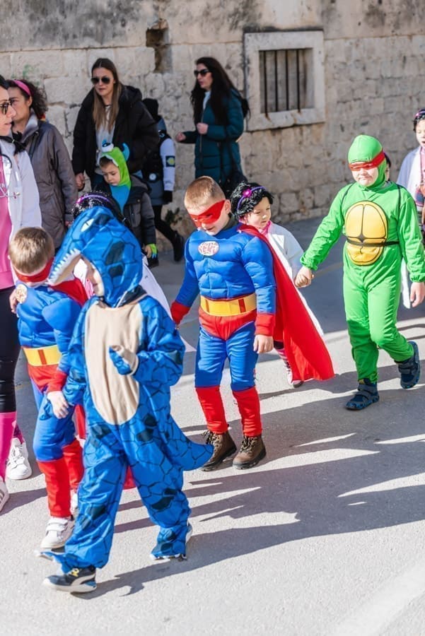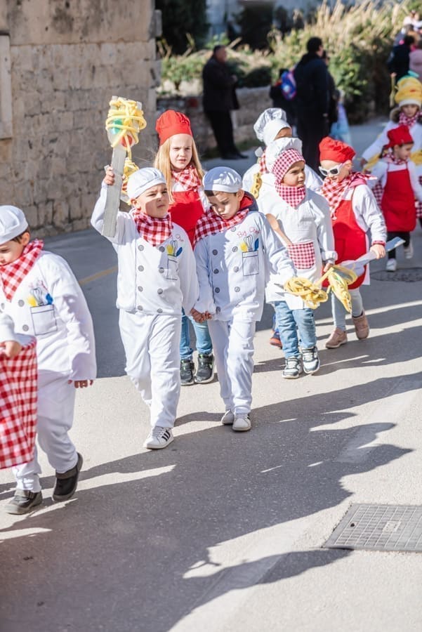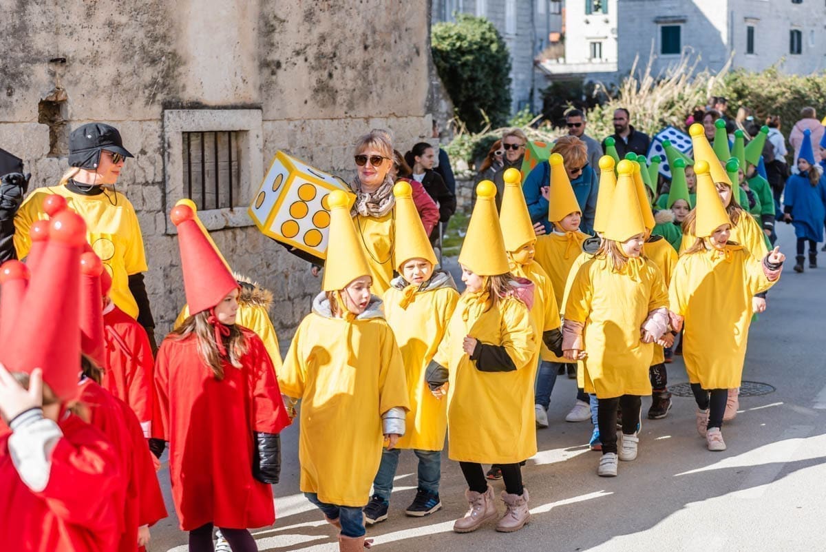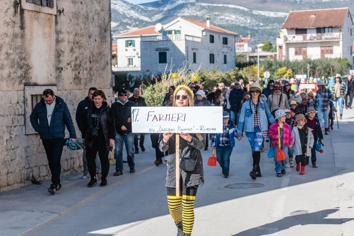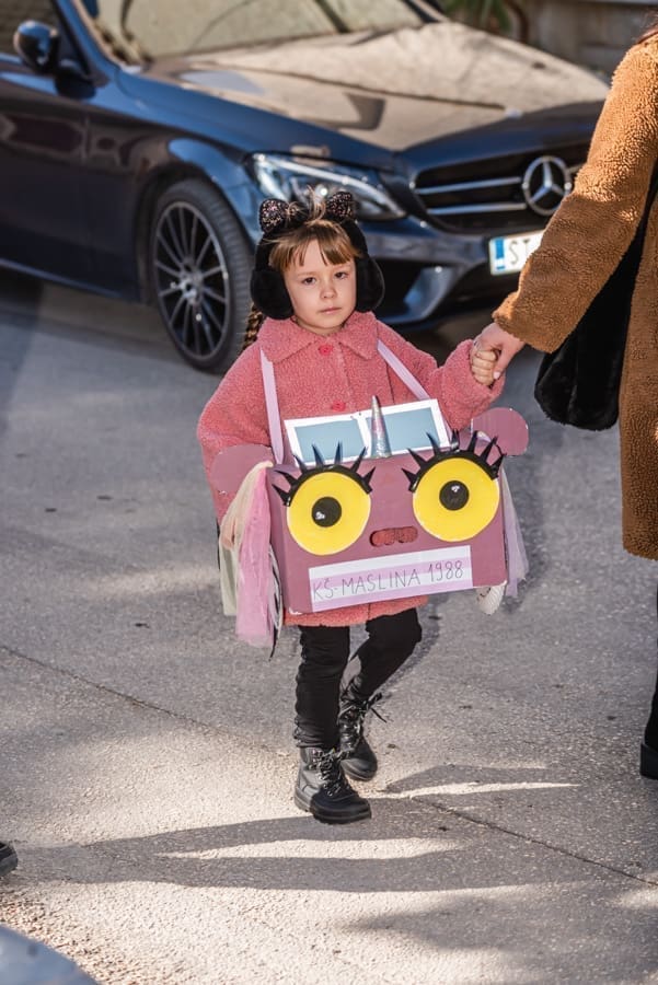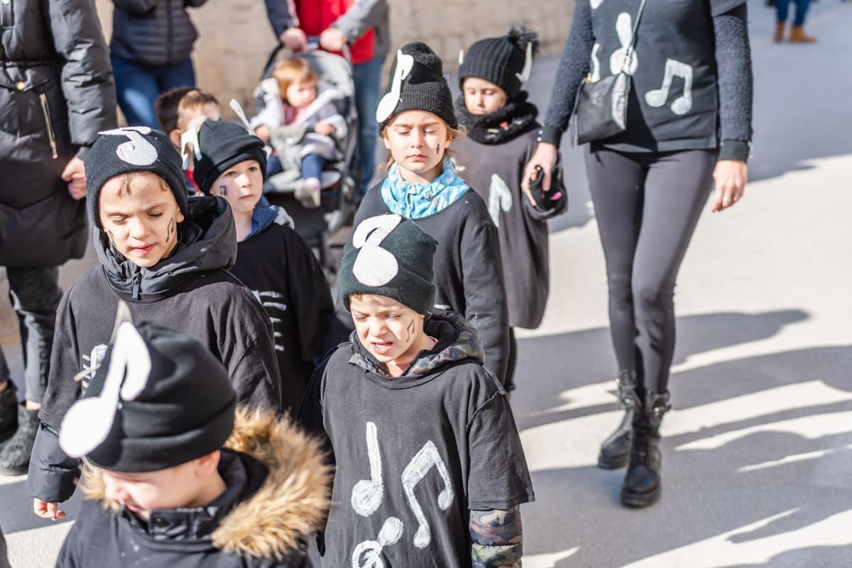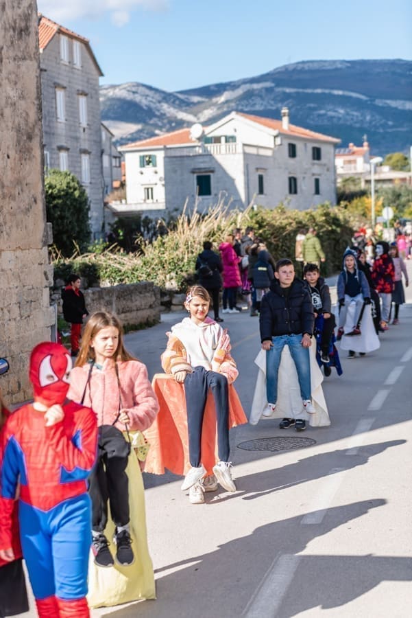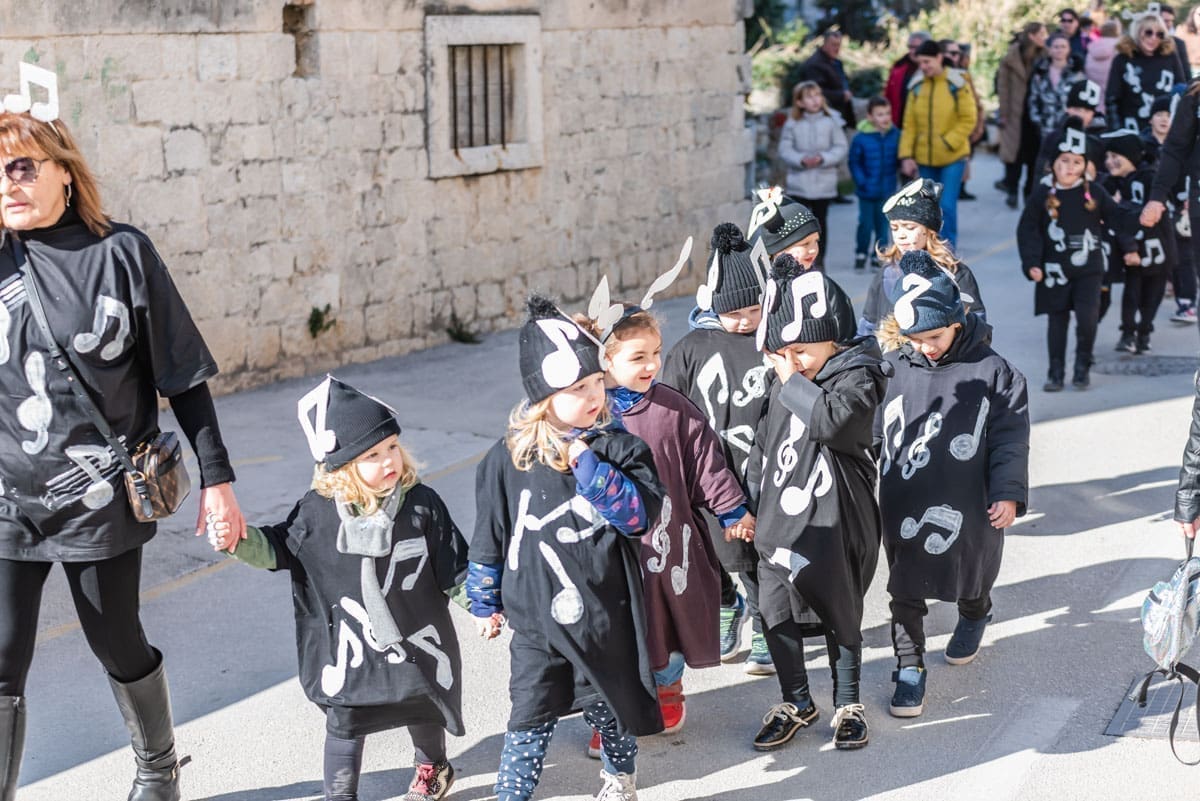U povorci su se našla djeca iz kaštelanskih osnovnih škola i vrtića te skupa s tetama formirali oko 20 točki. Bilo je tu kuhara, likova iz bajki , autića, farmera, dokrorice Pliško, Masterchefa, Prosjaka i sinova te mnogih drugih. Na parkingu su ih dočekale maskote s kojima su mogli napraviti fotografije za pamćenje, a na dva mjesta bili su punktovi s face paintingom, gdje su zainteresirana djeca mogla oslikati svoja lica. Na kraju su djeci podijeljene krafne i sokiće te su se nakon okrepe nastavili zabavljati uz pjesmu i ples.