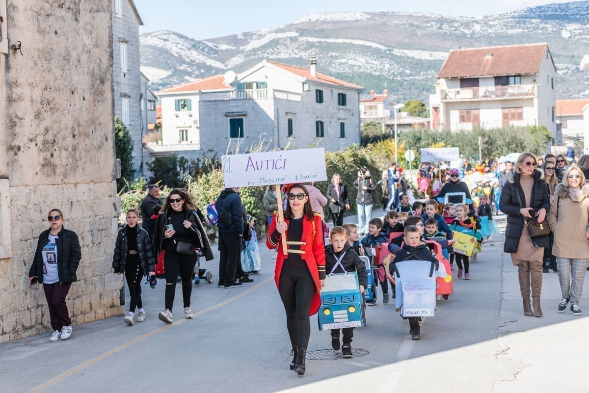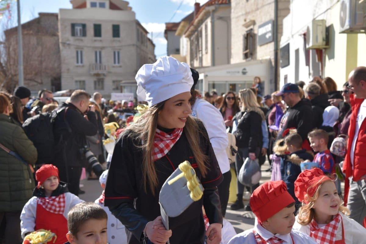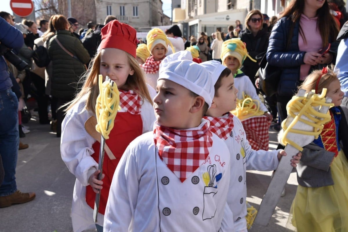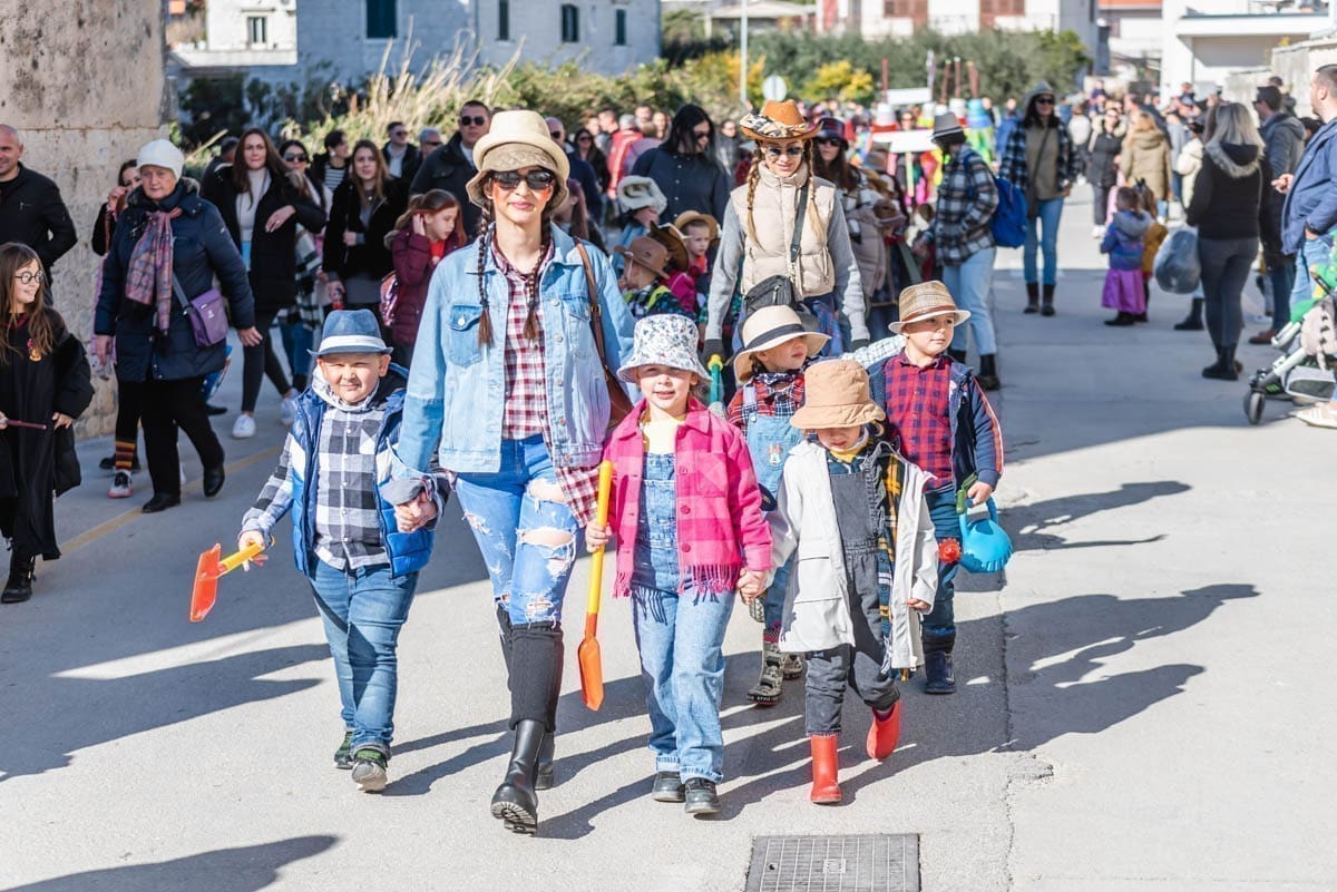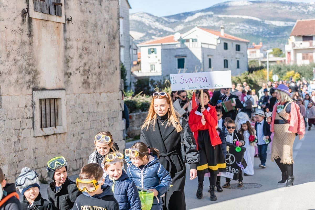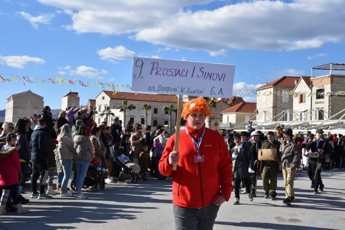 U povorci su se našla djeca iz kaštelanskih osnovnih škola i vrtića te skupa s tetama formirali oko 20 točki. Bilo je tu kuhara, likova iz bajki , autića, farmera, dokrorice Pliško, Masterchefa, Prosjaka i sinova te mnogih drugih. Na parkingu su ih dočekale maskote s kojima su mogli napraviti fotografije za pamćenje, a na dva mjesta bili su punktovi s face paintingom, gdje su zainteresirana djeca mogla oslikati svoja lica. Na kraju su djeci podijeljene krafne i sokiće te su se nakon okrepe nastavili zabavljati uz pjesmu i ples.