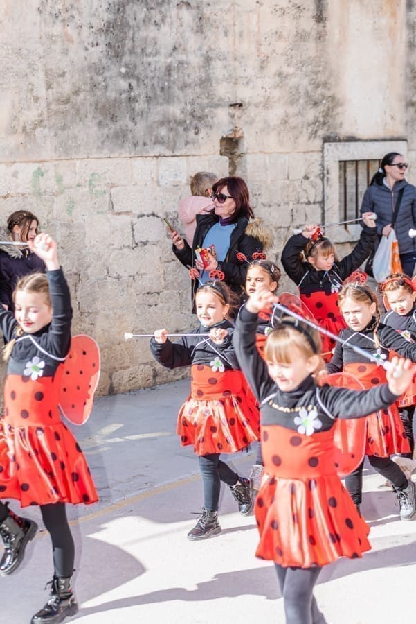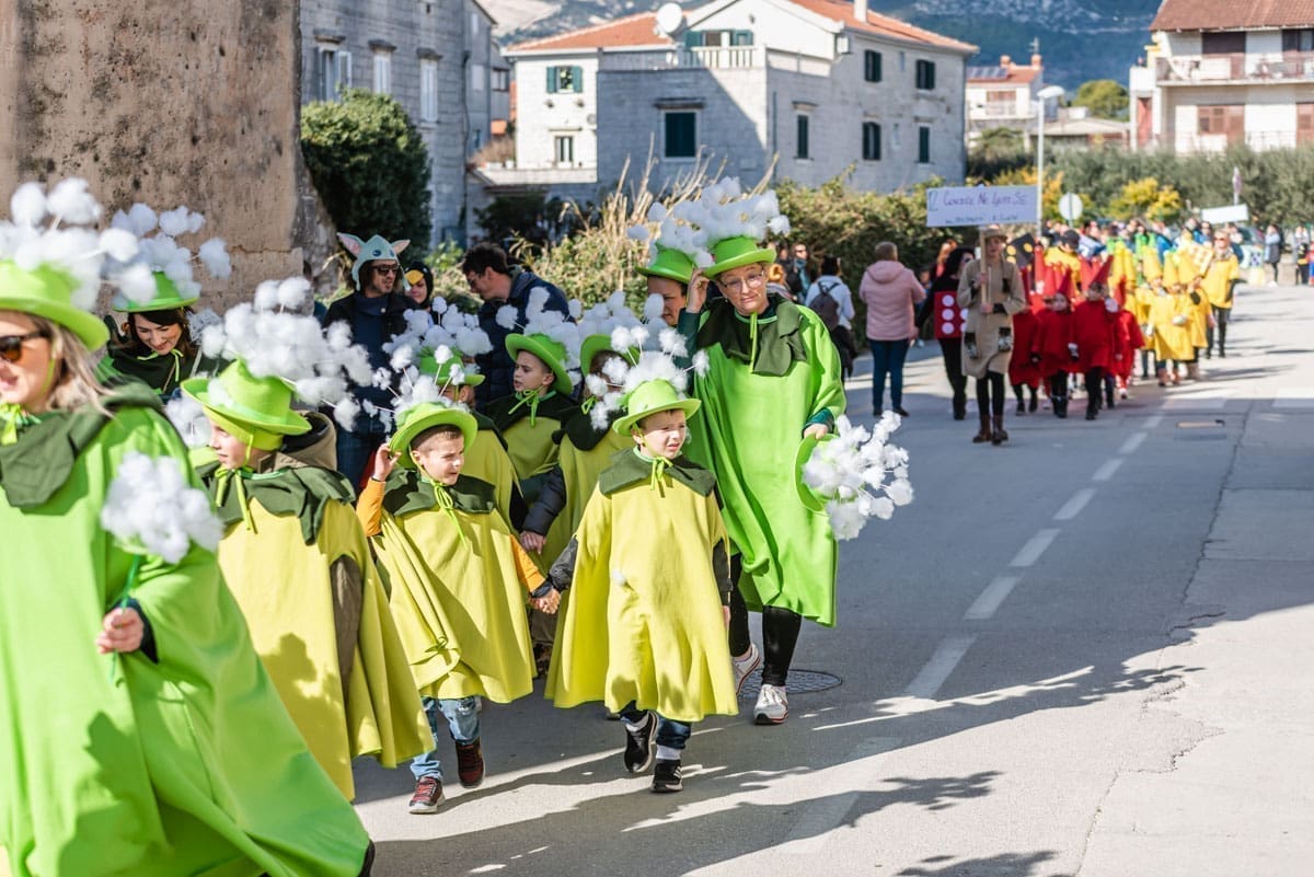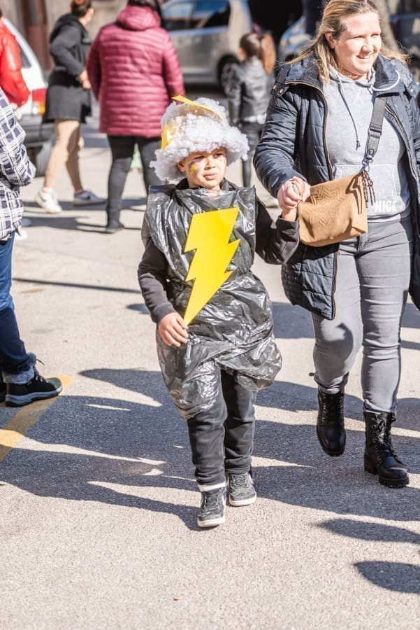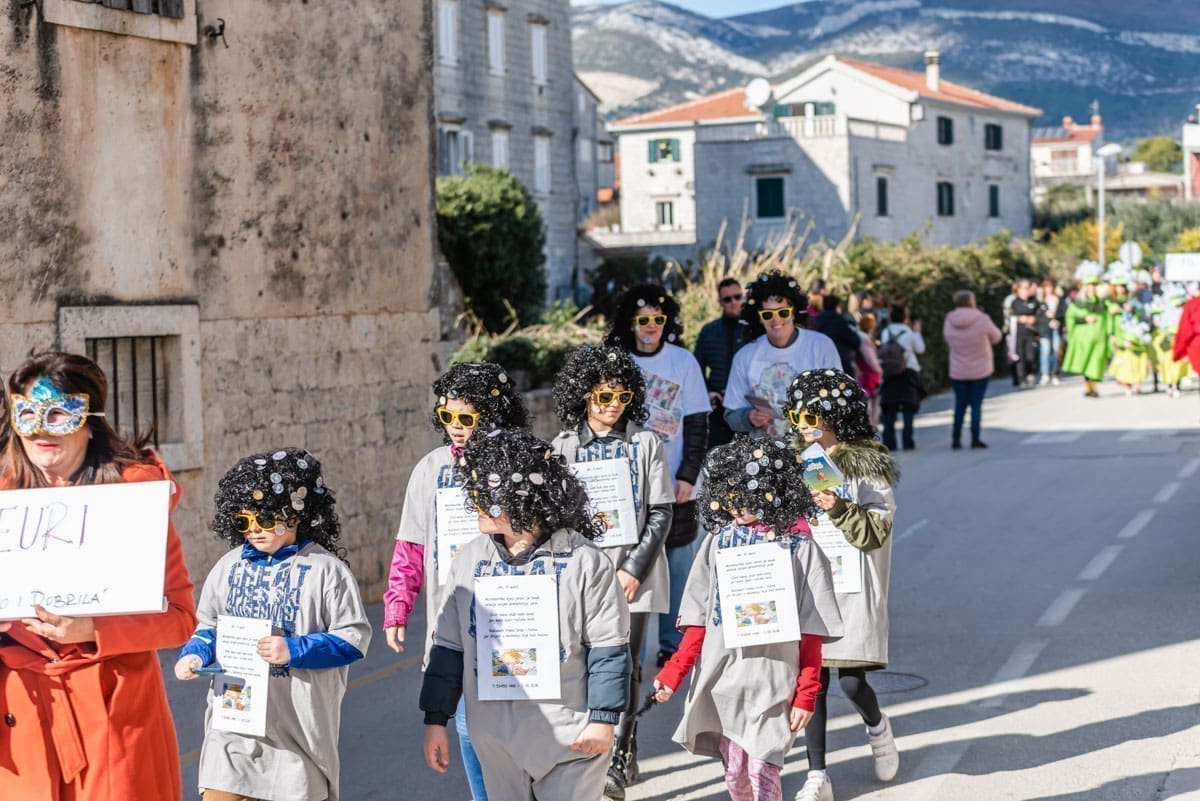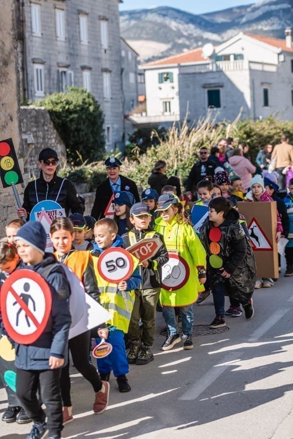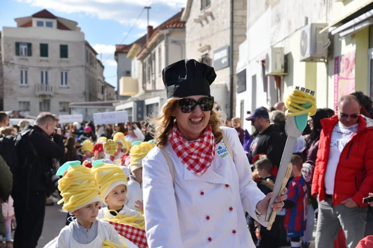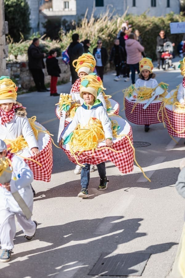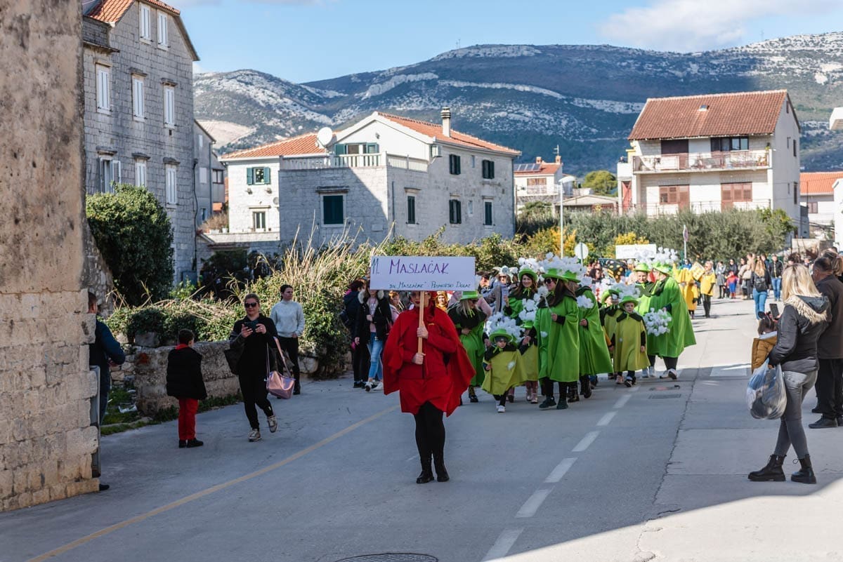 U povorci su se našla djeca iz kaštelanskih osnovnih škola i vrtića te skupa s tetama formirali oko 20 točki. Bilo je tu kuhara, likova iz bajki , autića, farmera, dokrorice Pliško, Masterchefa, Prosjaka i sinova te mnogih drugih. Na parkingu su ih dočekale maskote s kojima su mogli napraviti fotografije za pamćenje, a na dva mjesta bili su punktovi s face paintingom, gdje su zainteresirana djeca mogla oslikati svoja lica. Na kraju su djeci podijeljene krafne i sokiće te su se nakon okrepe nastavili zabavljati uz pjesmu i ples.