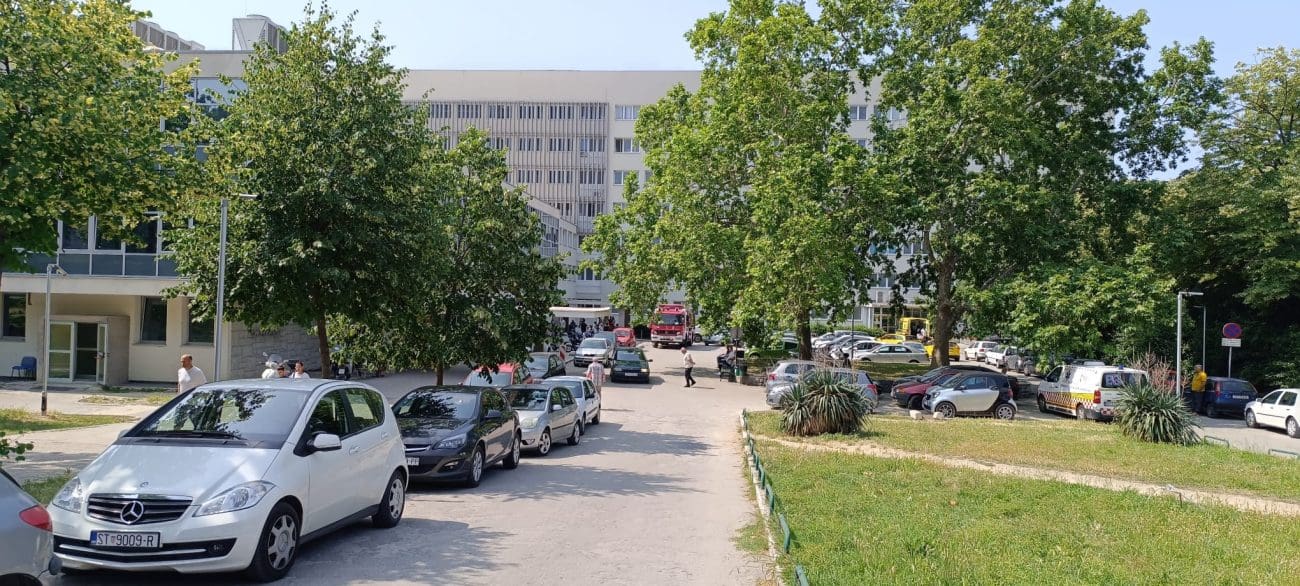 Požar je izbio oko 9:44 sati tijekom radova na prvom katu bolničke zgrade. Prema dostupnim informacijama, zapalili su se kartoni, što je izazvalo pojavu dima i potencijalnu opasnost za pacijente i osoblje. Na teren su odmah upućena četiri vatrogasna vozila s ukupno 14 vatrogasaca iz Javne vatrogasne postrojbe Split i Dobrovoljnog vatrogasnog društva Split, koji su stigli u vrlo kratkom roku i spriječili širenje vatre na ostale dijelove objekta.