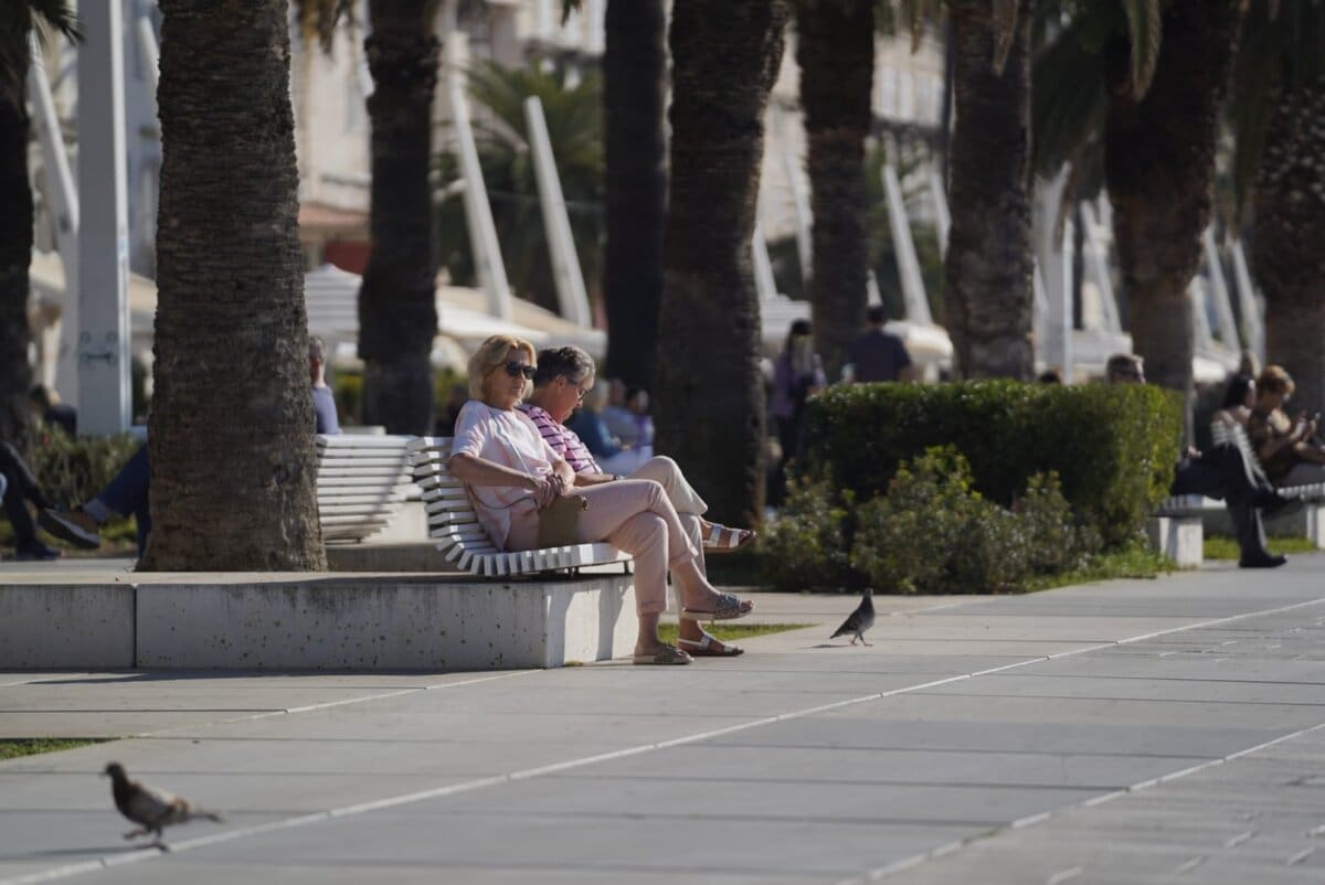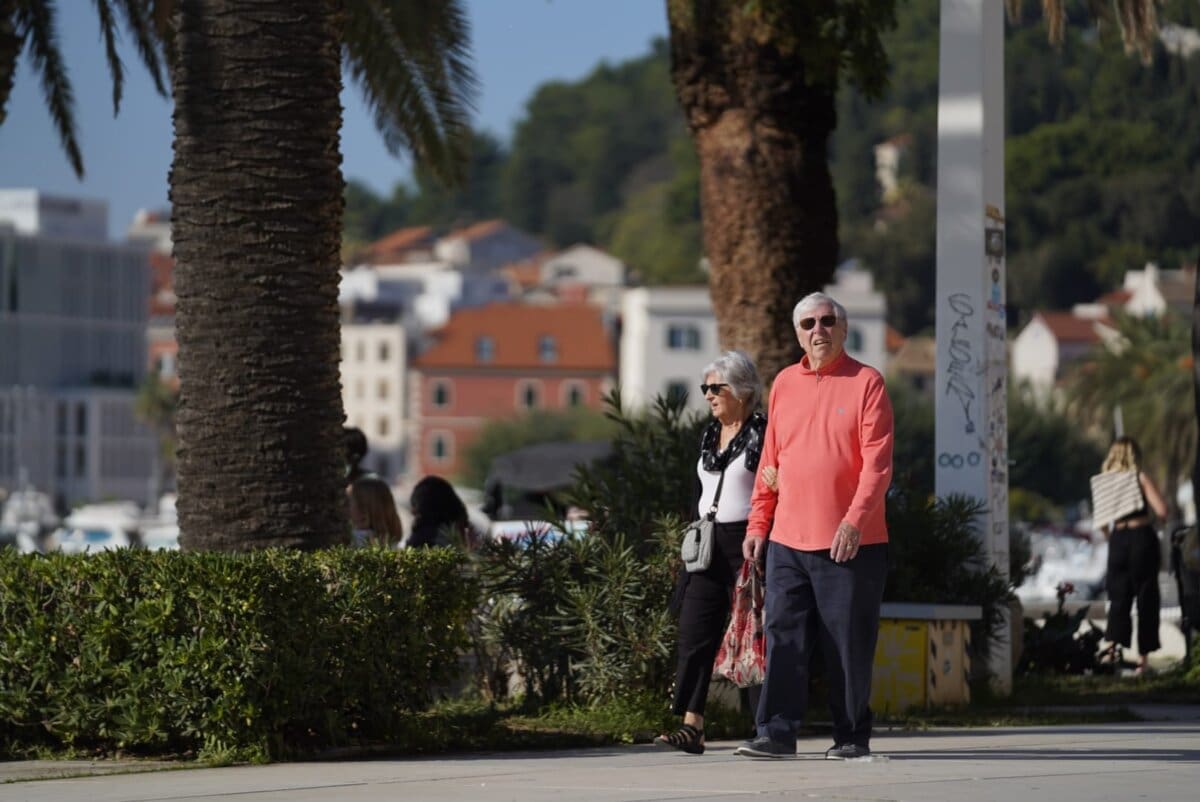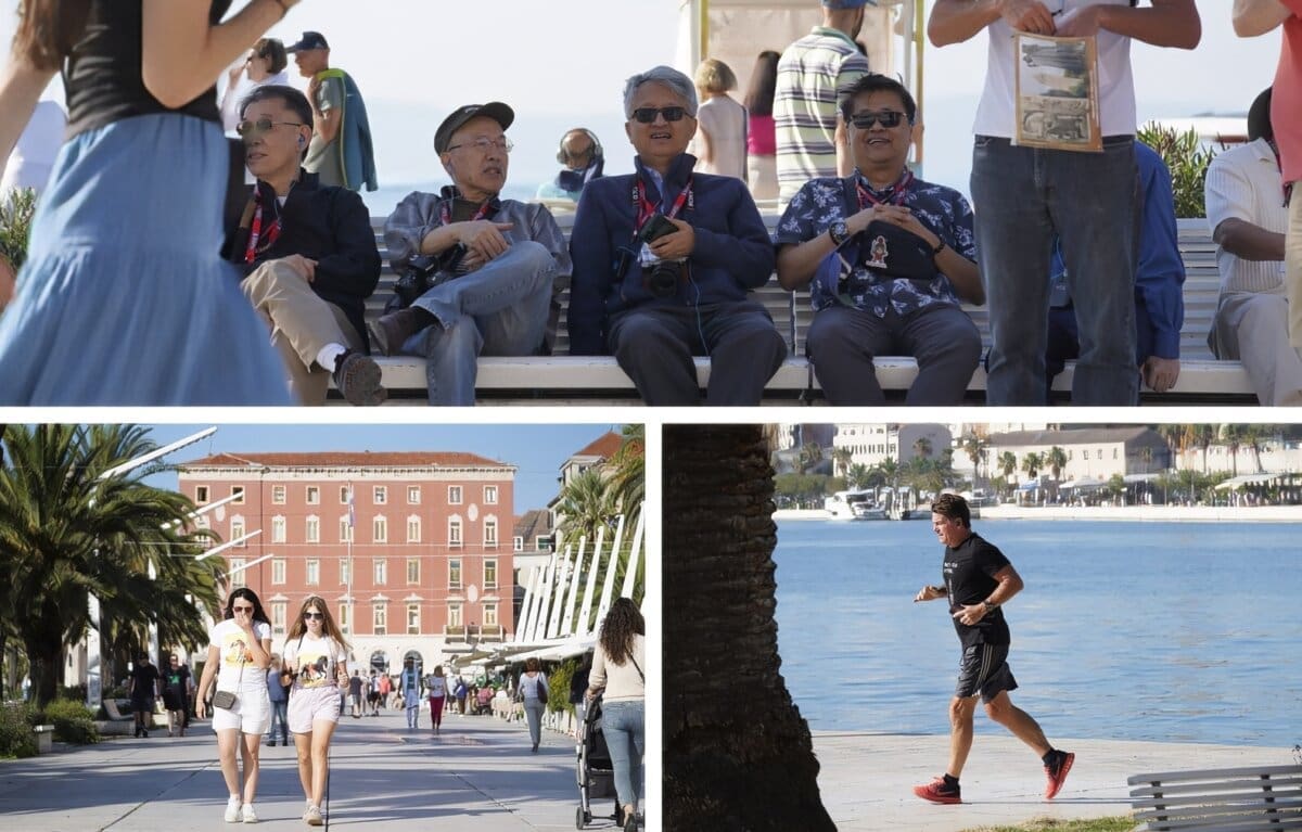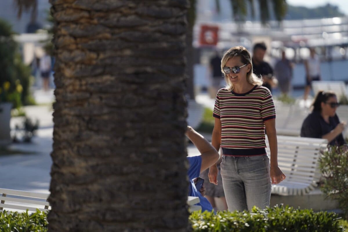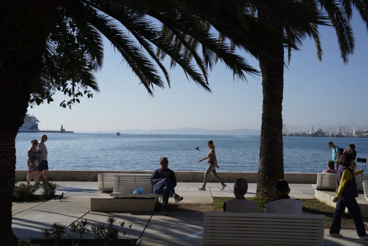 Splitska Riva, najpoznatija šetnica u gradu pod Marjanom, i ovog je jutra bila puna života. Iako je radni dan, lijepo vrijeme izmamilo je mnoge Splićane, ali i turiste, na đir. Ugodna temperatura između 20 i 22 stupnja Celzijeva, uz sunce koje je neprestano grijalo, stvorila je idealne uvjete za uživanje na otvorenom.