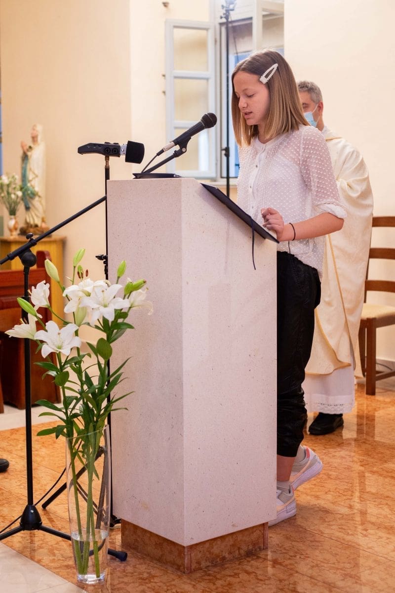 Na kraju je svoje propovijedi obrativši se prvopričesnicima kazao: „Danas, dragi prvopričesniče Gospodin želi čuti tvoje: Od danas hodimo skupa. Službenica Božja Magdalena od Isusa izrekla je jednu jednostavnu rečenicu koja govori mnogo: 'Bog me uzeo za ruku i slijepo sam ga slijedila'. Tako i vi. Neka vas vodi, a vi ga slijedite. S pouzdanjem.“
