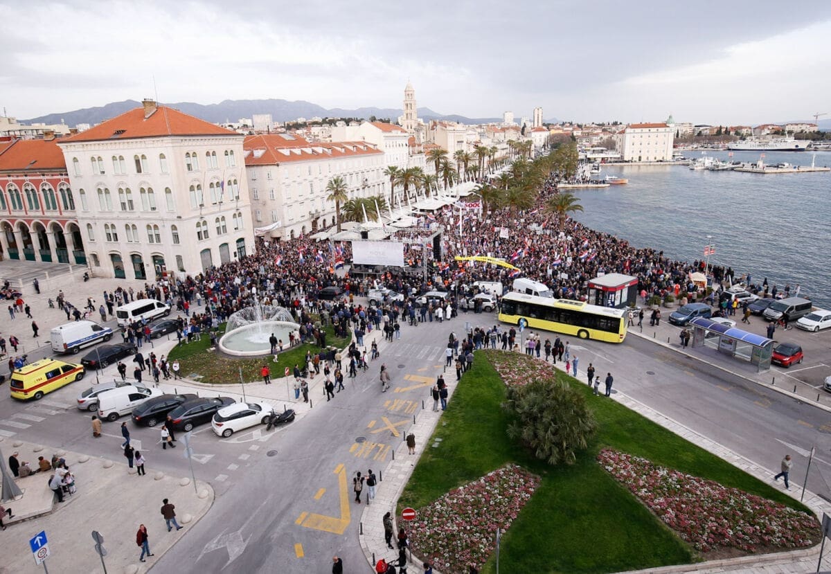 Nepreglednu masu ljudi teško je bilo uhvatiti u objektivu s Rive, pa se naš fotoreporter popeo na zvonik crkve svetog Frane i fotografirao okupljene prosvjednike. Ukoliko bude dilema koliko je prosvjednika bilo na prosvjedu ove fotografije bi mogle dati svoj doprinos u brojanju prosvjednika.