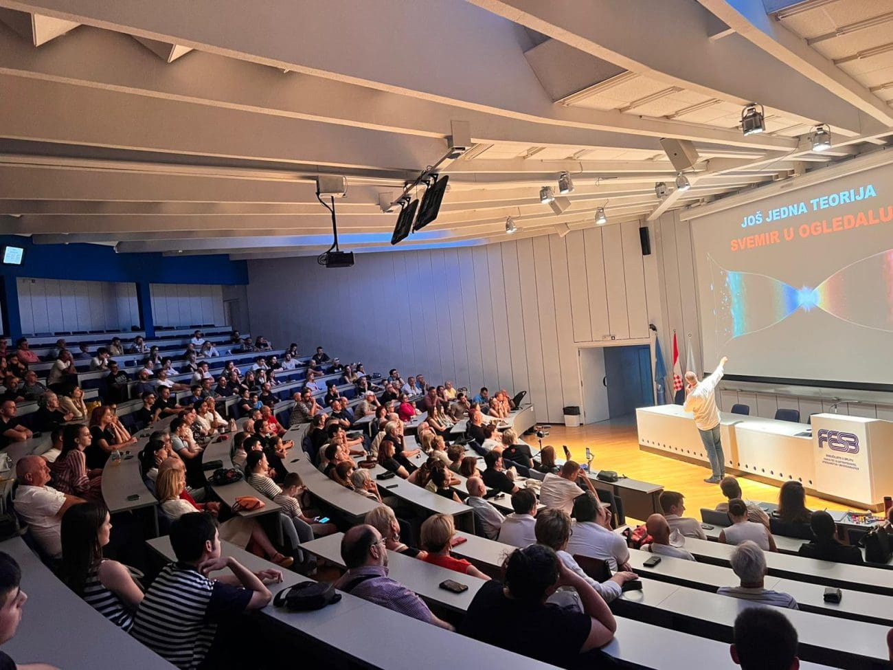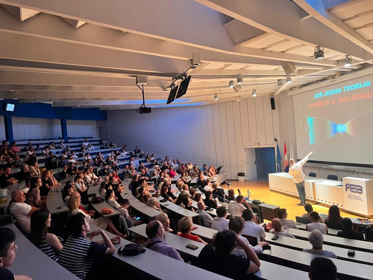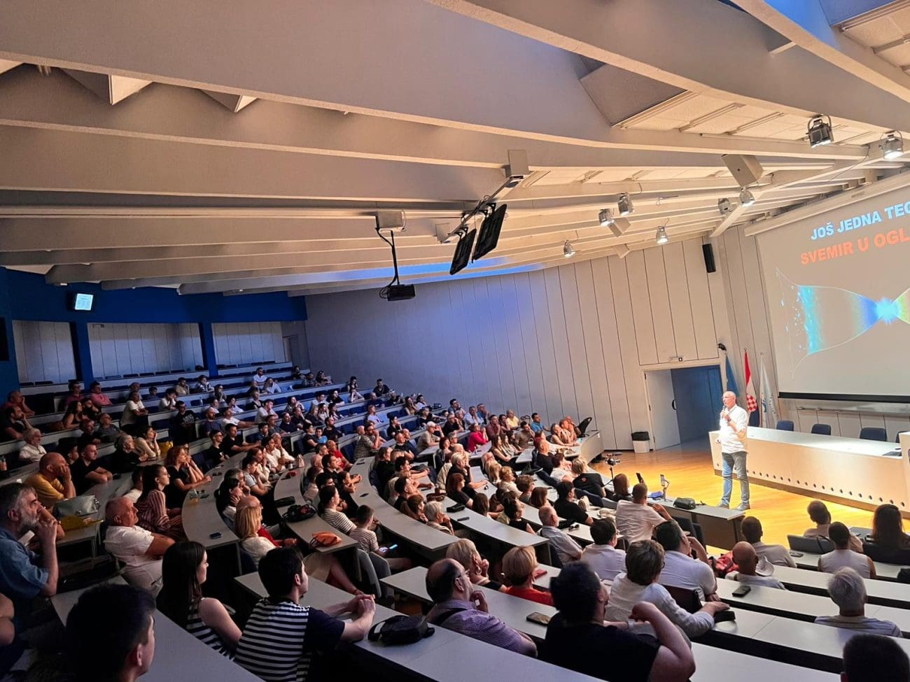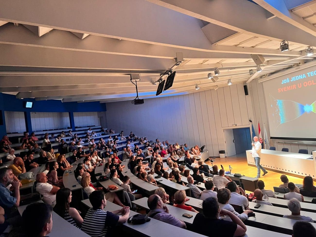Dvorana je ispunjena pretežno mladima i studentima, koji sa zanimanjem prate Puljkove izlaganja, što pokazuje veliki interes nove generacije za znanost i pitanja koja oblikuju budućnost čovječanstva.