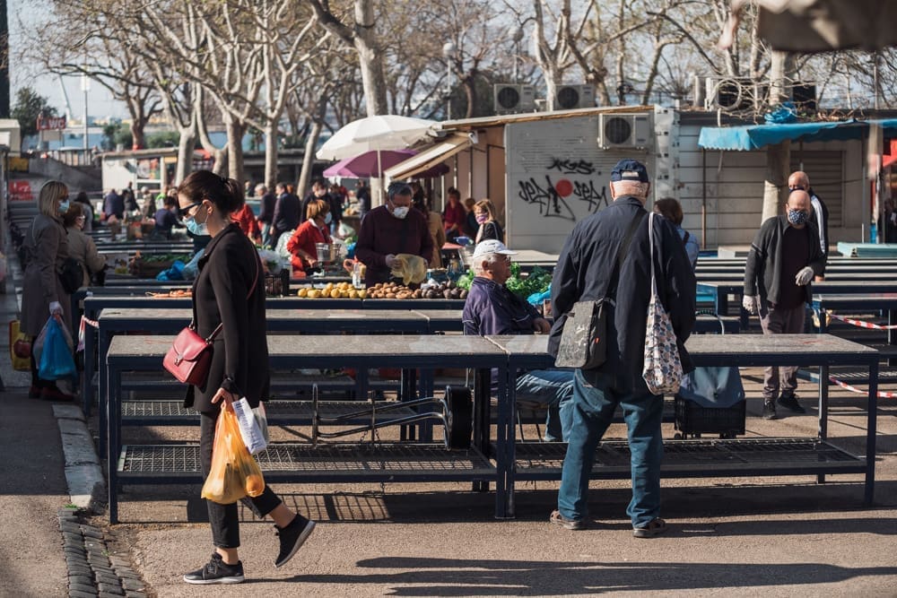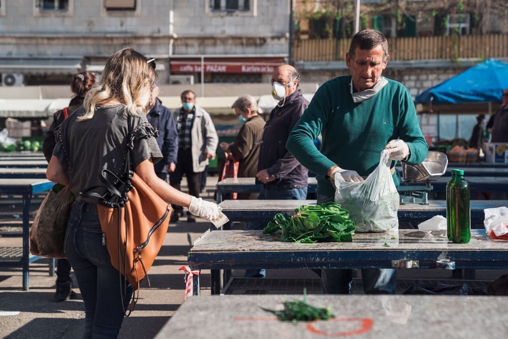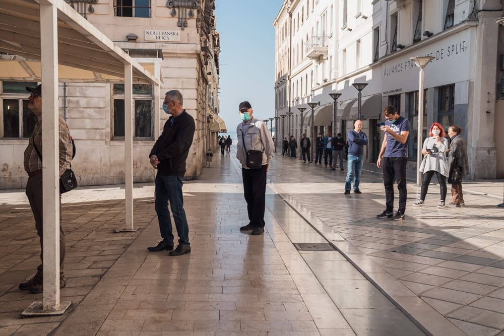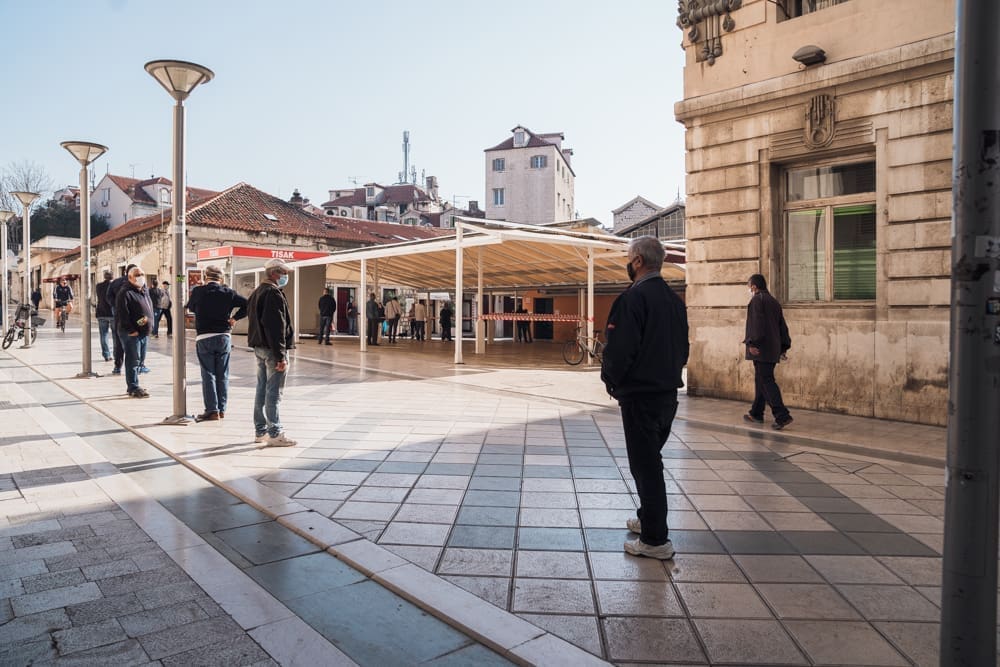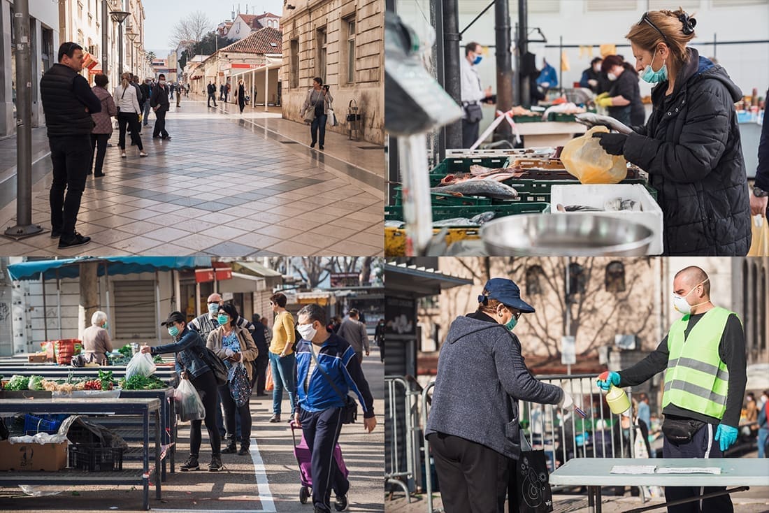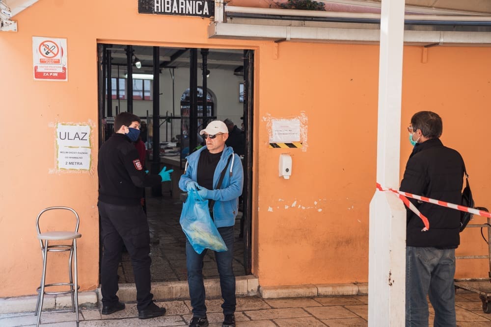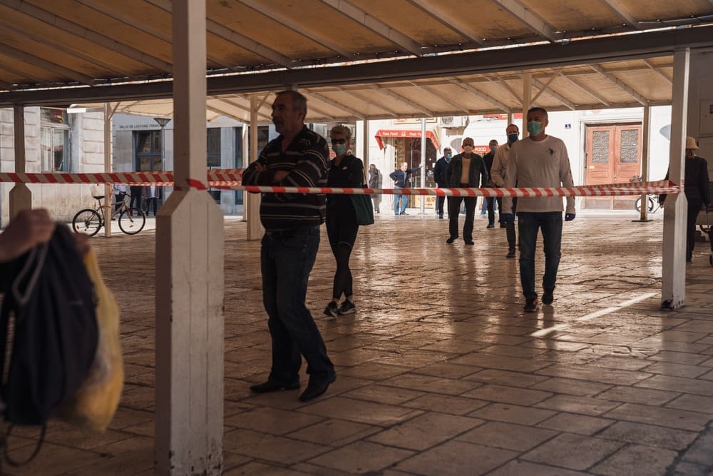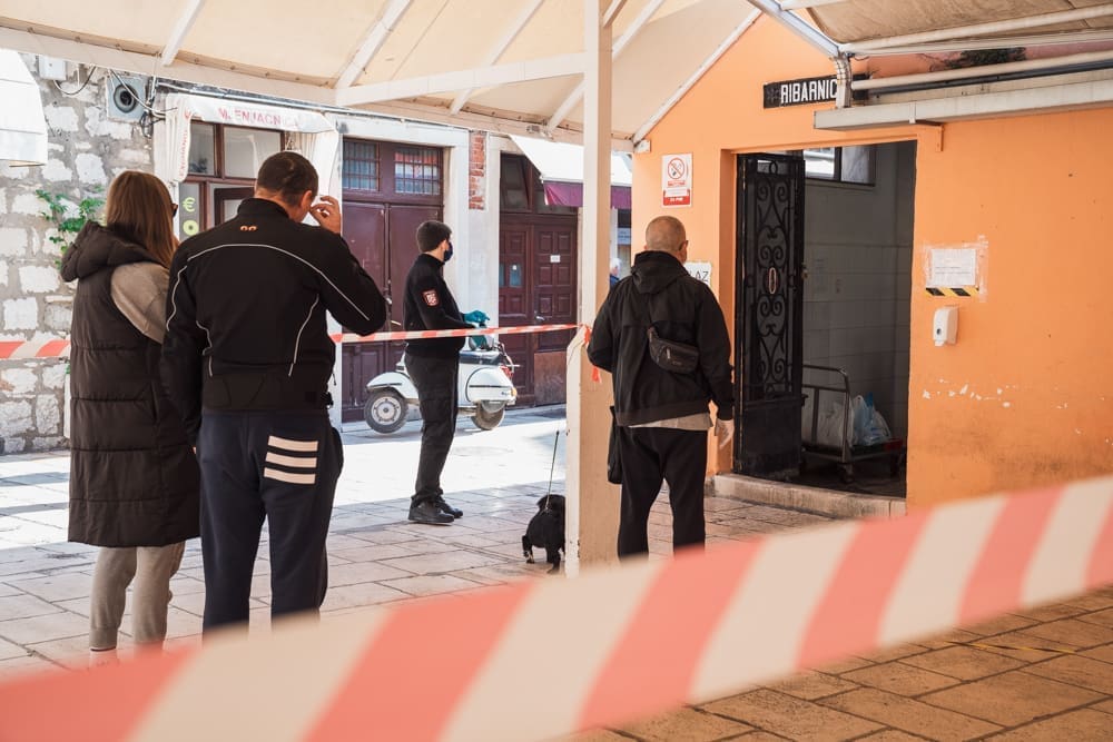 Ispred peškarije na Marmontovoj nesvakidašnja scena, kao što uostalom sve scene ovih dana - rijetka rijeka ljudi razlijeva se iz peškarije niz Marmontovu skoro do rive. Ljudi čekaju red, mirni su i uredni, drže razmak. Iako na prvi pogled djeluje obeshrabrujuće, čekanje ipak ne traje dugo, tek oko pet minuta.