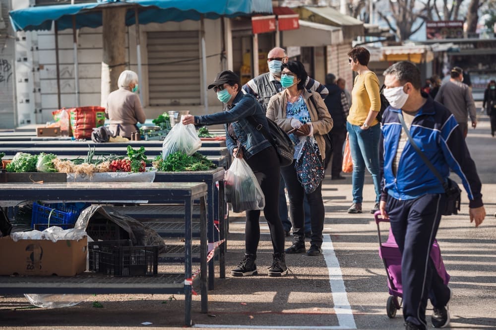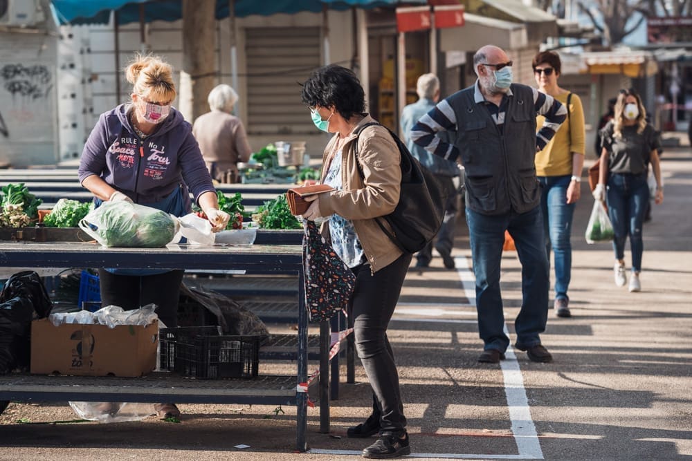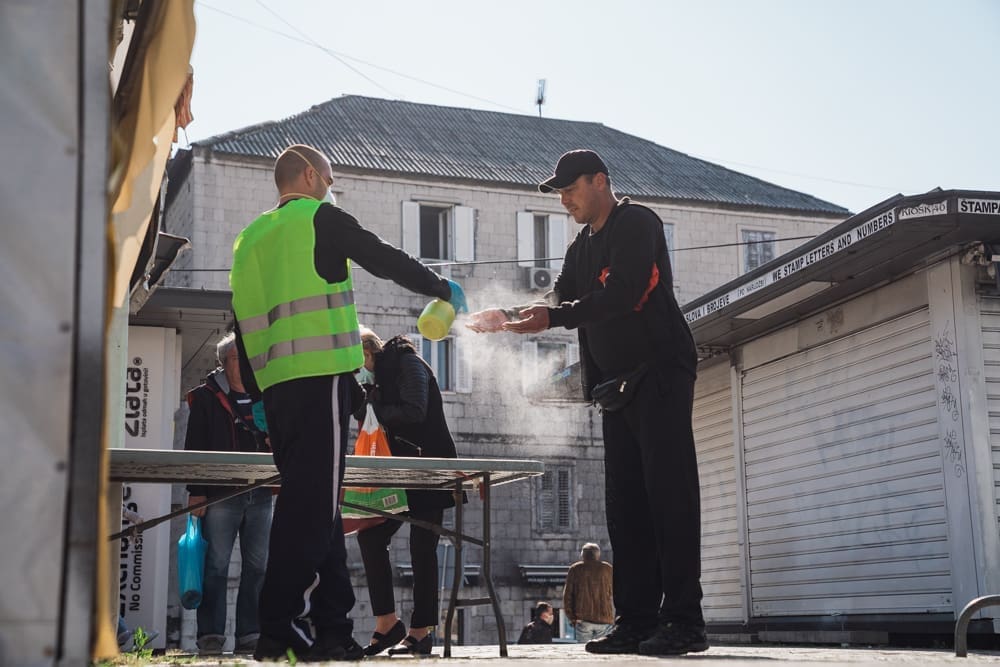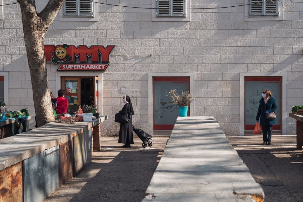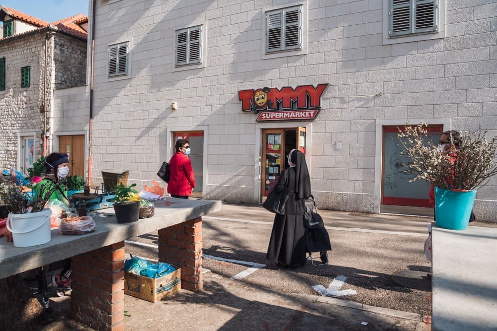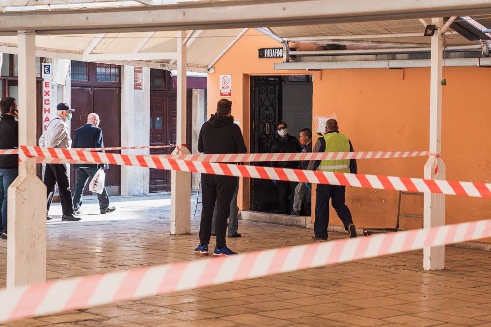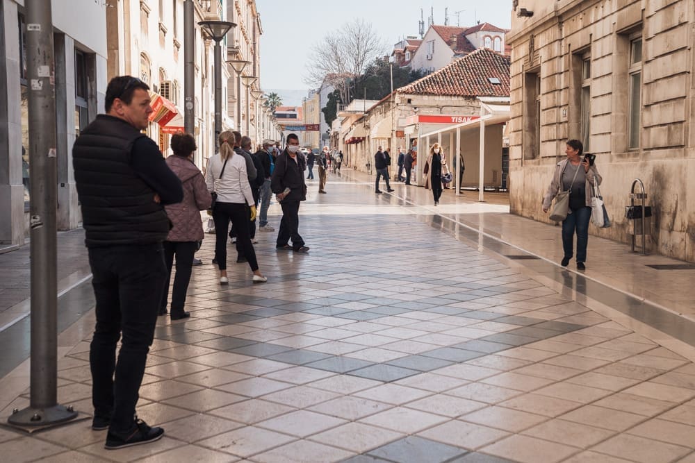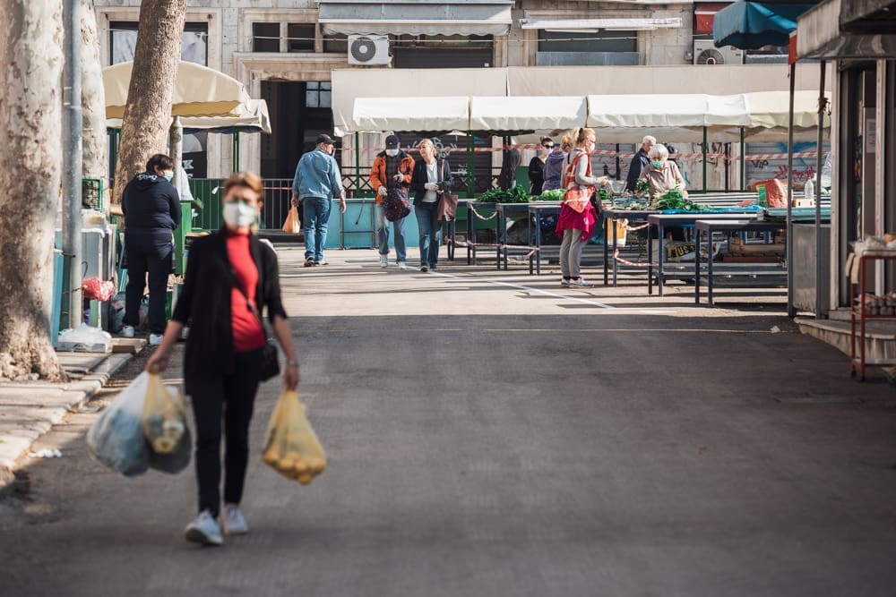 Ispred peškarije na Marmontovoj nesvakidašnja scena, kao što uostalom sve scene ovih dana - rijetka rijeka ljudi razlijeva se iz peškarije niz Marmontovu skoro do rive. Ljudi čekaju red, mirni su i uredni, drže razmak. Iako na prvi pogled djeluje obeshrabrujuće, čekanje ipak ne traje dugo, tek oko pet minuta.