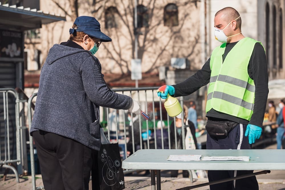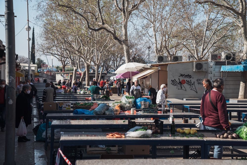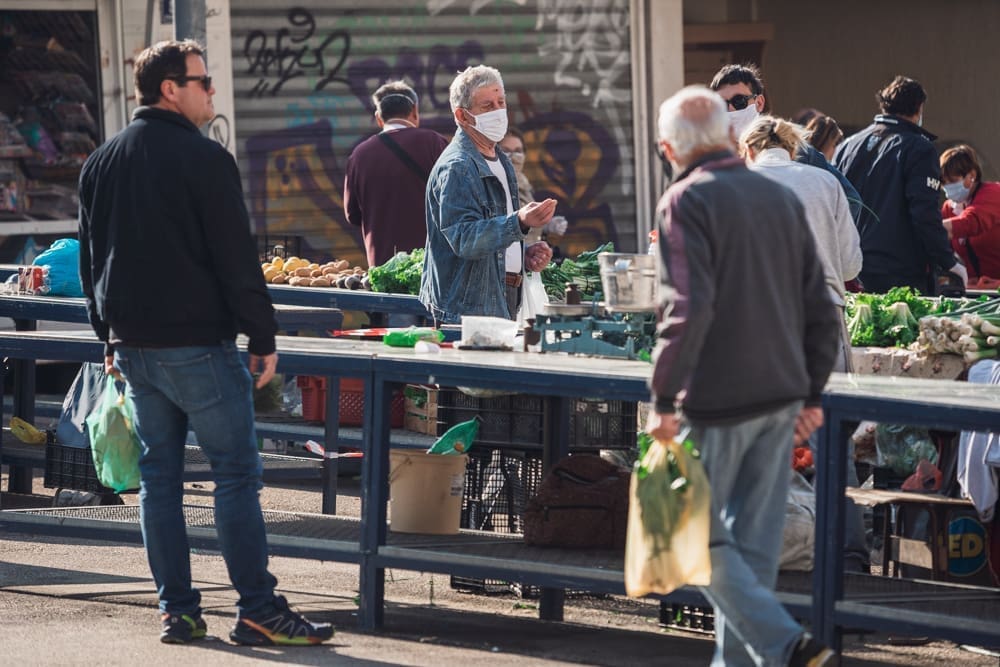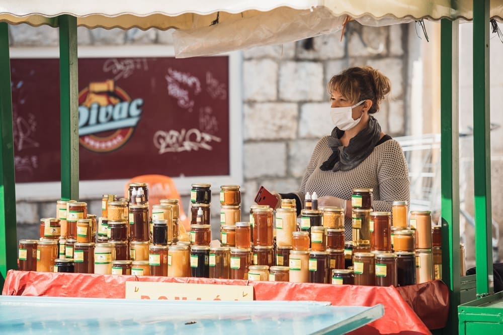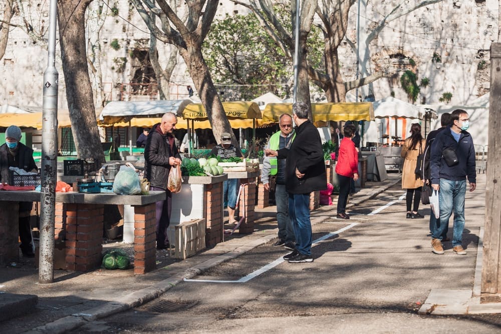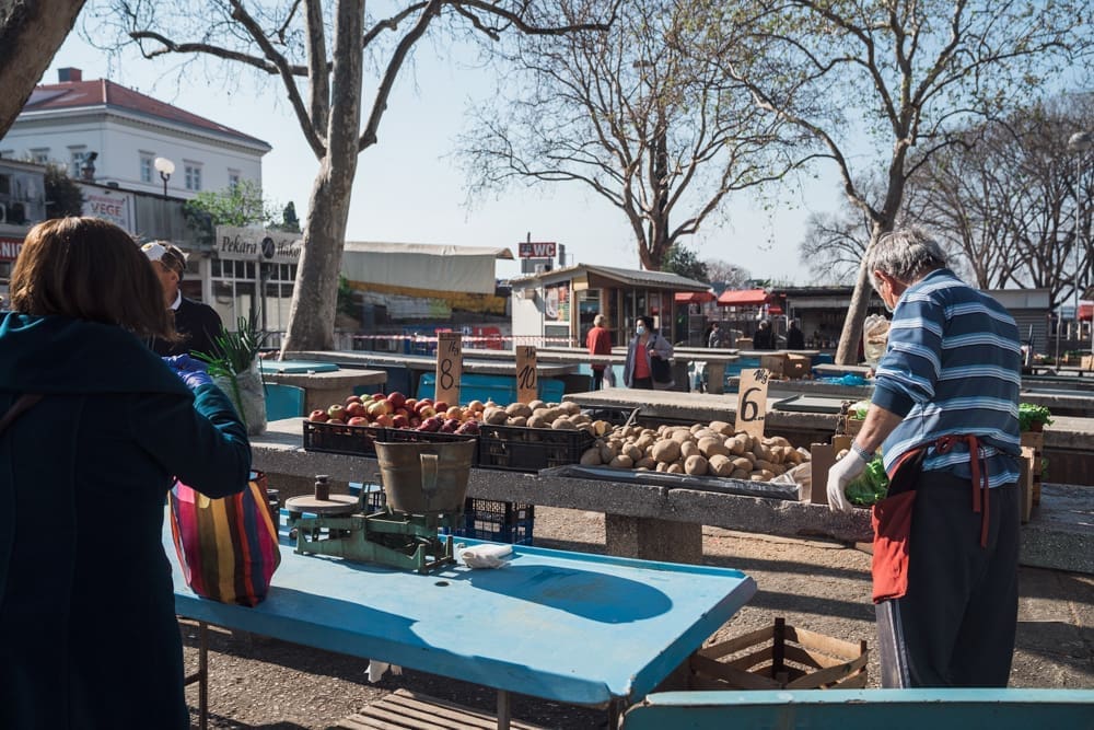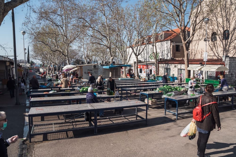 Pičimo dalje na glavni pazar, očekujući mravinjak ljudi - ipak je to centralni opskrbni punkt splićana, tek drugi dan u pogonu, za pretpostaviti je da će ljudi nahrupiti. Pretpostavka je pogrešna - iako ljudi cirkuliraju, prodavača nema puno. Na ulazu također zaštitari, vode računa da sve prođe u redu, dezinficiraju posjetitelje. Nije, kažu, bilo nikakvih ekscesa, nikakvih problema, ljudi su korektni, drže distancu, ne žele ni oni riskirati zarazu. U jednom trenutku prolazi dvoje policajaca, redovno obilaze, paze na red. Ne dolazi u obzir da ih fotografiram, ni slučajno! Niti s leđa, ni nikako.