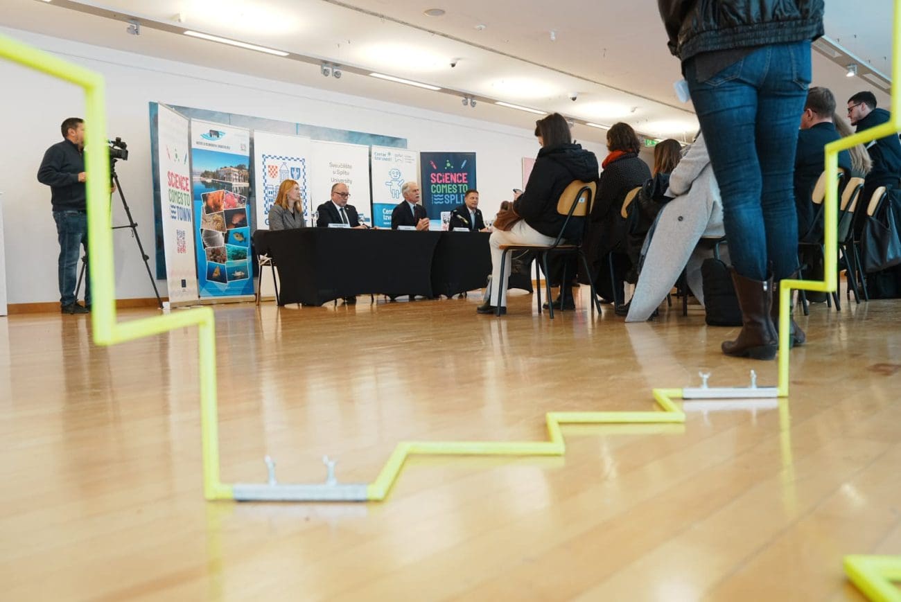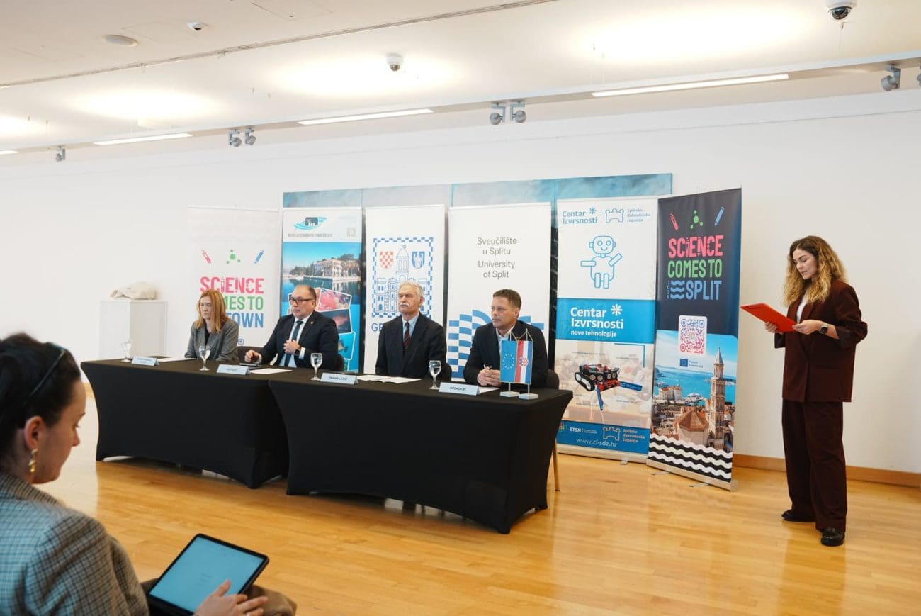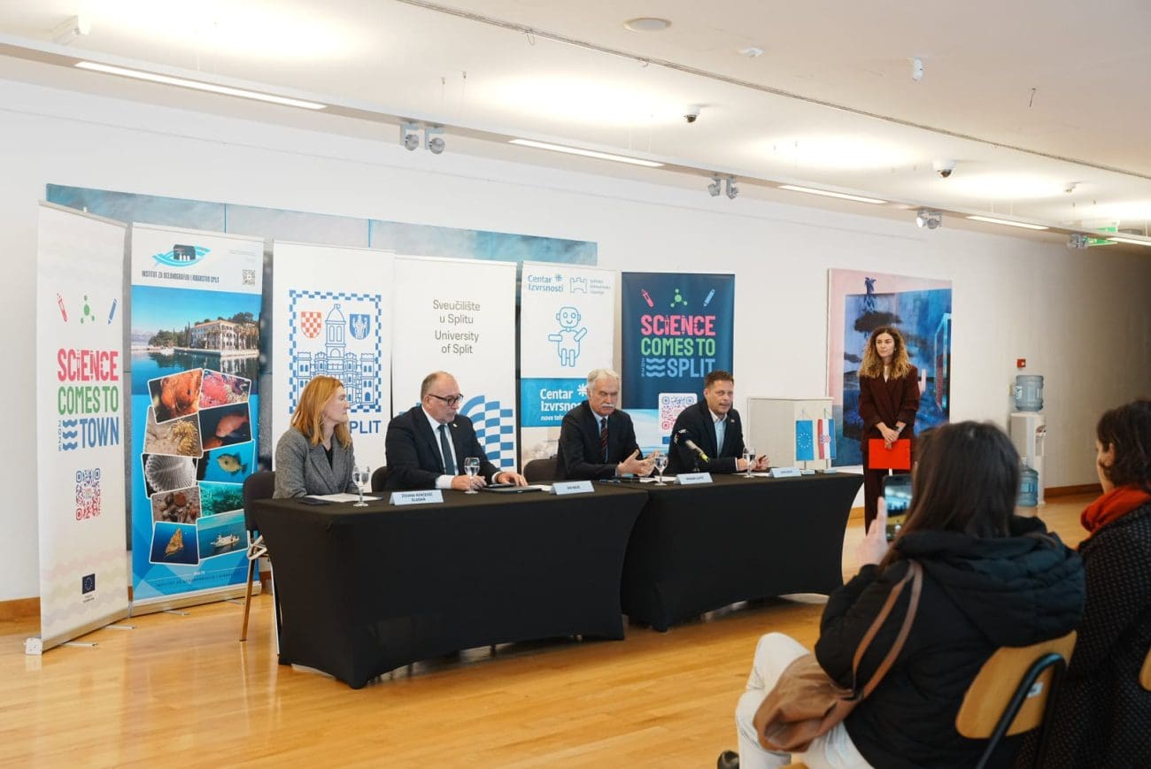 Science Comes to Town, međunarodni projekt financiran kroz program Obzor Europa, s ciljem povezivanja znanosti i građana kroz godinu dana javnih događanja i interaktivnih aktivnosti u tri europska grada - Splitu, Kielu i Brestu, predstavljen je u četvrtak 15. siječnja na tiskovnoj konfrenciji održanoj u Sveučilišnoj galeriji. O važnosti ove inicijative govorili su prof. dr. sc. Dragan Ljutić, rektor Sveučilišta u Splitu, Ivo Bilić, zamjenik splitskog gradonačelnika, dr. sc. Živana Ninčević Gladan, ravnateljica Instituta za oceanografiju i ribarstvo u Splitu i Ivica Zelić, ravnatelj Centra izvrsnosti Splitsko-dalmatinske županije.