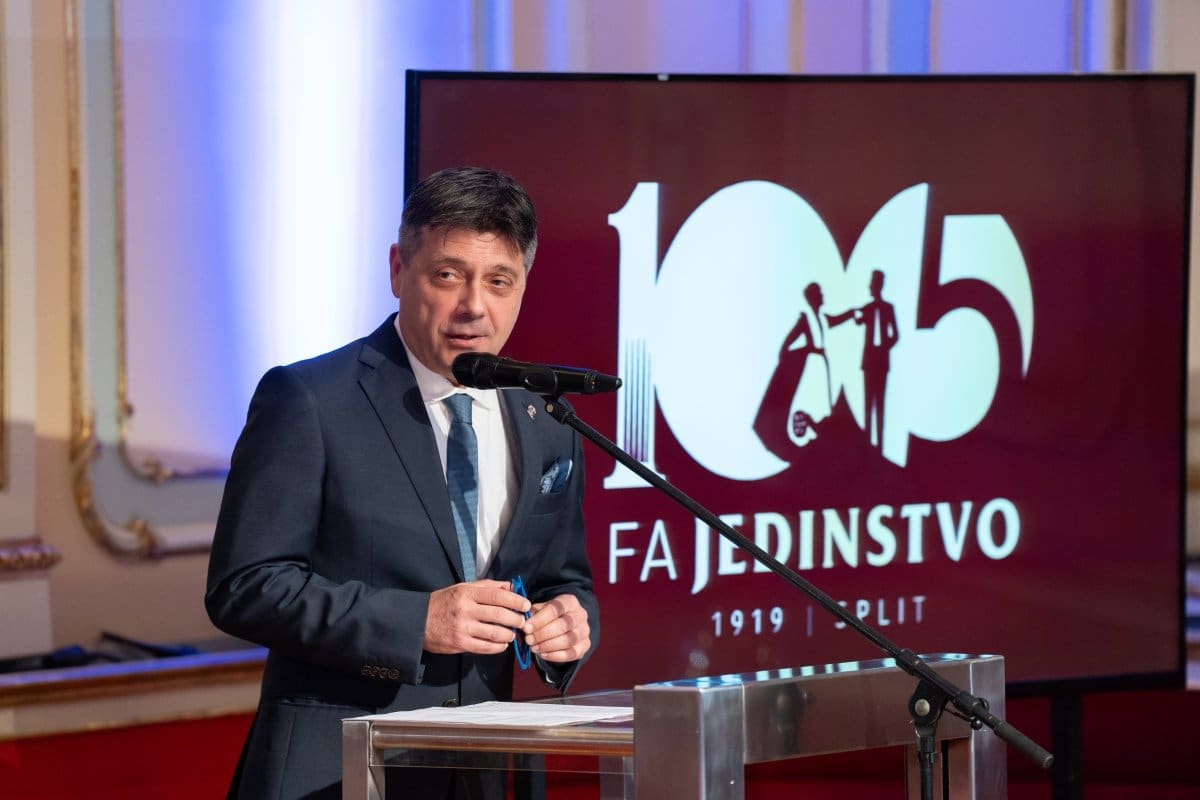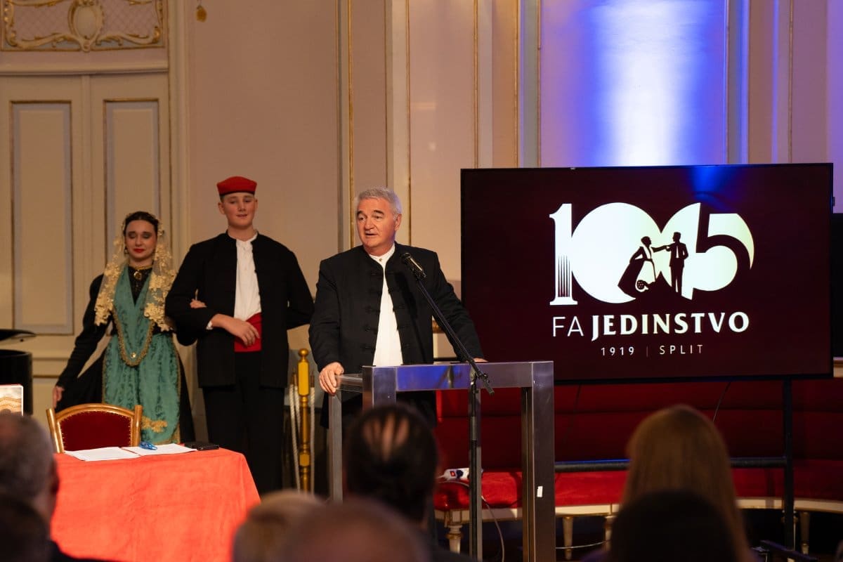 U besprijekornom ambijentu foyera HNK i uz prekrasne izvedbe mezzosopranistice Terezije Kusanović uz klavirsku pratnju Zorana Velića, svečanosti su nazočili mnogi članovi Jedinstva svih generacija te brojni uglednici iz kulturnog i društvenog života. Uz prigodne govore predsjednika Jedinstva Emina Sarajlića te gradonačelnika Ivice Puljka i župana Blaženka Bobana, evocirane su uspomene iz povijesti Jedinstva, ali se i podsjetilo na recentne uspjehe najdugovječnije splitske udruge tradicijske kulture. Početak akademije emotivno je bio posvećen uspomeni na dugogodišnju predsjednicu Jedinstva nedavno preminulu gospođu Ružicu Mikačić nakon čega je njoj, ali i svim preminulim članovima Jedinstva odana dužna počast minutom šutnje.