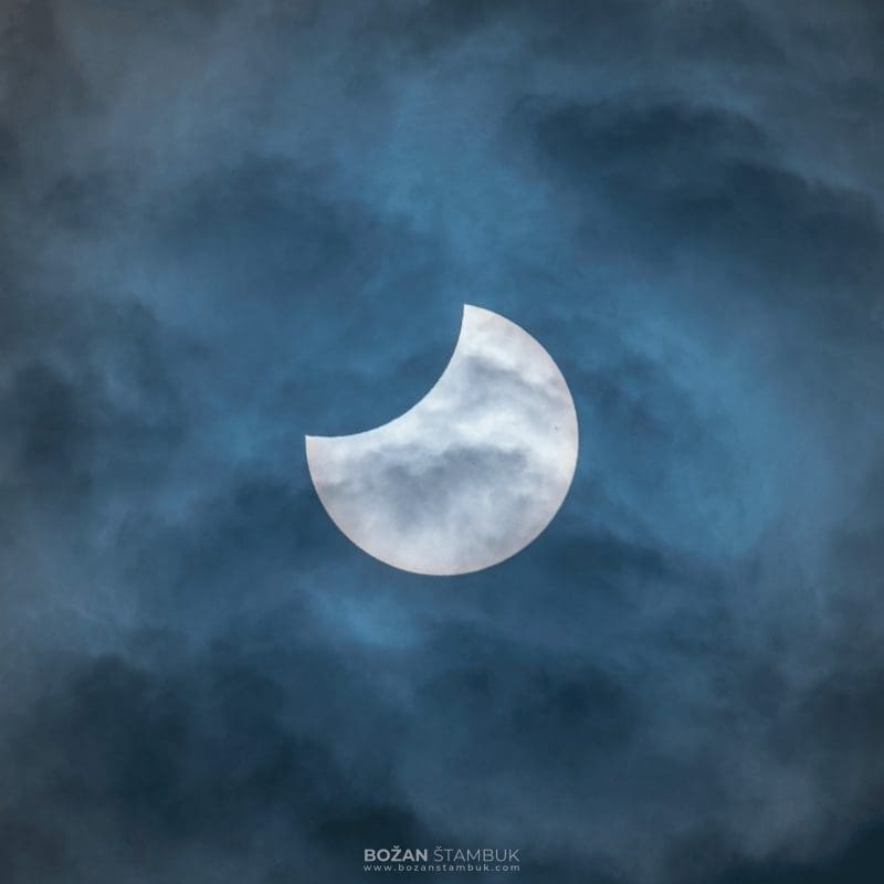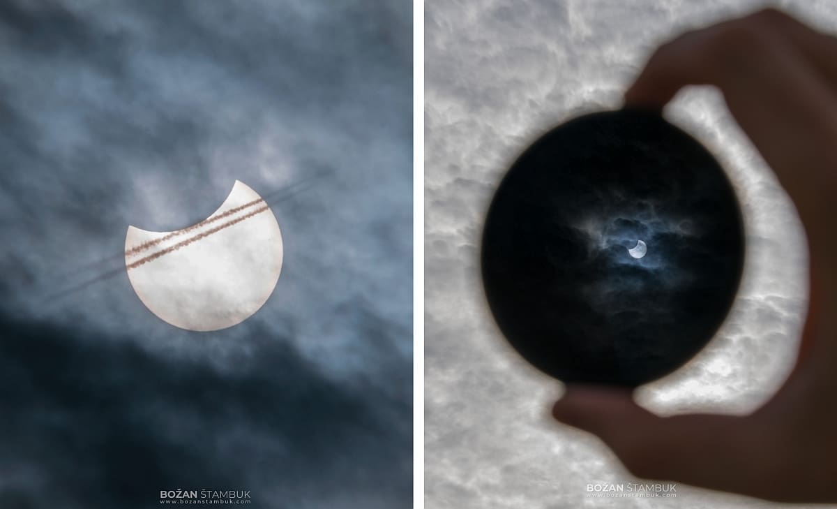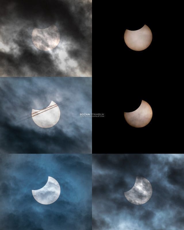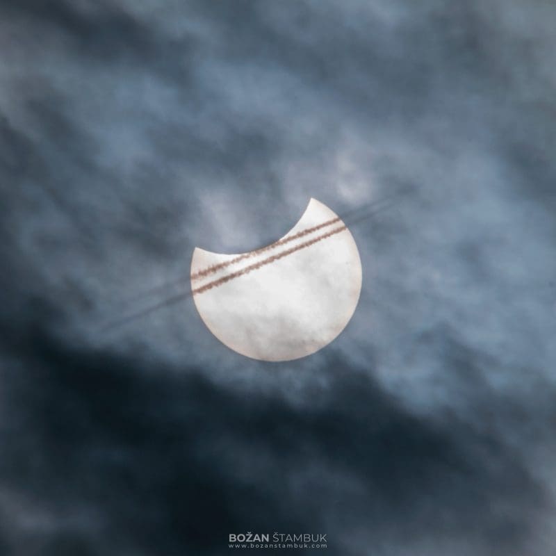 "Djelomična pomrčina Sunca 25.10.2022. snimljena s Brača. Po fazama, koliko su oblaci dozvolili. U niti jednom trenu nije bilo potpuno vedro, tako da nažalost nemam 'čisti' snimak, ali šta je tu je, pjege se vide. Daju i oblaci malo šuga, a ovaj avion je bi ko naručen.